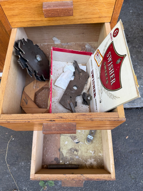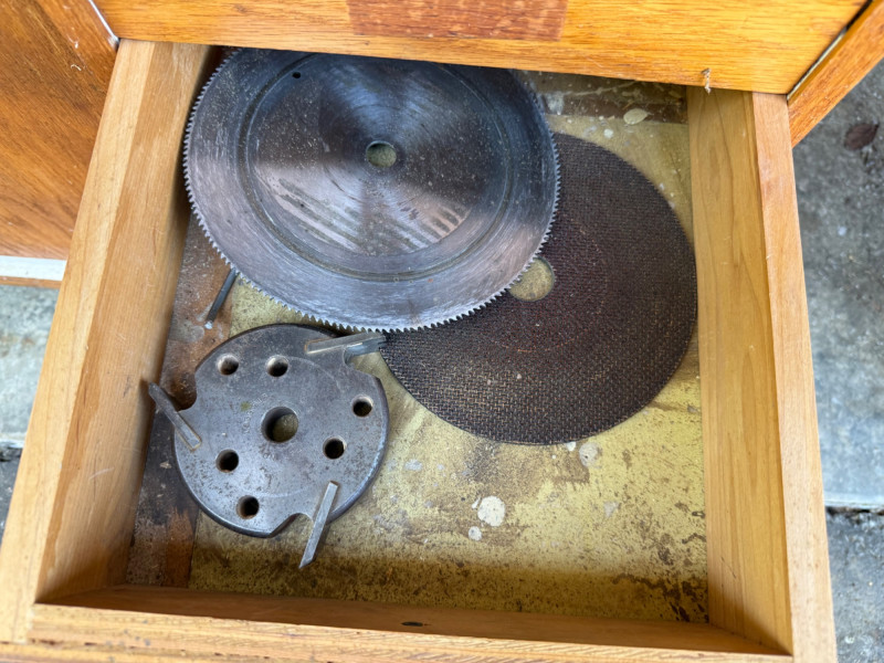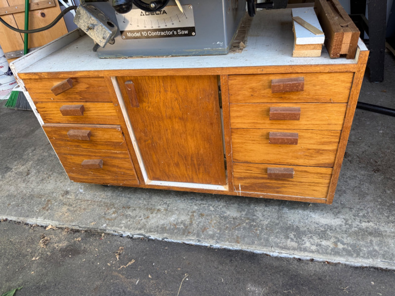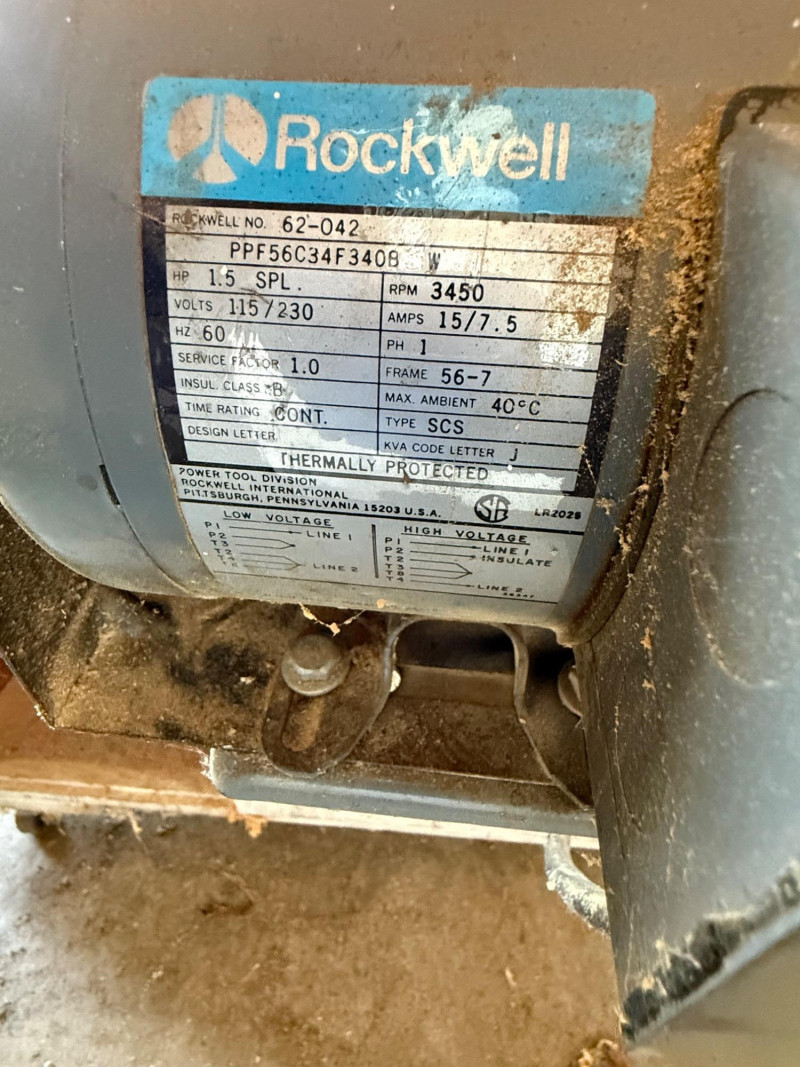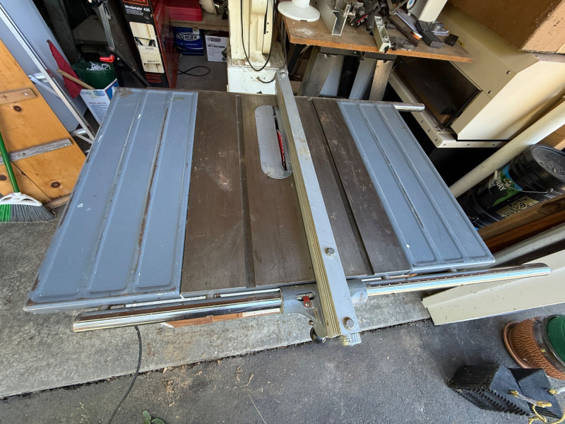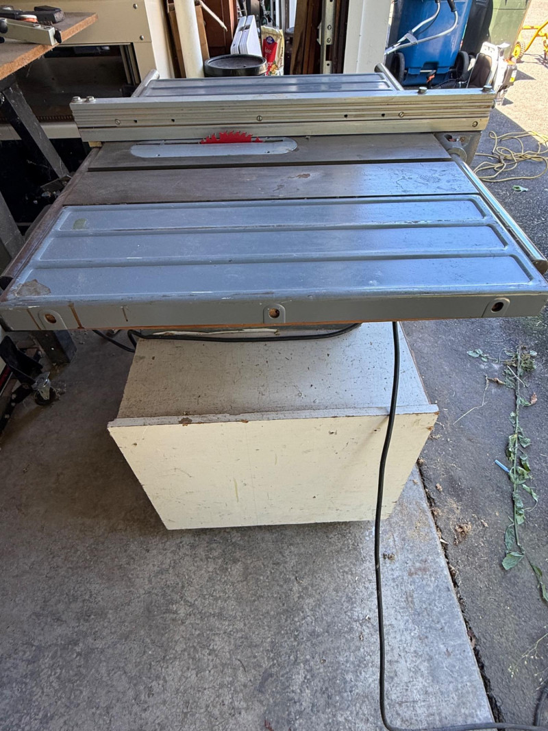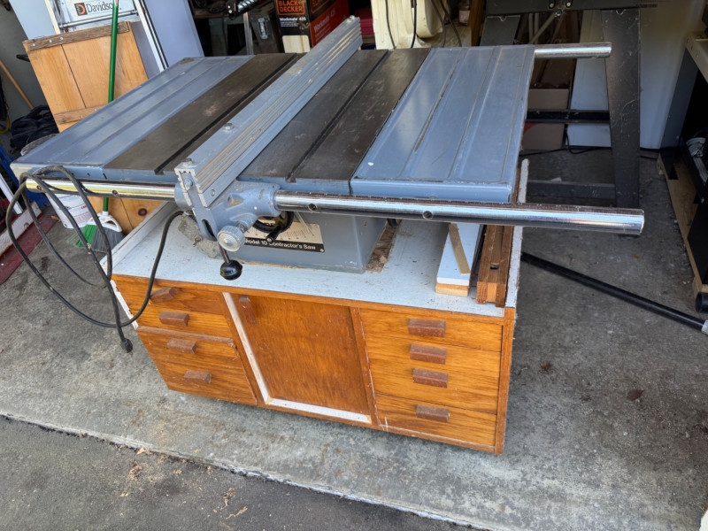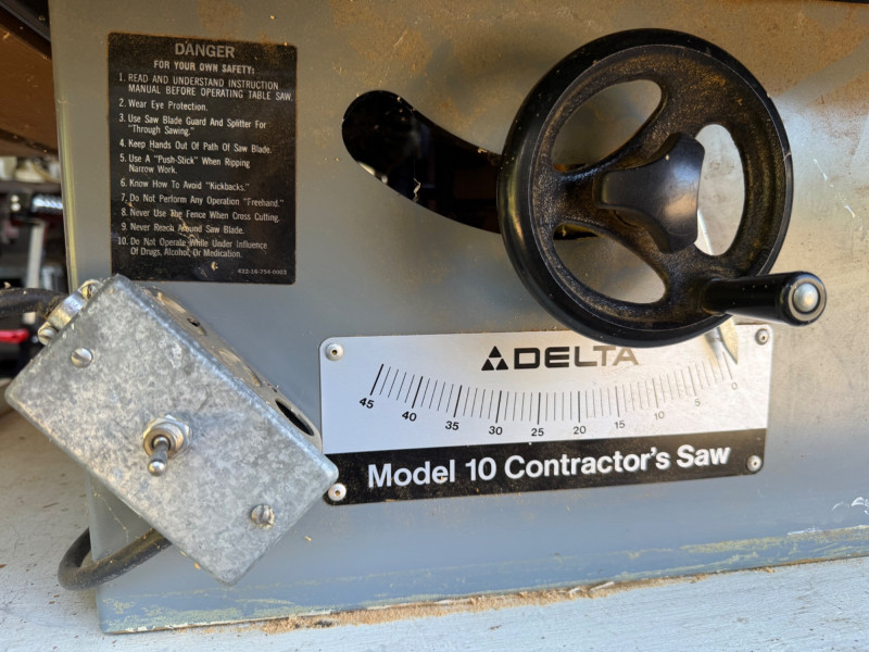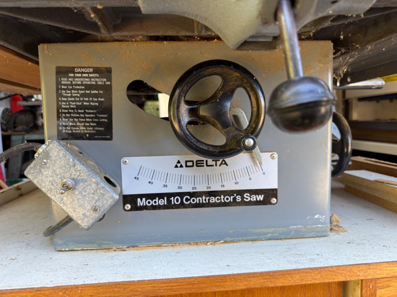 Make & Model: Manufacturer: Delta Model: Model 10 Contractor’s Table Saw Features & Components: Heavy-duty cast iron table for stability and precision Adjustable rip fence for accurate cuts Tilting arbor for bevel cuts Integrated dust collection port Sturdy steel base with locking casters for mobility Blade guard and anti-kickback pawls for safety 10-inch blade capacity with extension wings for larger workpieces Dimensions: Length: 48 inches Width: 44 inches Height: 39 inches Condition: Appears to be in used but functional condition Minor surface wear consistent with workshop use All major components present; motor, blade, fence, and safety features intact Easy load location