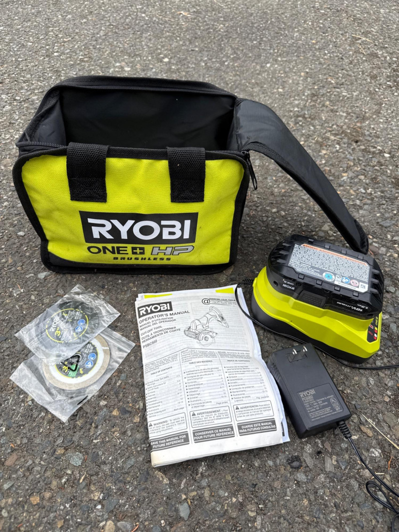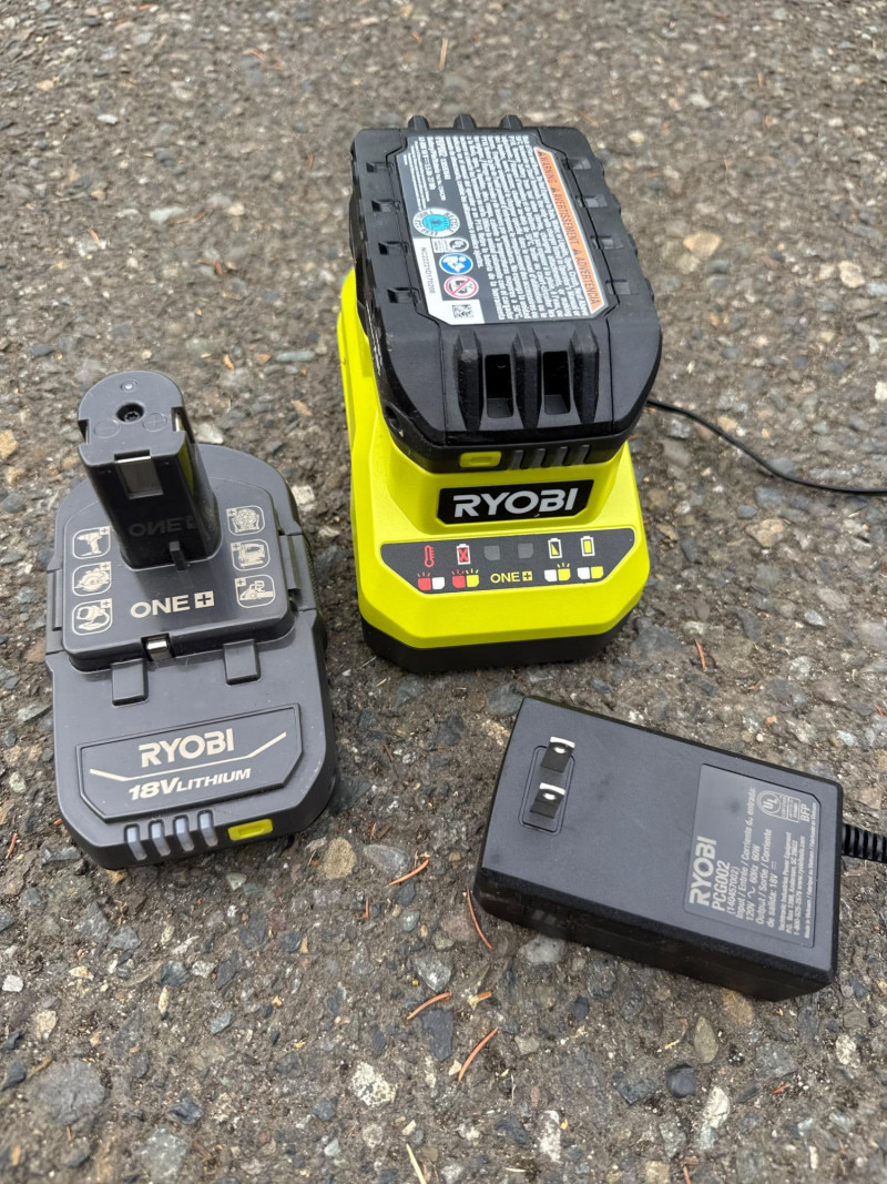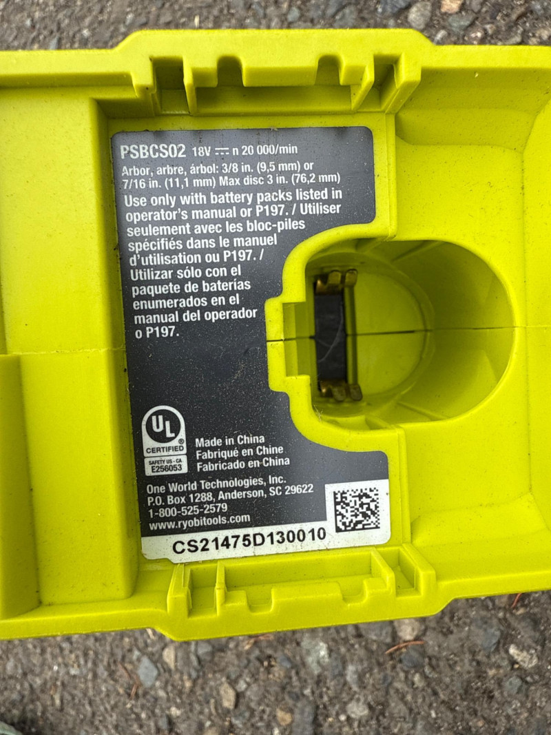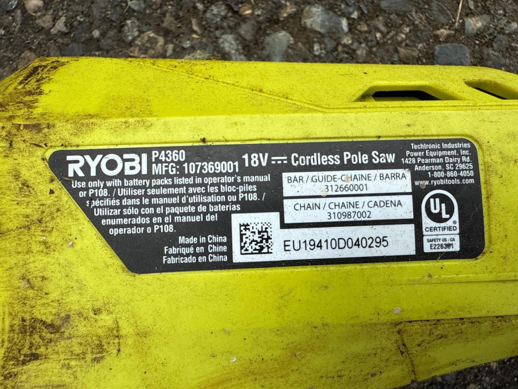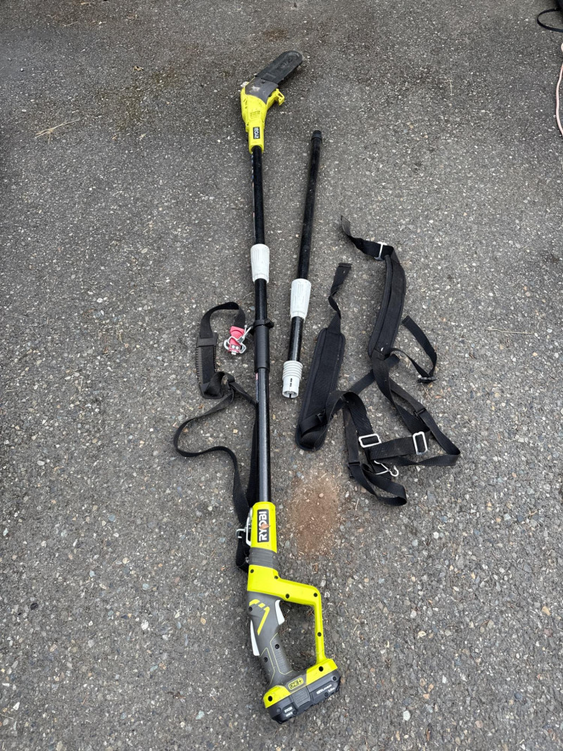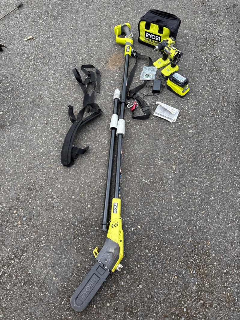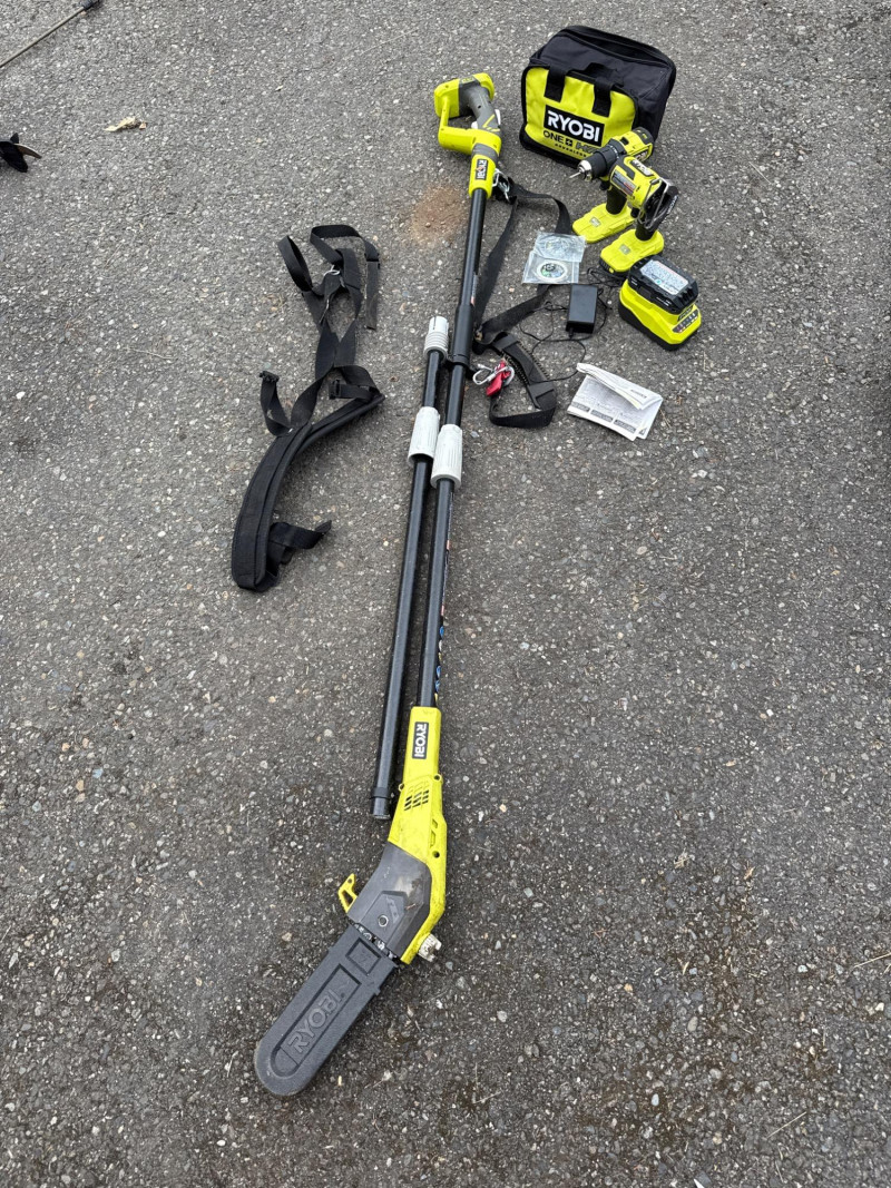 Model(s): P4360, PSBCS02, PSBDD01; compatible with Ryobi ONE+ battery system This lot includes a set of three Ryobi battery-powered tools, ideal for light to moderate DIY, yardwork, and home improvement tasks: Pole Saw: Telescoping shaft for extended reach Compact cutting head suitable for pruning branches. 8in Saw blade Battery-powered operation for cordless convenience Cordless Drill: Variable speed trigger Keyless chuck Ergonomic grip design Cordless operation across all tools Lightweight and portable designs Compatible with Ryobi ONE+ battery system-Two batteries and charger included Ideal for homeowners, hobbyists, and light-duty contractors Overall Condition: Appears gently used; no major visible damage Functionality: All tools powered up with batteries Cosmetic Wear: Minor scuffs and signs of use consistent with light handlingComponents & Contents: