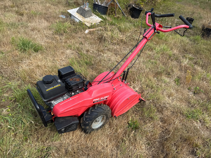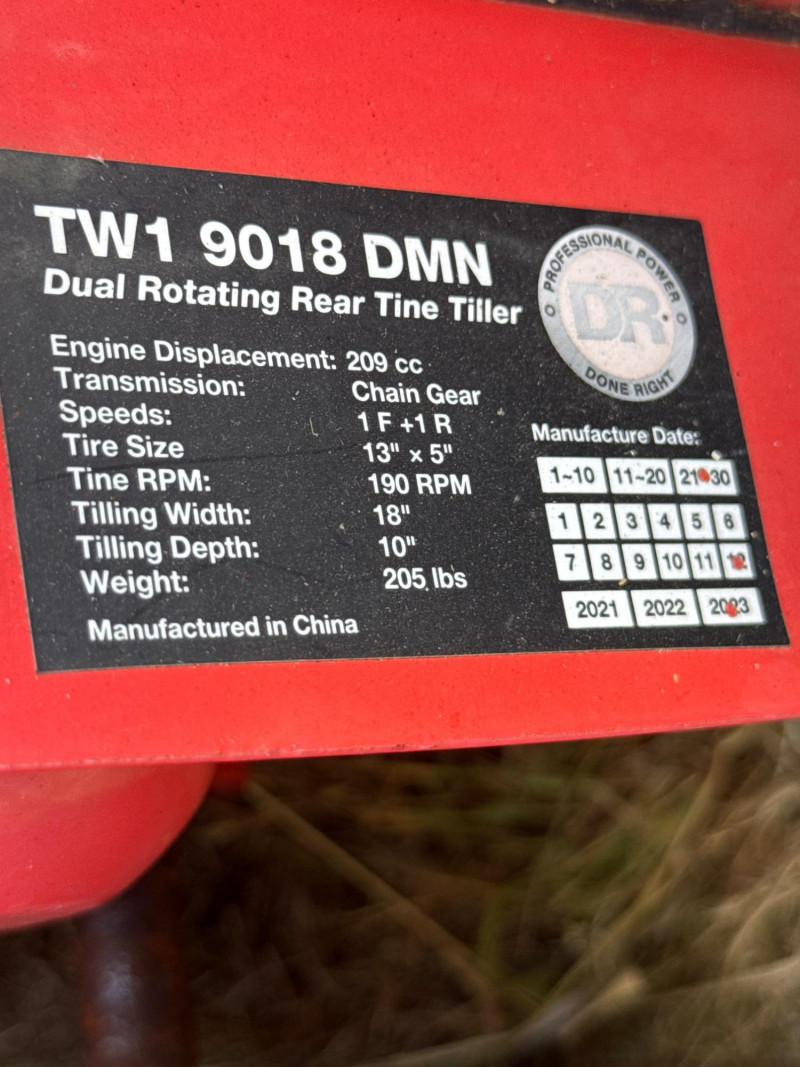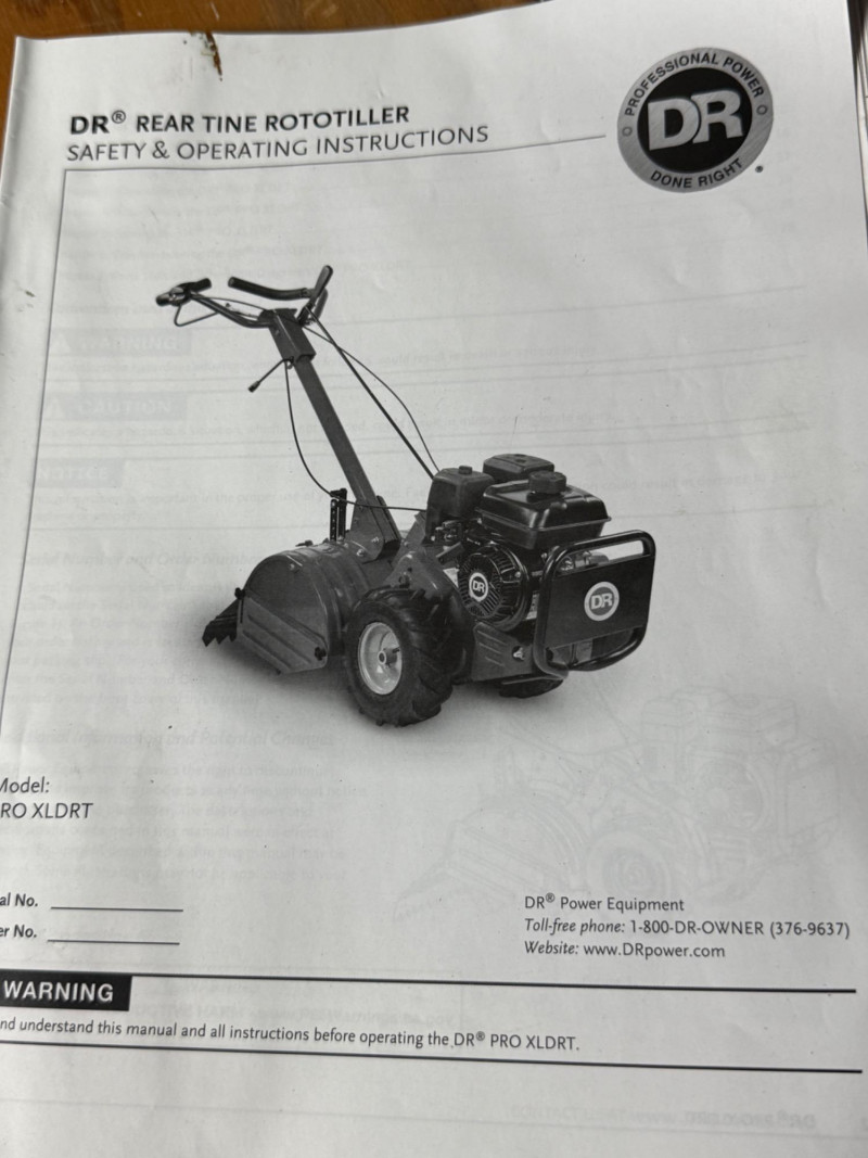 Make: DR Power Equipment Model: Pro XLDRT (Dual Rotating Tines) Engine: Heavy-duty gas-powered engine (exact specs not listed; likely Briggs & Stratton or similar) Tines: Dual rotating tines for both forward and counter-rotating tilling Drive System: Self-propelled with variable speed control Handlebars: Adjustable ergonomic handles for user comfort Controls: Easy-access throttle and depth adjustment levers Frame: Reinforced steel construction for durability Wheels: Large pneumatic tires for traction and maneuverability. May require more air for loading Length: 71 inches Width: 20 inches Height: 42 inches Depth: Not specified Operational Status: Powered up and functional Visual Condition: Appears well-maintained with signs of typical use Wear: Minor cosmetic wear consistent with outdoor tool usage Notes: No major damage or missing components reported **Note: Must bring appropriate tools and support to load. Per bidding contract-Staff is not able to help load, lift or haul items. *There may be additional parts, to be confirmed at pick-up.Make & Model
