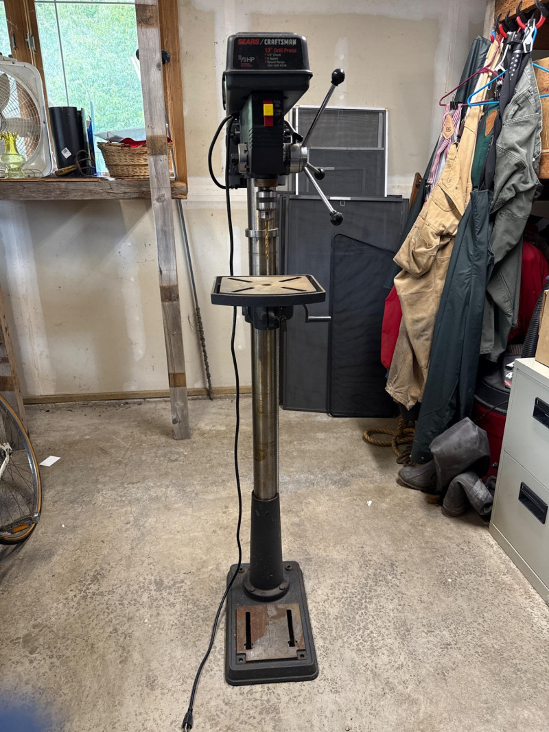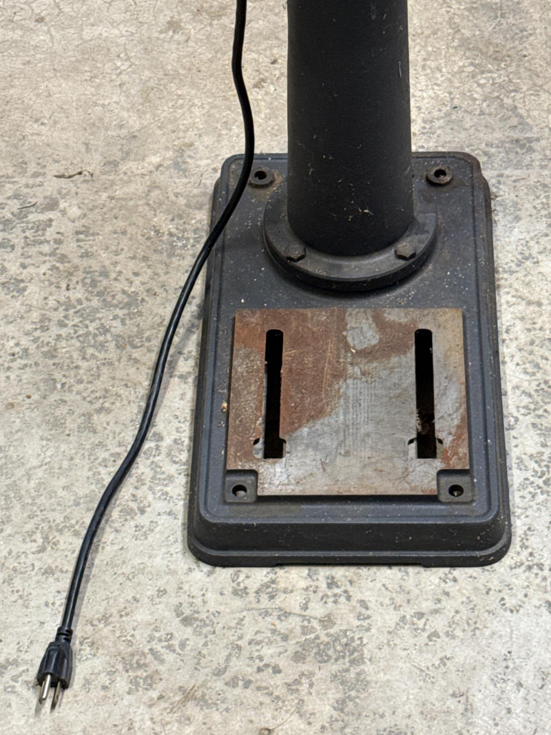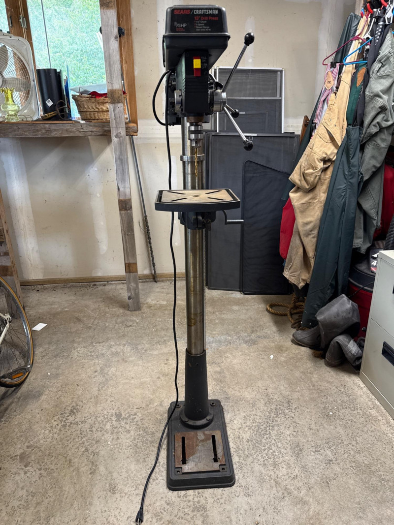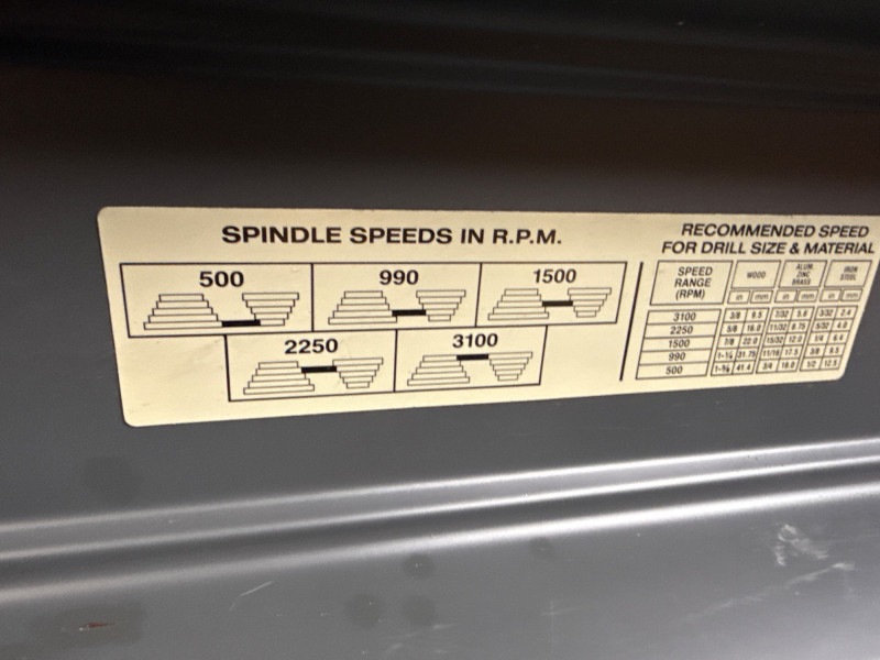 Dimensions: 24" L × 13" W × 63" H Heavy-duty cast iron base for stability and vibration reduction during operation Adjustable worktable with tilt and height settings for versatile drilling angles 13-inch swing capacity suitable for a wide range of drilling tasks Multi-speed motor with variable RPM settings for precision control Chuck capacity accommodates standard drill bits up to 5/8" Integrated depth stop for consistent bore depths Safety toggle switch with easy access shut-off Overall condition: Good Operational status: Powers on and runs smoothly; tested for basic functionality Cosmetic wear: Minor scuffs and surface wear consistent with age and use Missing parts: None observed; all major components intact Maintenance: Appears well-maintained; no signs of rust or mechanical damageComponents & Features: