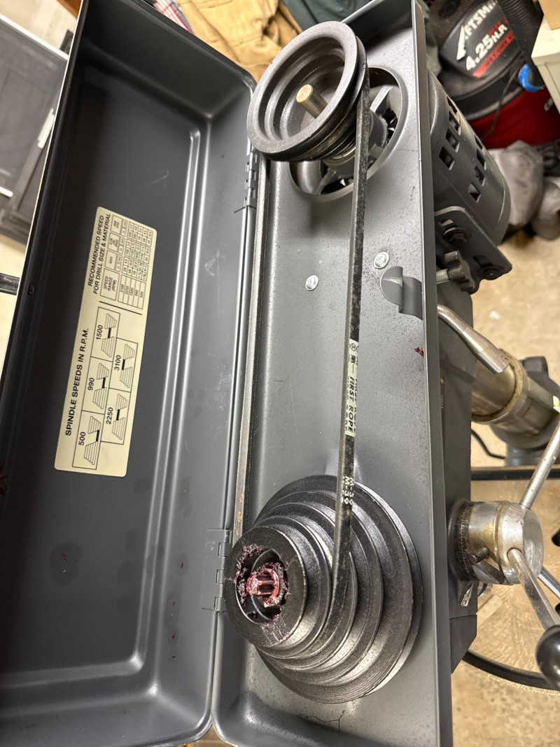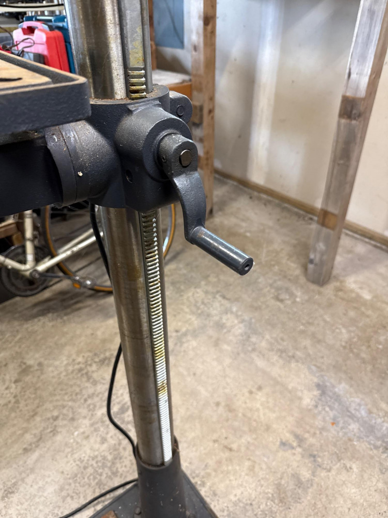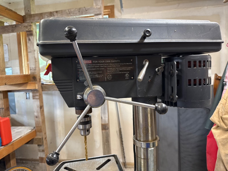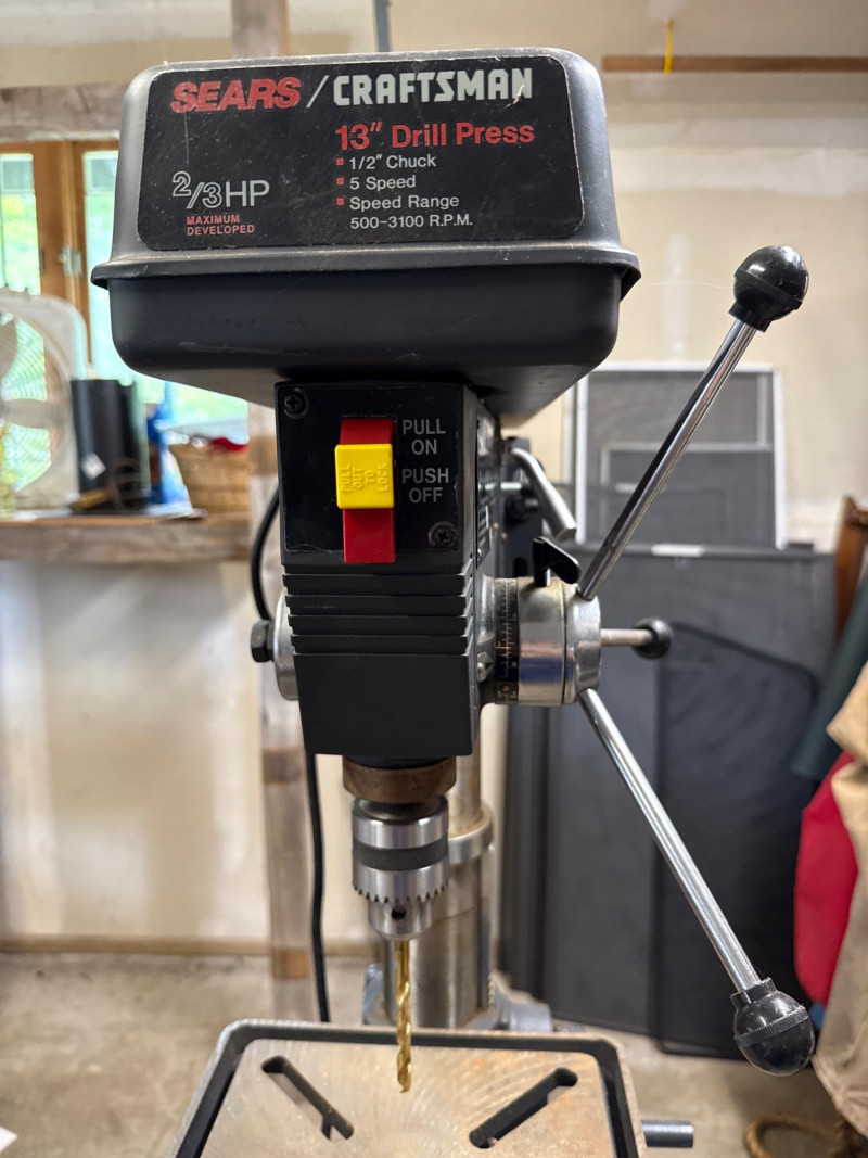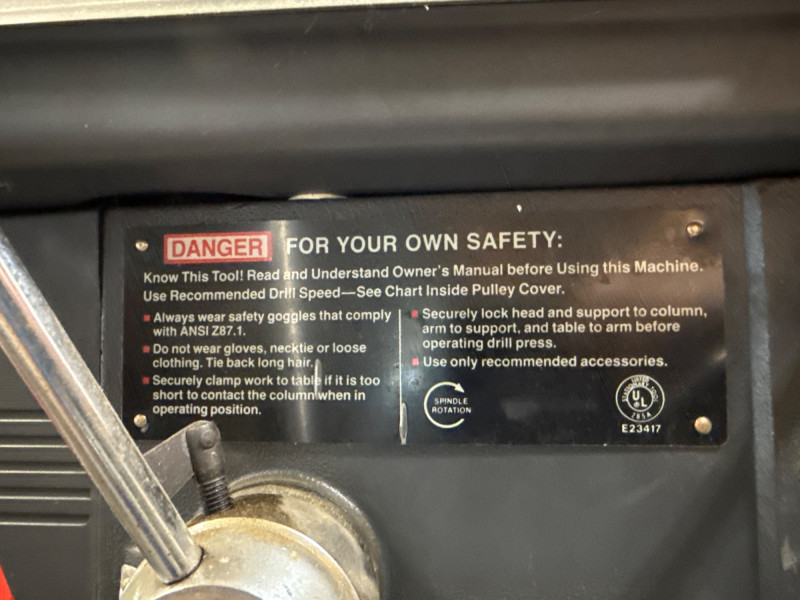 Dimensions: 24" L × 13" W × 63" H Heavy-duty cast iron base for stability and vibration reduction during operation Adjustable worktable with tilt and height settings for versatile drilling angles 13-inch swing capacity suitable for a wide range of drilling tasks Multi-speed motor with variable RPM settings for precision control Chuck capacity accommodates standard drill bits up to 5/8" Integrated depth stop for consistent bore depths Safety toggle switch with easy access shut-off Overall condition: Good Operational status: Powers on and runs smoothly; tested for basic functionality Cosmetic wear: Minor scuffs and surface wear consistent with age and use Missing parts: None observed; all major components intact Maintenance: Appears well-maintained; no signs of rust or mechanical damageComponents & Features: