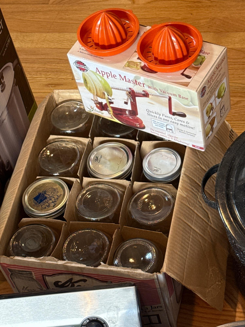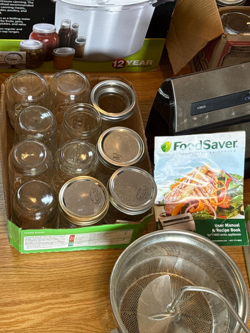 A complete starter set for home canning enthusiasts or seasoned preservers, this lot offers a versatile mix of tools and supplies to preserve seasonal harvests with ease and efficiency. FoodSaver Vacuum Sealer Model: FM2000 Features: Compact design, easy-lock latch, removable drip tray, compatible with FoodSaver bags and rolls Size: 23-quart capacity Features: Suitable for canning meats, vegetables, and fruits; includes pressure gauge and locking lid Condition: Excellent, with original instruction manual Quantity: Several mixed cases Sizes: Mix of pint and quart Brands: Ball, Kerr Includes: Metal rings and lids (some new, some gently used) Bonus Items Plastic juicers Ideal for small-batch or bulk food preservation Trusted brands known for durability and performance Great value for homesteaders, gardeners, or anyone embracing sustainable livingContents Include: