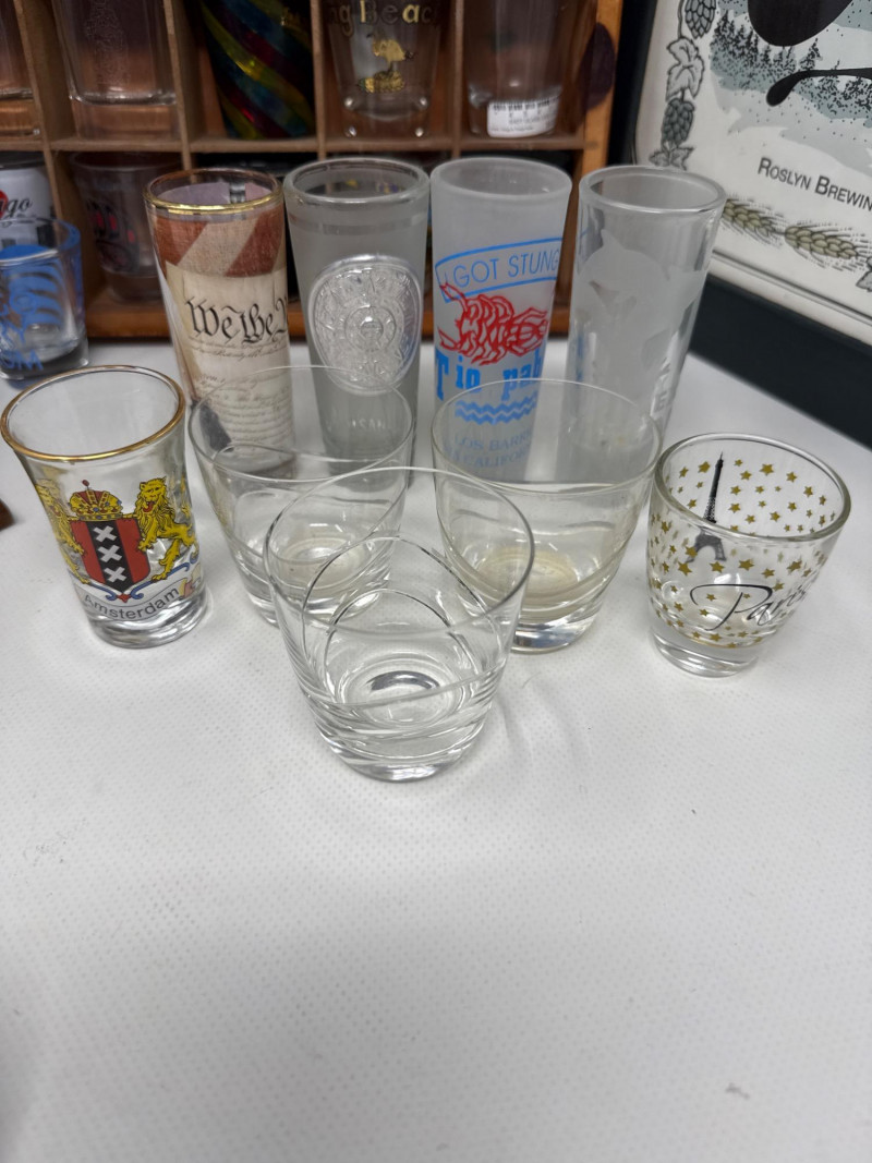 A large variety of unique vintage shot glasses—styles and designs may vary, offering regional souvenirs, classic shapes, and humorous motifs. A treasure trove for shot glass collectors or bar display enthusiasts. Fun Barware Accents: