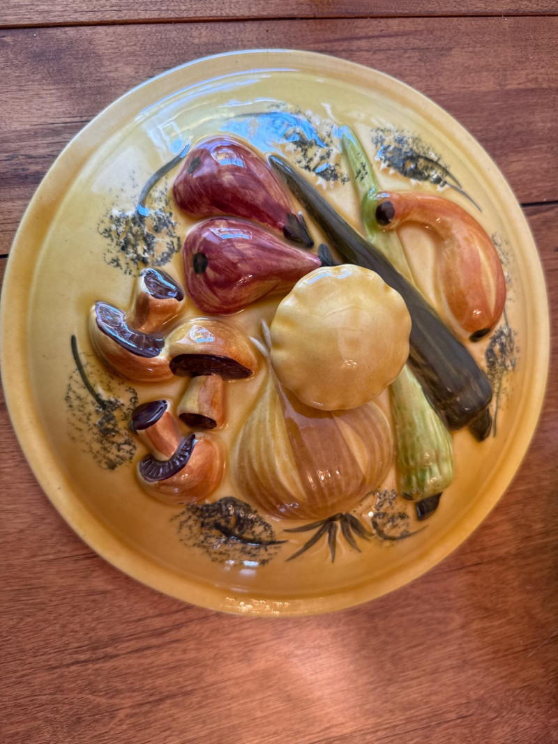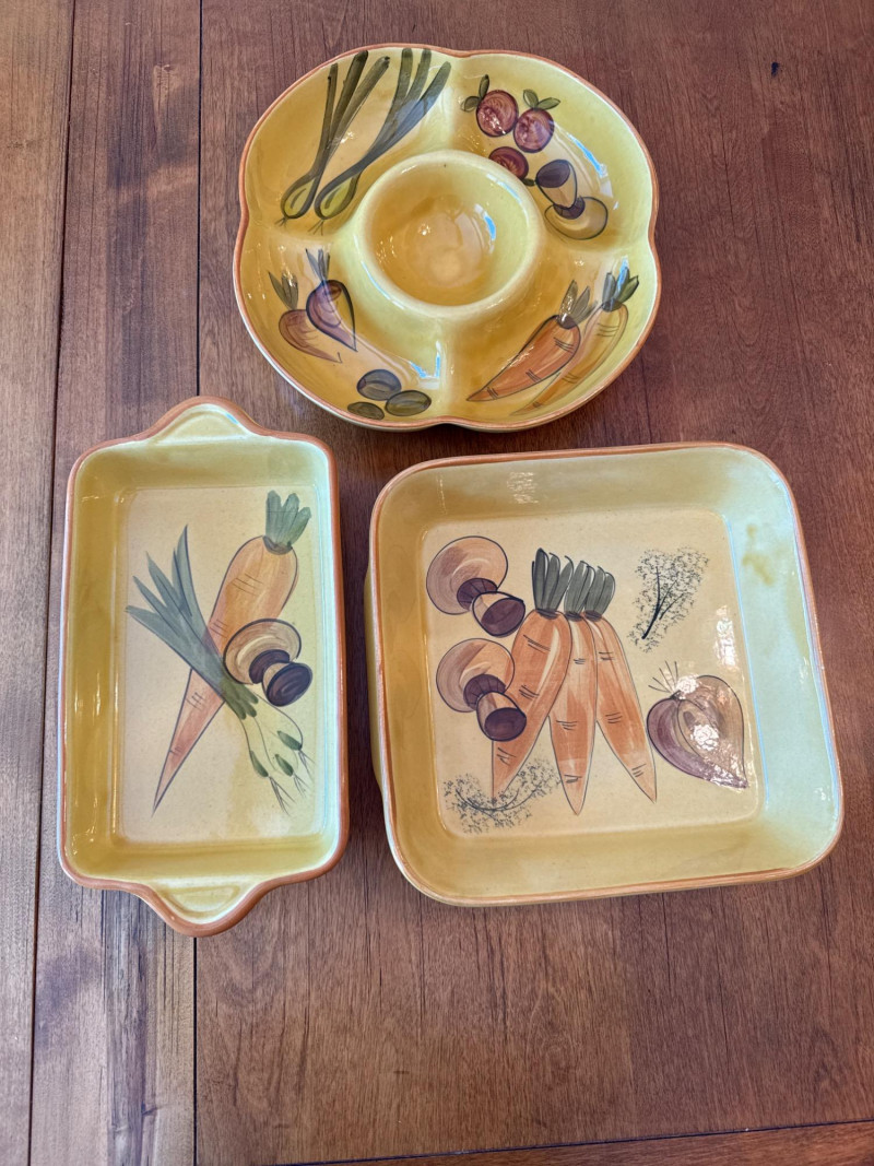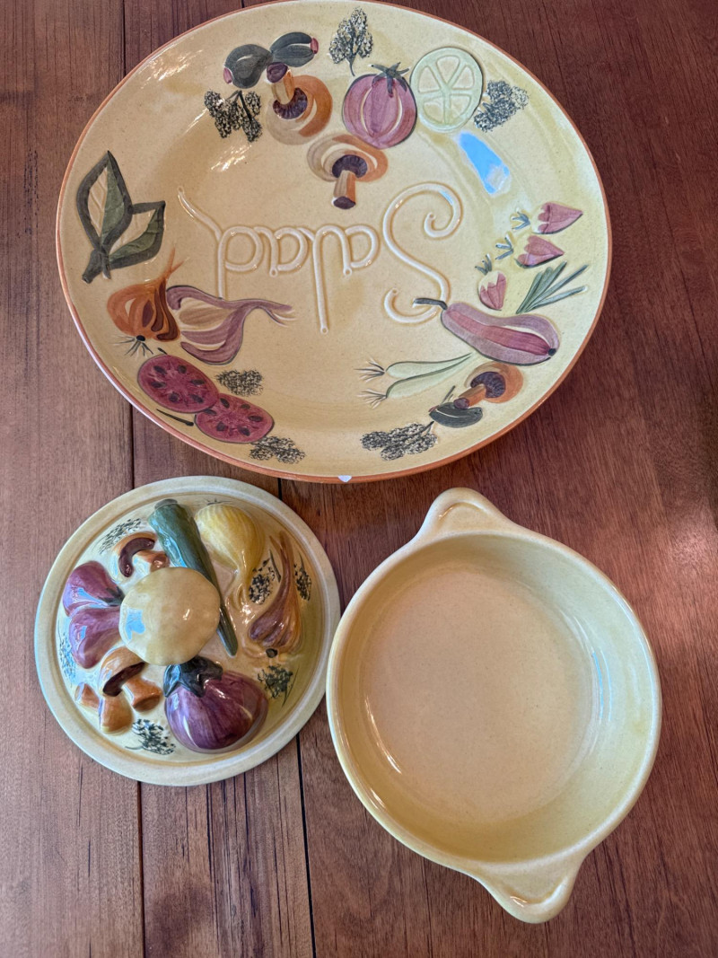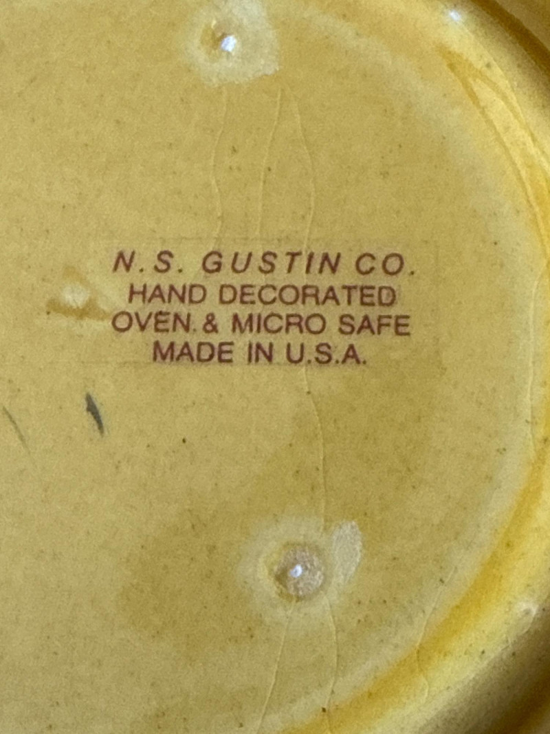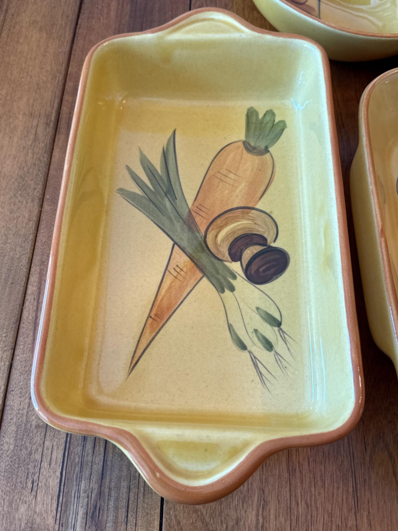 A coordinated set of vintage ceramic serving dishes from N.S Gustin, designed and manufactured in the USA. This charming collection features an embossed harvest motif and a golden yellow glaze that evokes the warmth of mid-century farmhouse style. Design Features Raised vegetable pattern highlighting carrots, mushrooms, green onion, and eggplant Warm yellow glaze with natural age-related crazing and speckling Gently scalloped edges with a balanced, handcrafted feel Base clearly marked “Made in USA” Condition