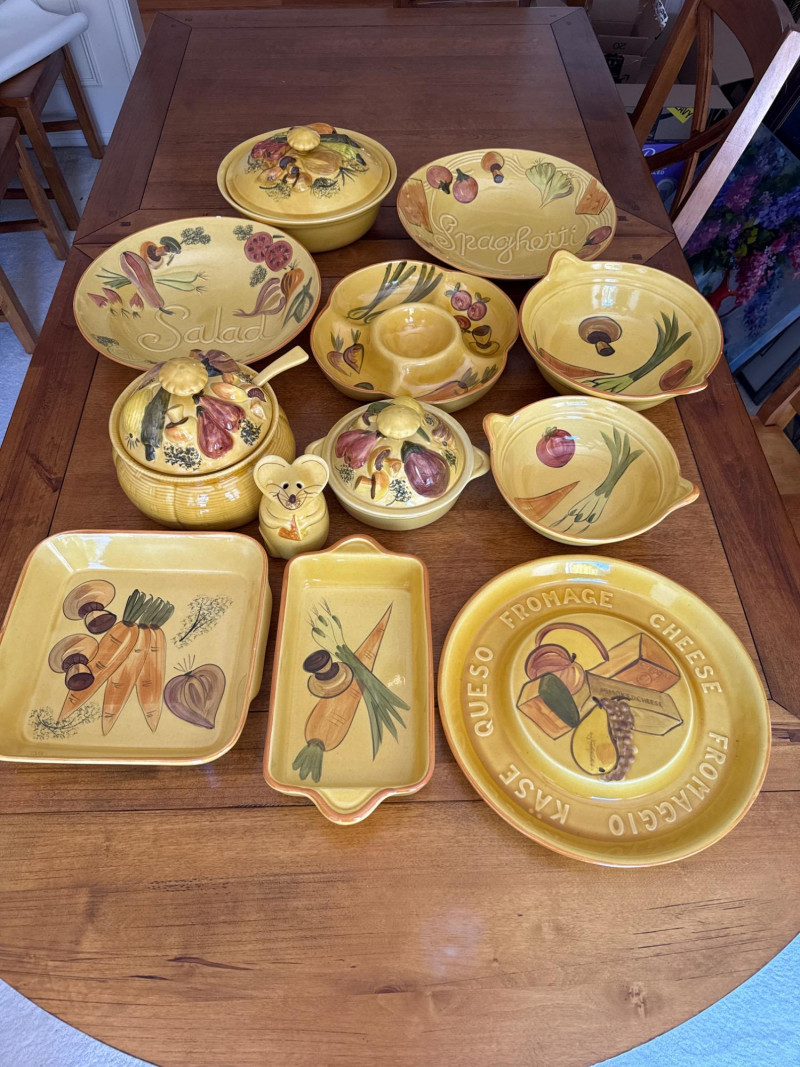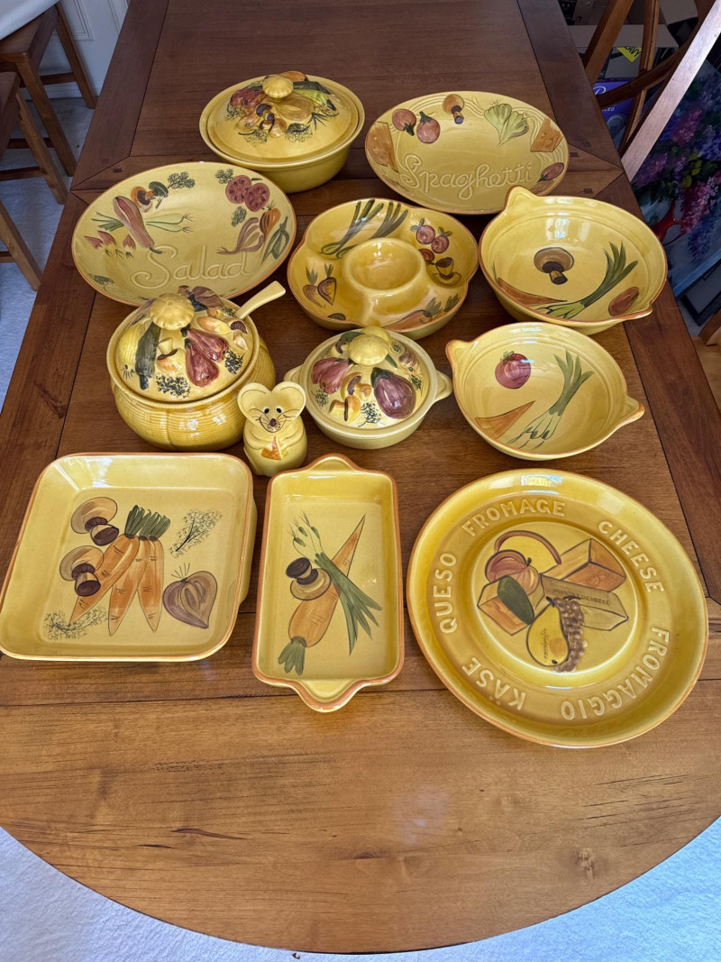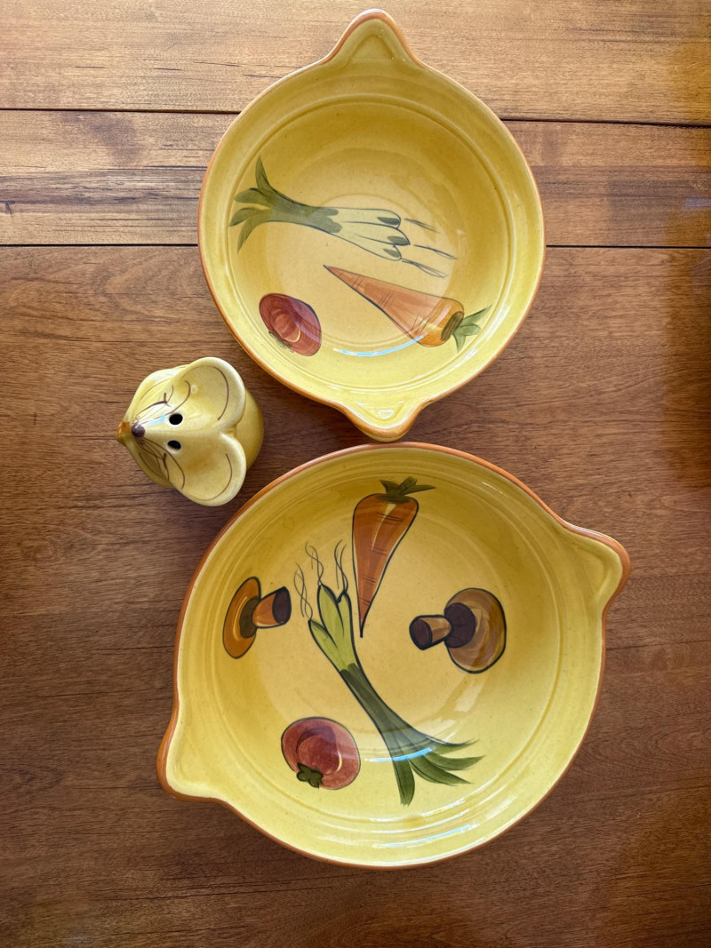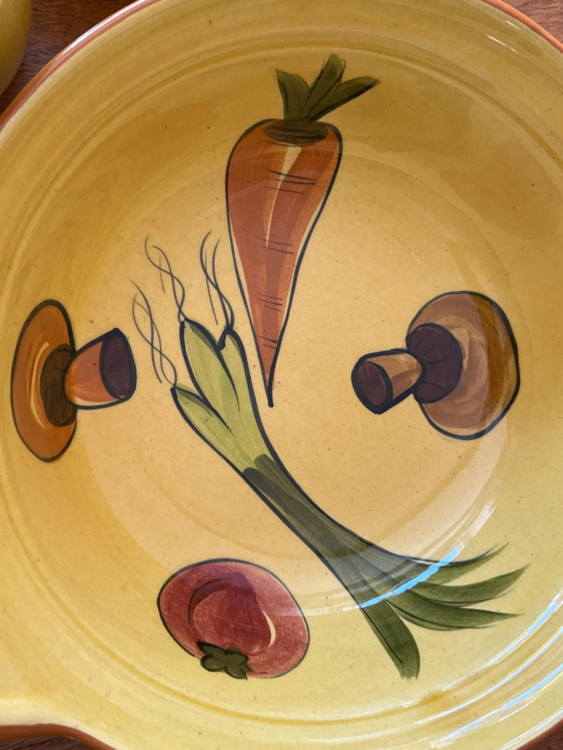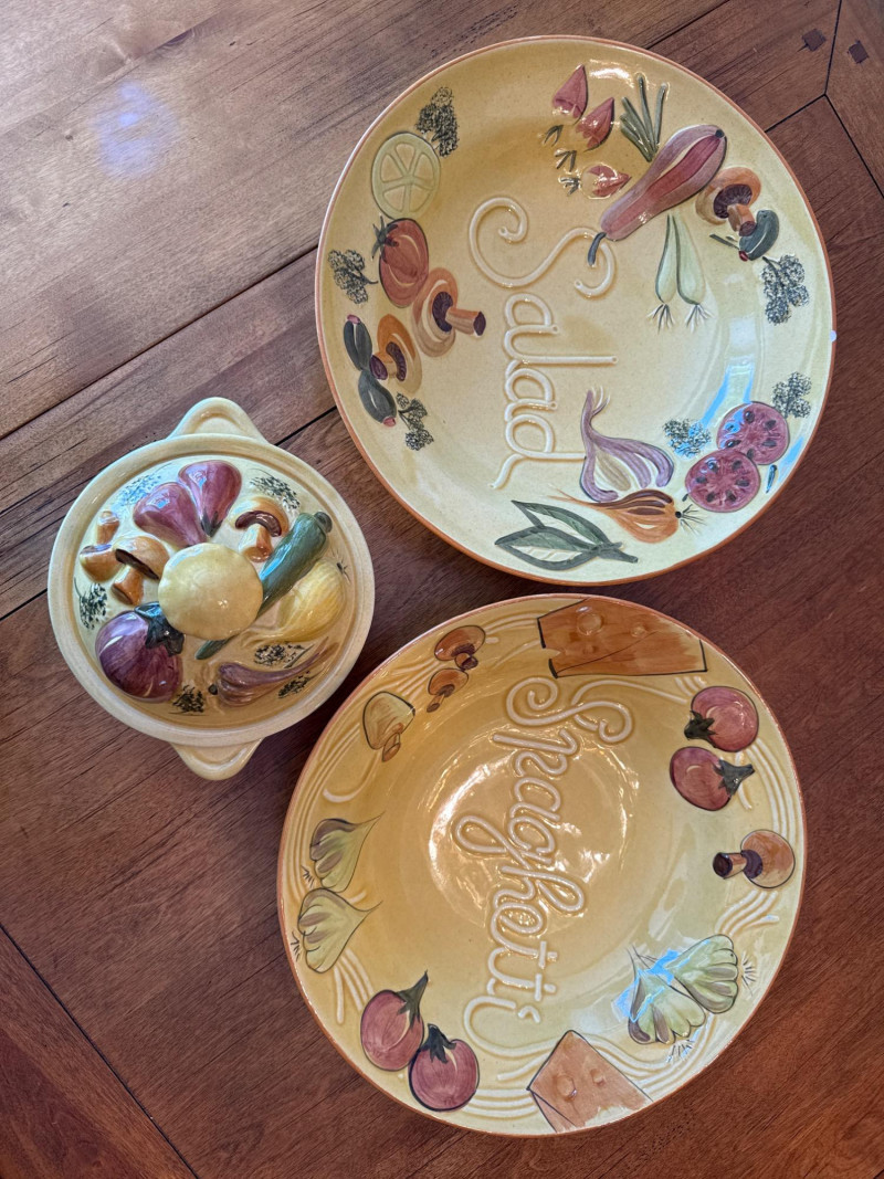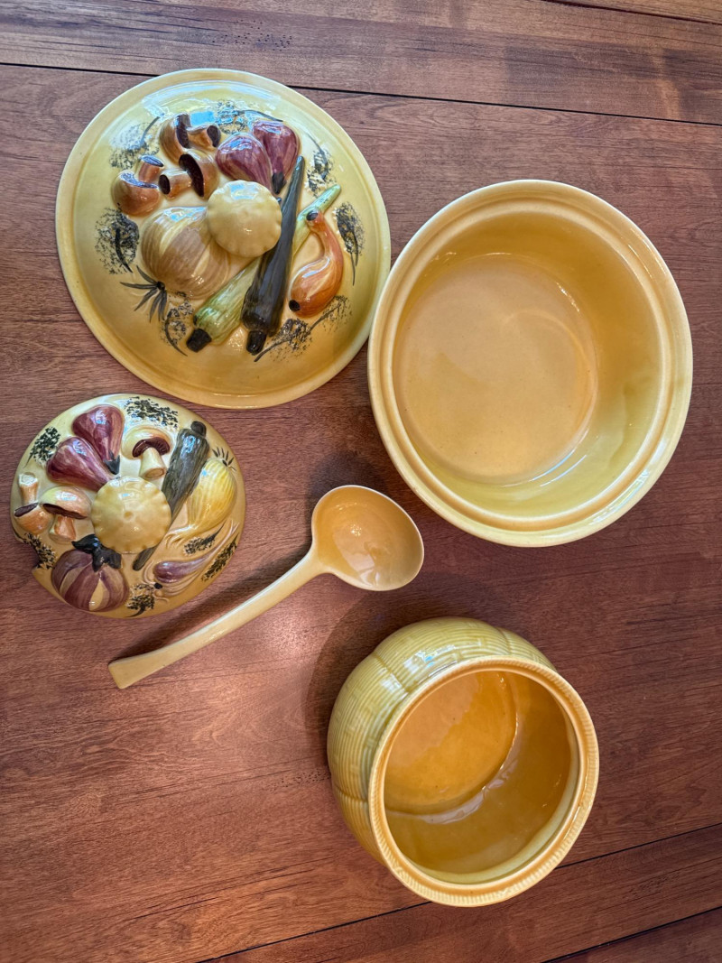 A coordinated set of vintage ceramic serving dishes from N.S Gustin, designed and manufactured in the USA. This charming collection features an embossed harvest motif and a golden yellow glaze that evokes the warmth of mid-century farmhouse style. Design Features Raised vegetable pattern highlighting carrots, mushrooms, green onion, and eggplant Warm yellow glaze with natural age-related crazing and speckling Gently scalloped edges with a balanced, handcrafted feel Base clearly marked “Made in USA” Condition