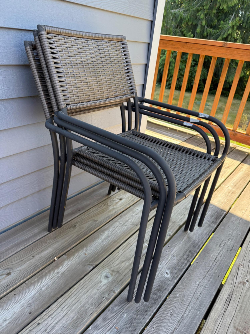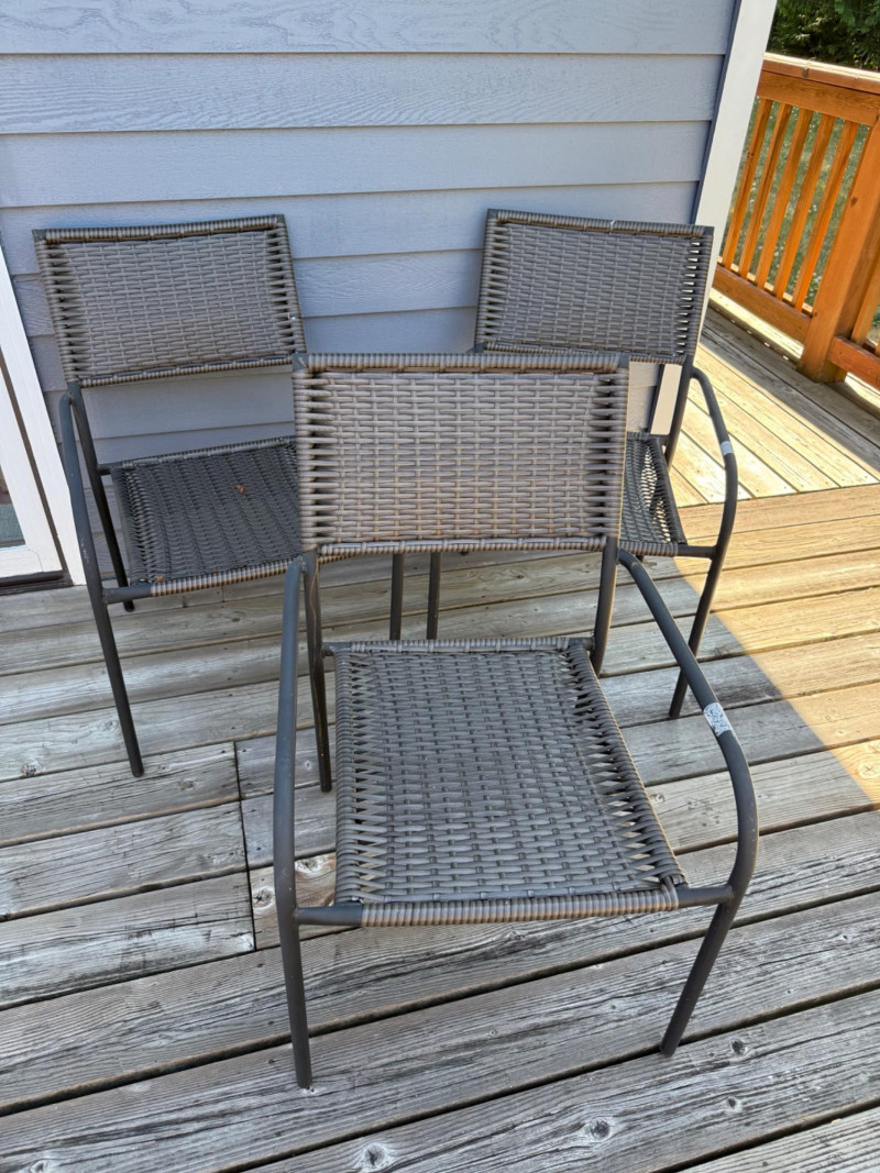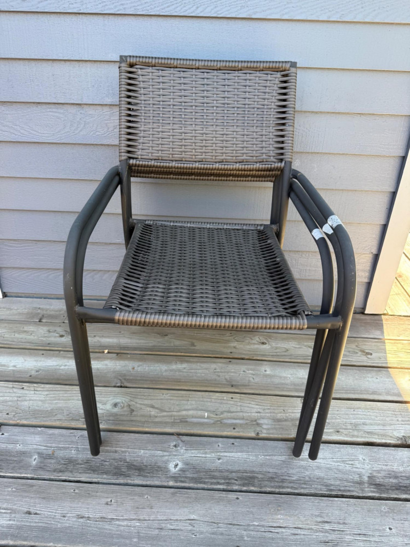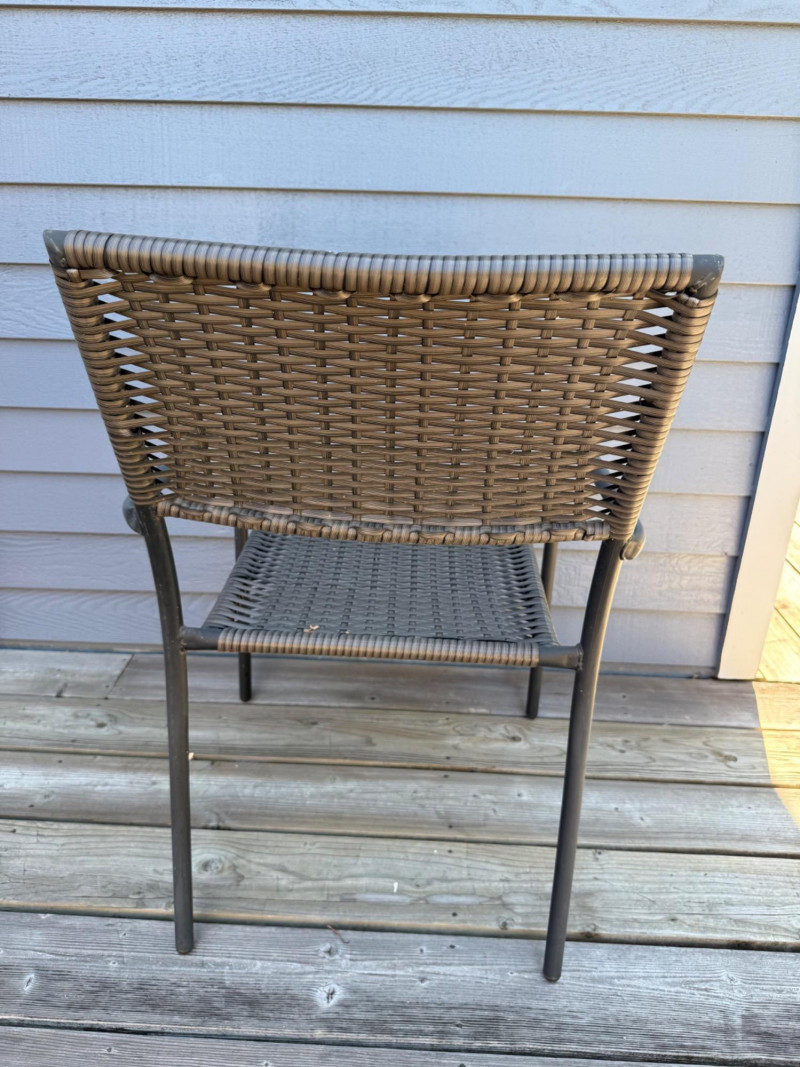 Set of three modern outdoor café chairs with resin wicker weave and a lightweight, stackable metal frame. Designed for easy storage and casual dining spaces, these chairs combine style and durability. Design Features Woven resin wicker seats and backs in a neutral espresso finish Stackable powder-coated metal frames for convenience and space-saving Gently curved backrests with open-weave design for breathable comfort Dimensions per chair: 20.5" Length x 23" Width x 32" Total Height Condition
