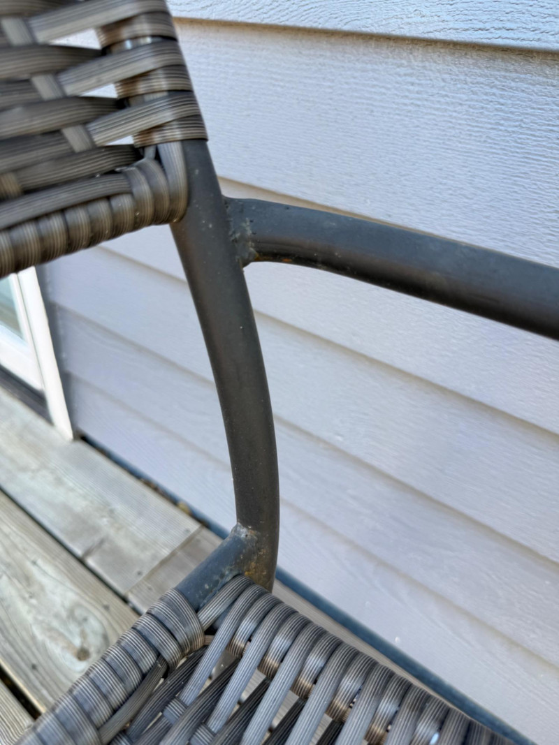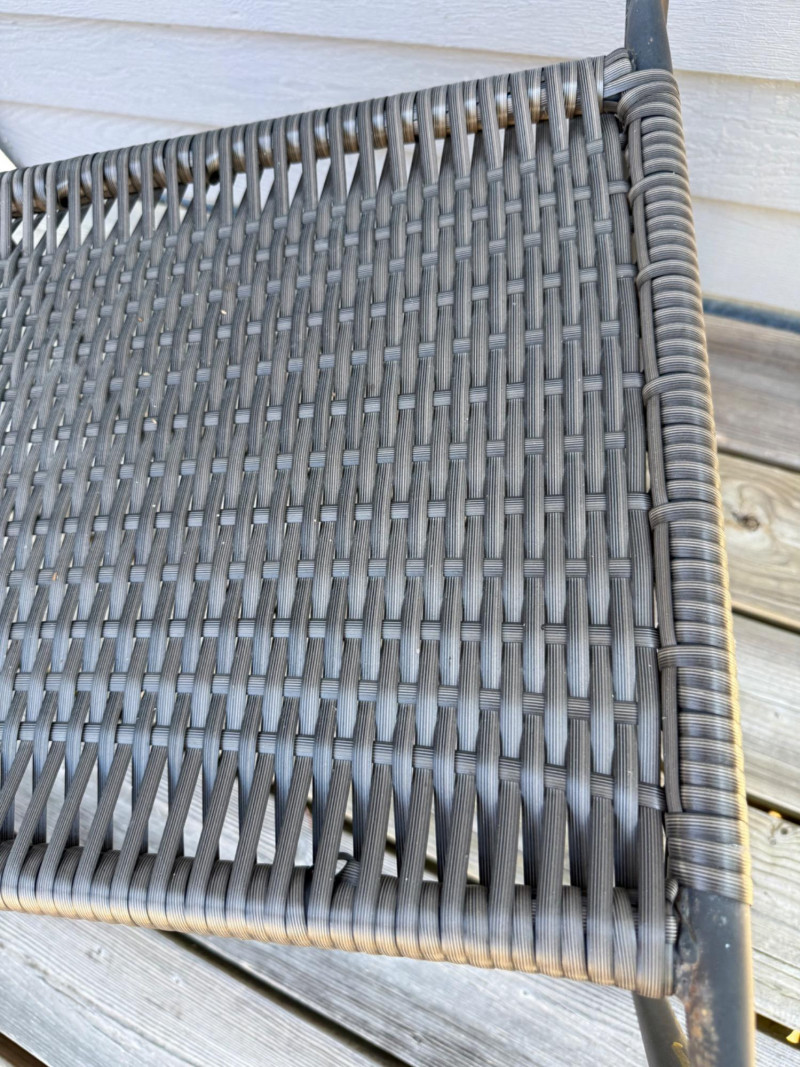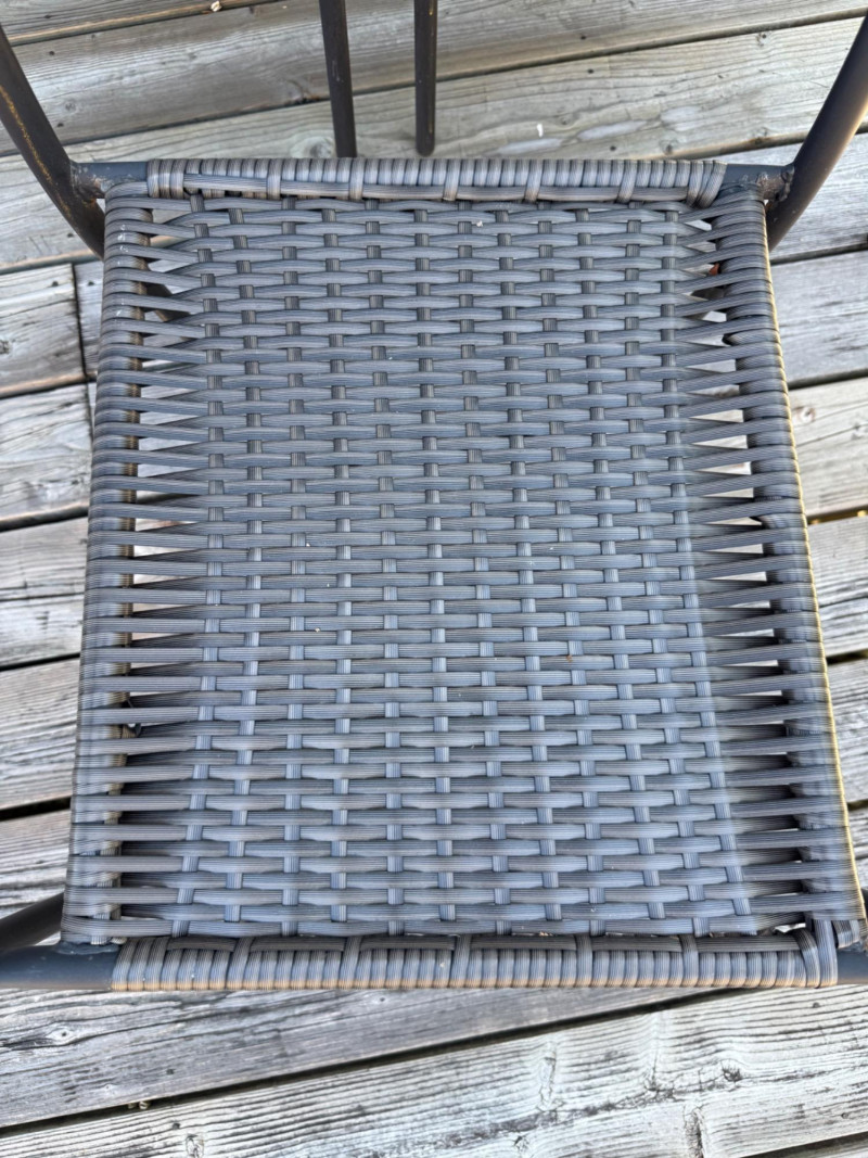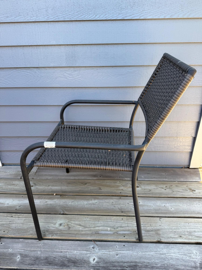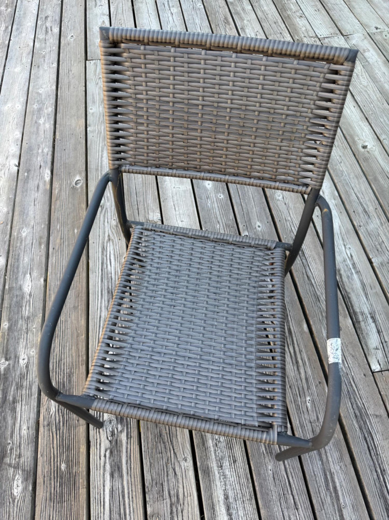 Set of three modern outdoor café chairs with resin wicker weave and a lightweight, stackable metal frame. Designed for easy storage and casual dining spaces, these chairs combine style and durability. Design Features Woven resin wicker seats and backs in a neutral espresso finish Stackable powder-coated metal frames for convenience and space-saving Gently curved backrests with open-weave design for breathable comfort Dimensions per chair: 20.5" Length x 23" Width x 32" Total Height Condition