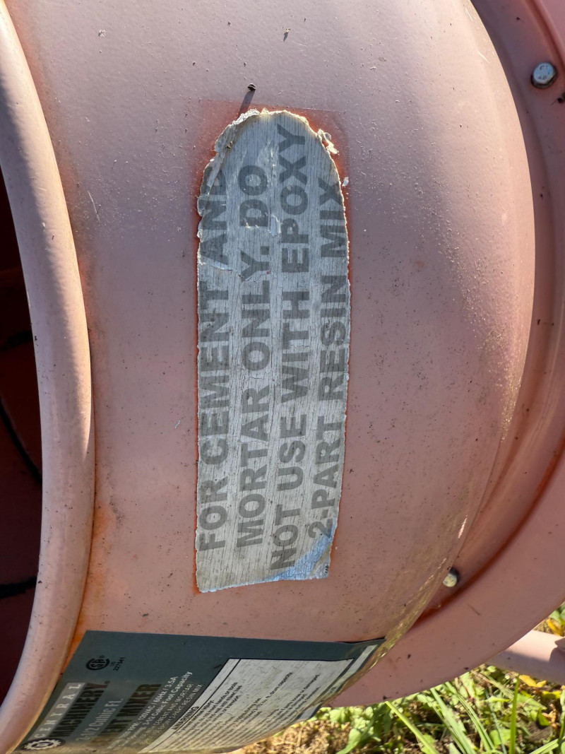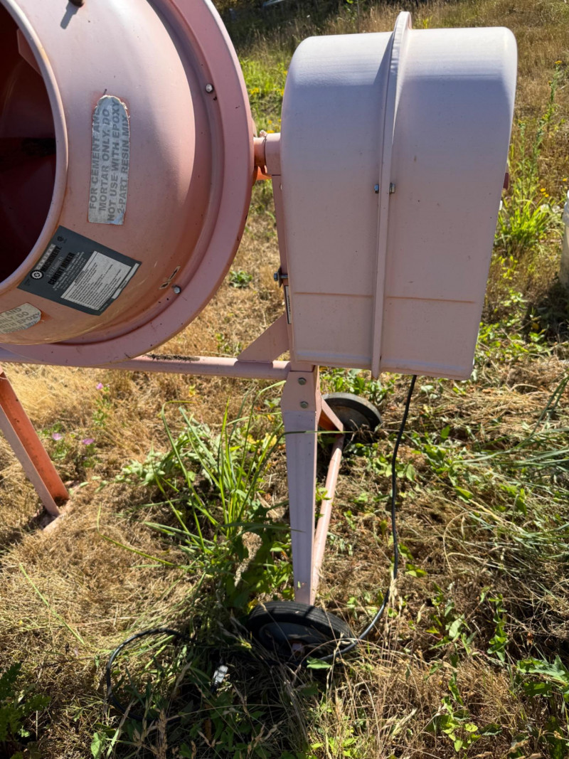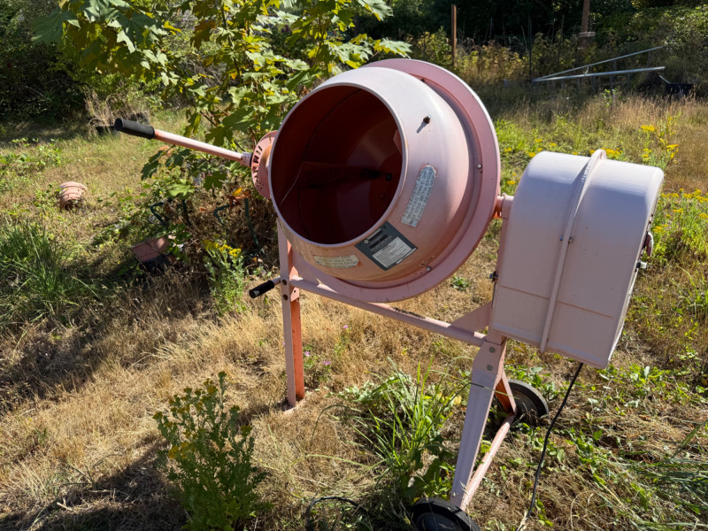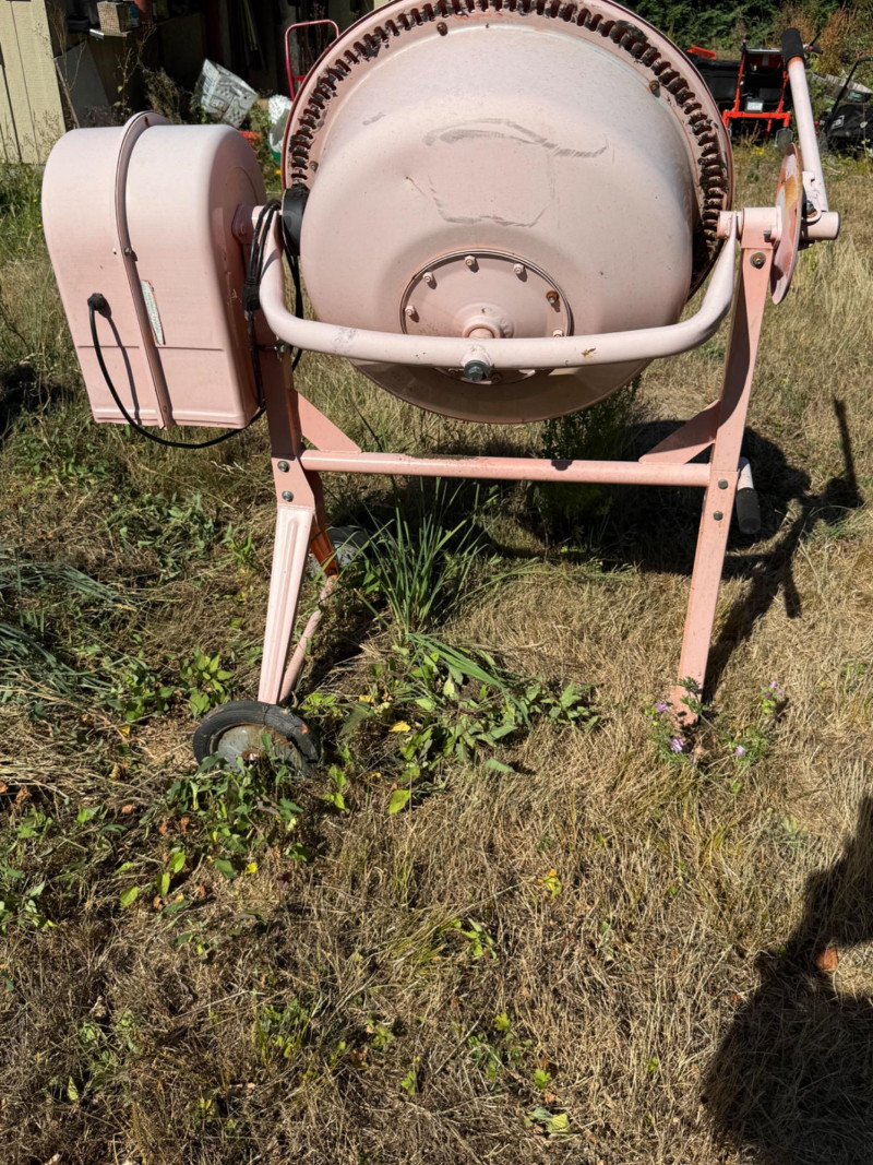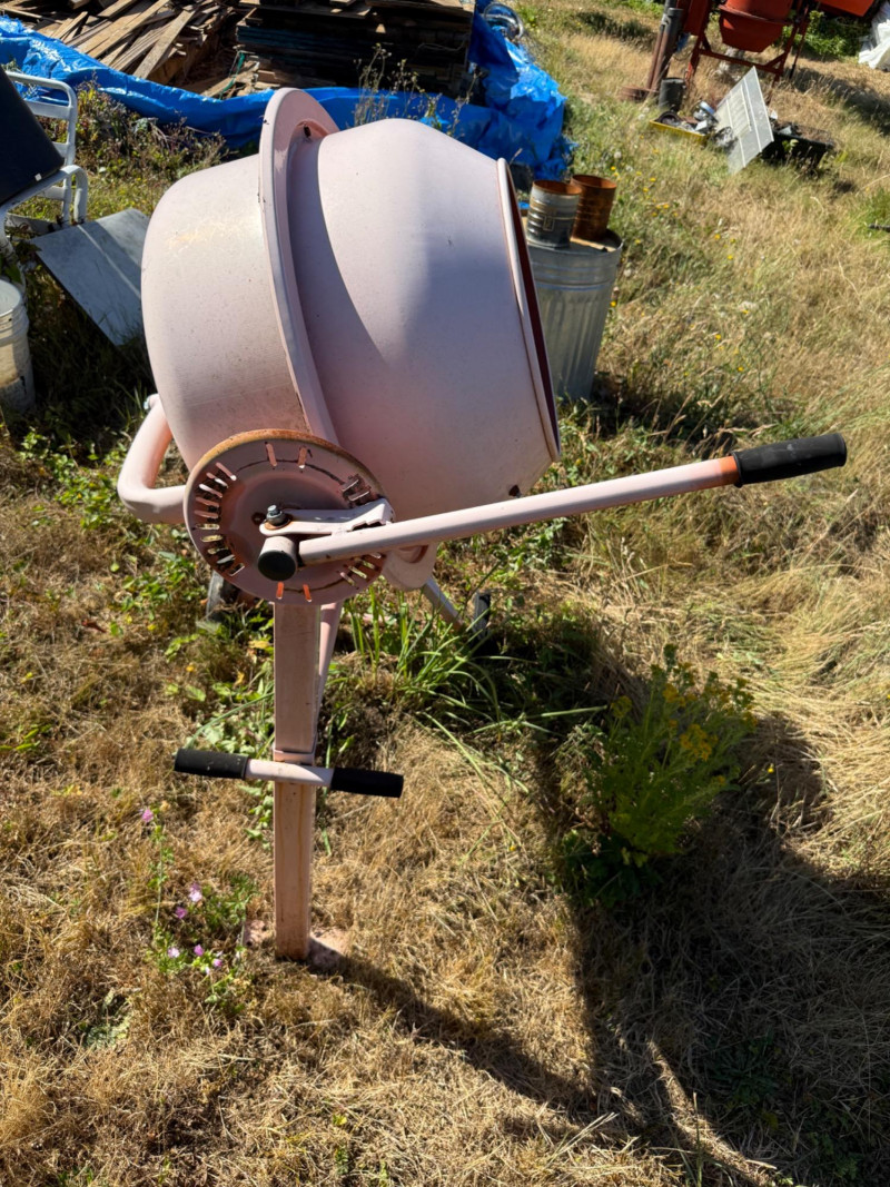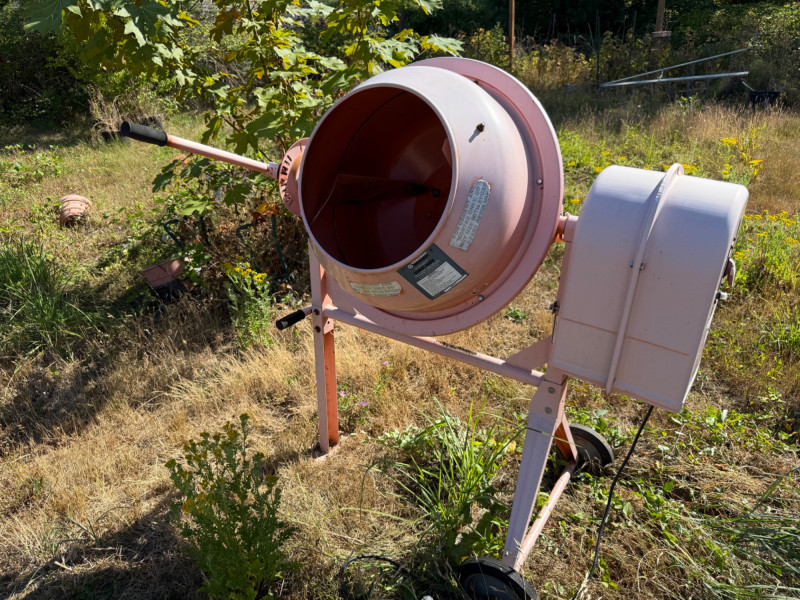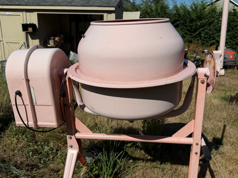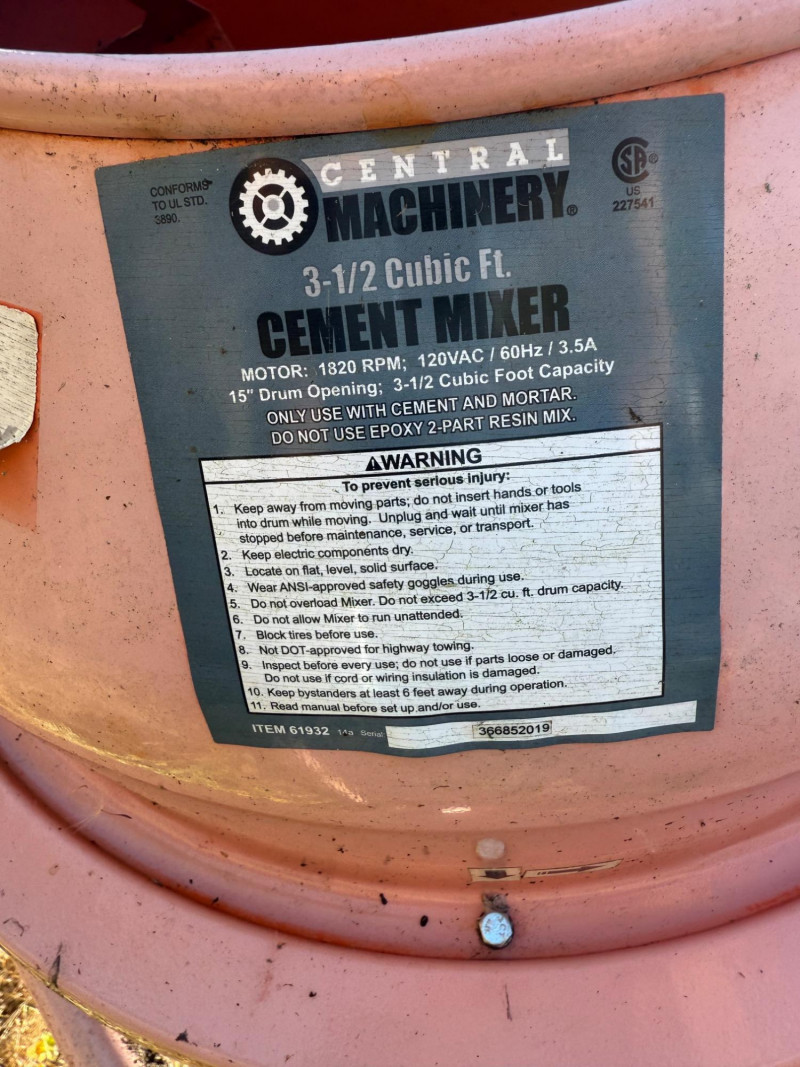 Heavy-duty Central Machinery cement mixer with 3.5 cubic foot drum capacity, designed for light- to mid-scale masonry projects. A practical addition for contractors, landscapers, or home renovation enthusiasts. Design Feature Durable steel frame construction with powder-coated finish 3.5 cubic foot mixing drum with hand-operated tilt mechanism Electric motor drive with on/off control Dimensions: 51" Length x 24" Width x 43" Height *Note: Please bring help to load. Will require navigating tall grass. Not Tested
