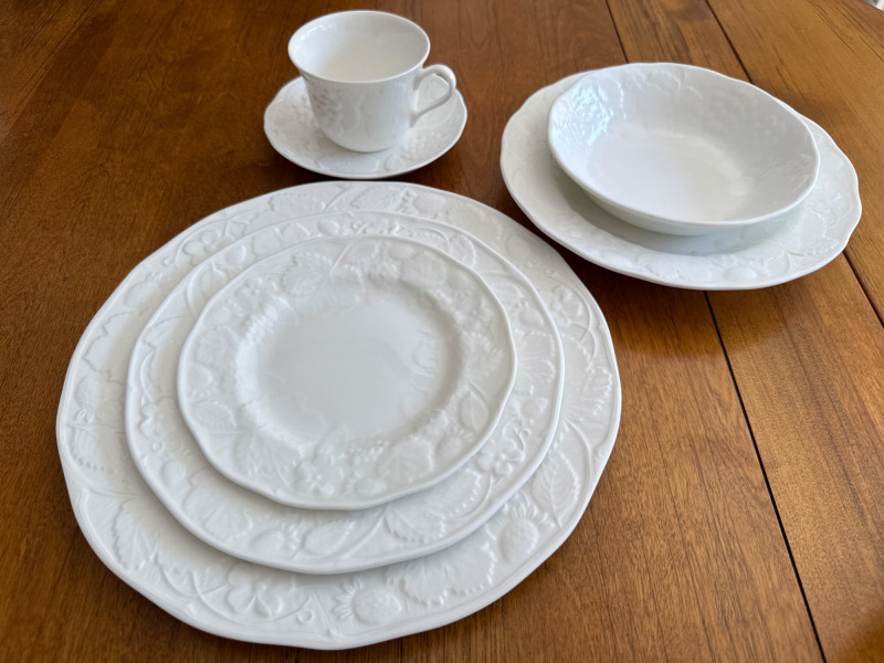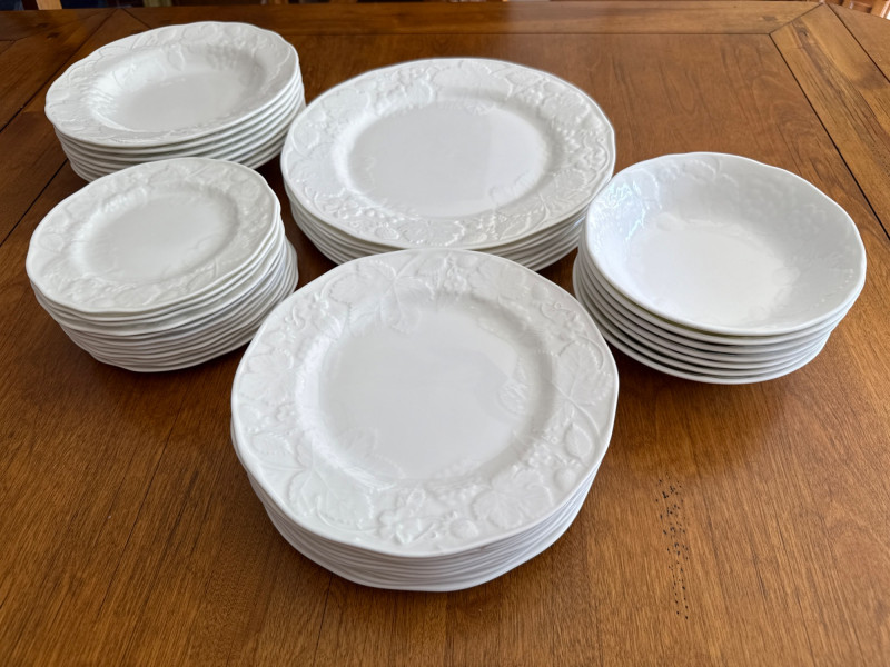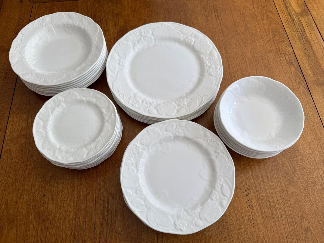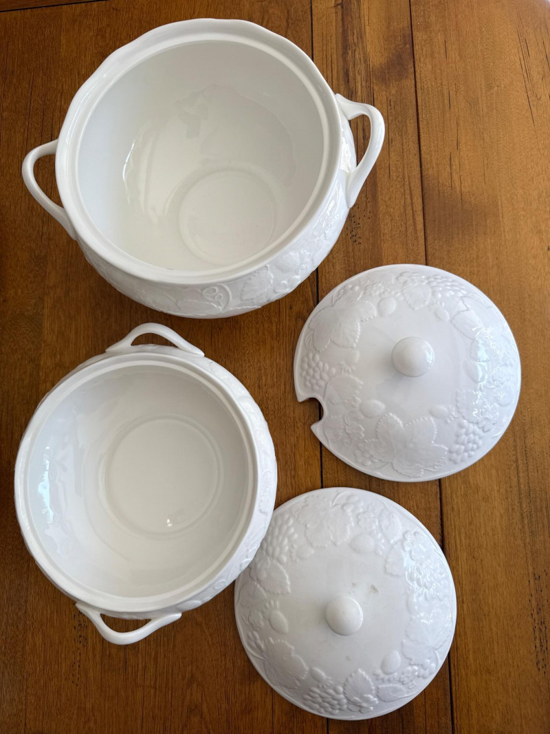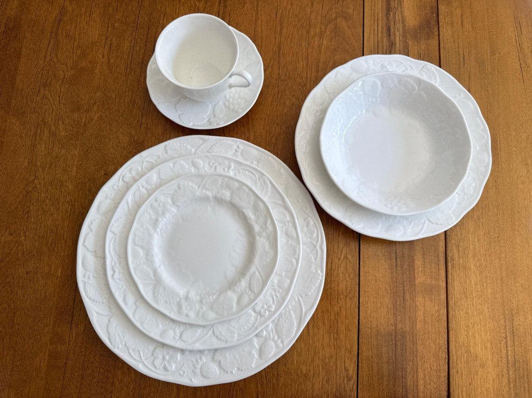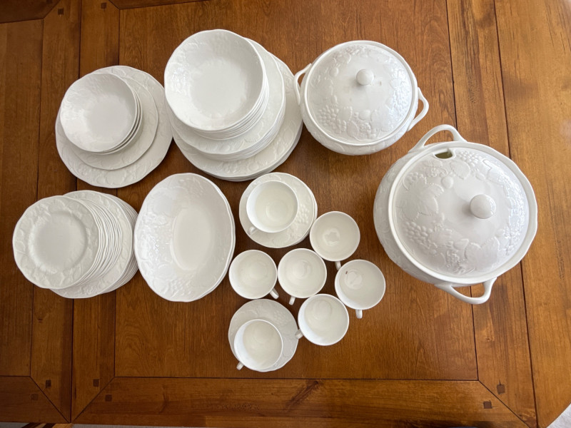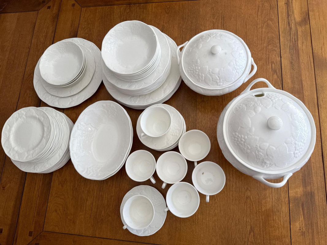 Pattern: Strawberry and Vine – a classic embossed white-on-white design featuring delicate strawberry leaves and trailing vines, known for its timeless elegance and versatility. Contents: Large set of china dishes Includes 7 dinner plates, 10 salad plates, 8 bowls, 7 cups, 9 saucers, 12 dessert plates, 2 oval dishes, 1 soup tureen, 1 lidded casserole dish, 7 soup bowls Condition: Appears to be in good vintage condition See pic for 5 pieces with chips. Not included in totals Gently used, with minimal signs of age or handling