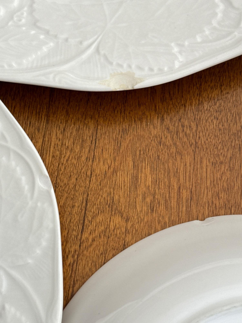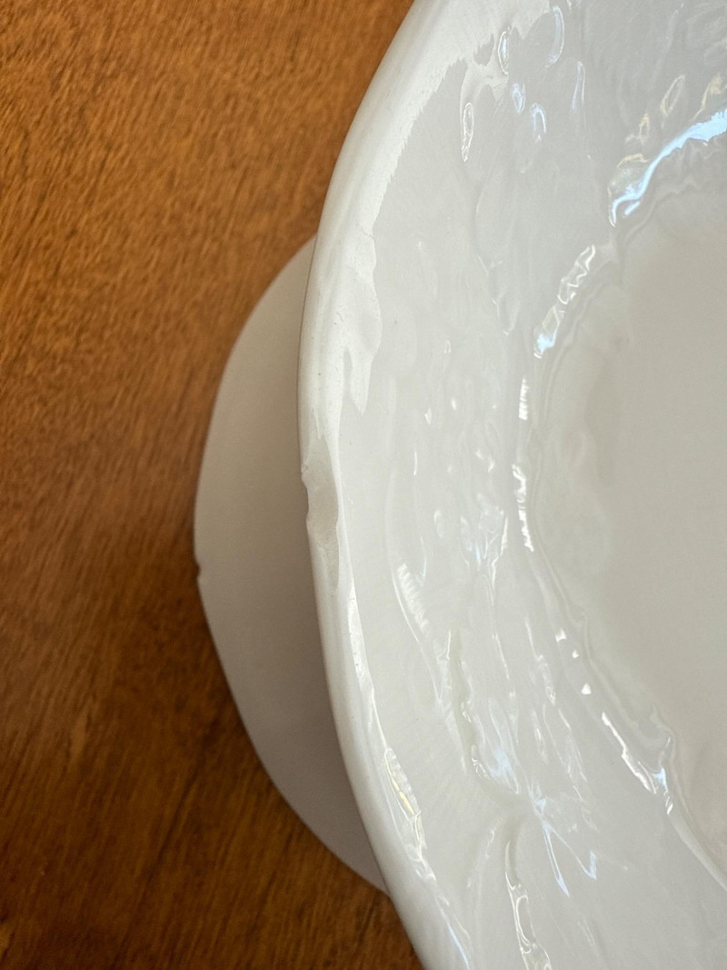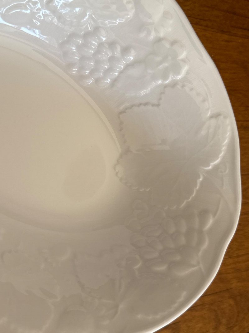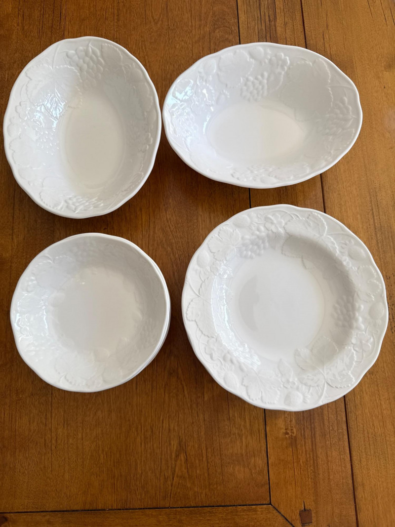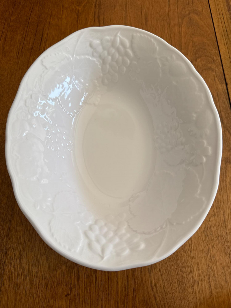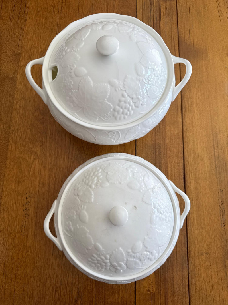 Pattern: Strawberry and Vine – a classic embossed white-on-white design featuring delicate strawberry leaves and trailing vines, known for its timeless elegance and versatility. Contents: Large set of china dishes Includes 7 dinner plates, 10 salad plates, 8 bowls, 7 cups, 9 saucers, 12 dessert plates, 2 oval dishes, 1 soup tureen, 1 lidded casserole dish, 7 soup bowls Condition: Appears to be in good vintage condition See pic for 5 pieces with chips. Not included in totals Gently used, with minimal signs of age or handling