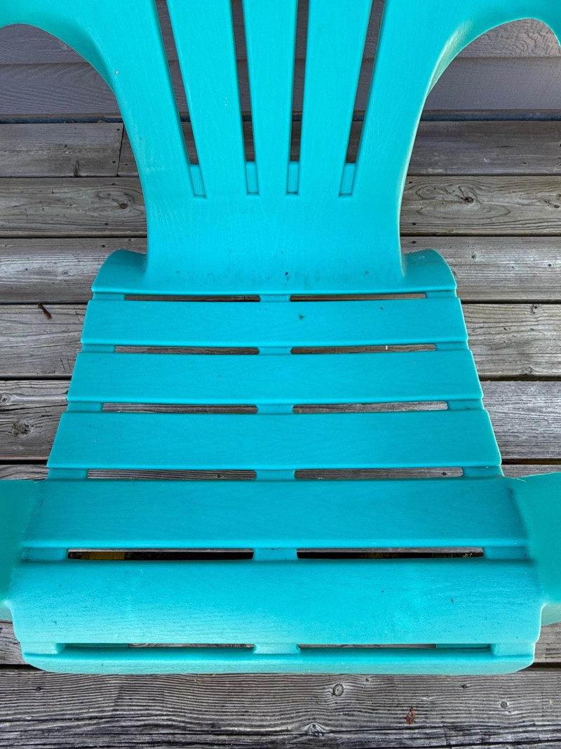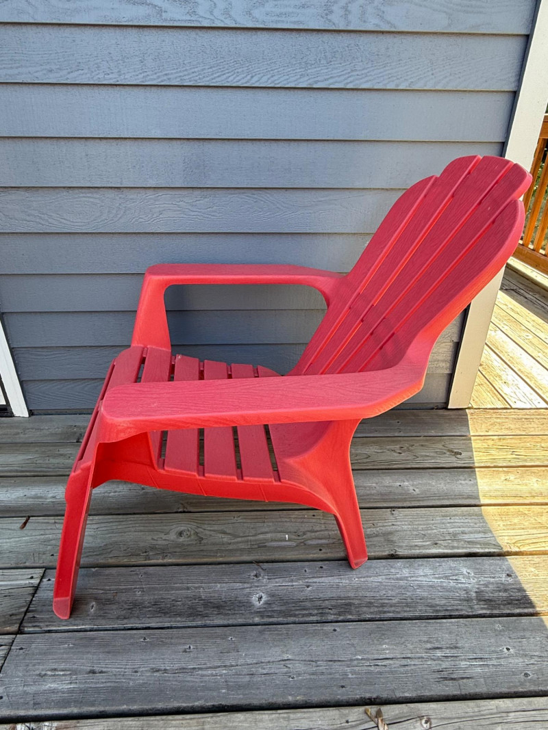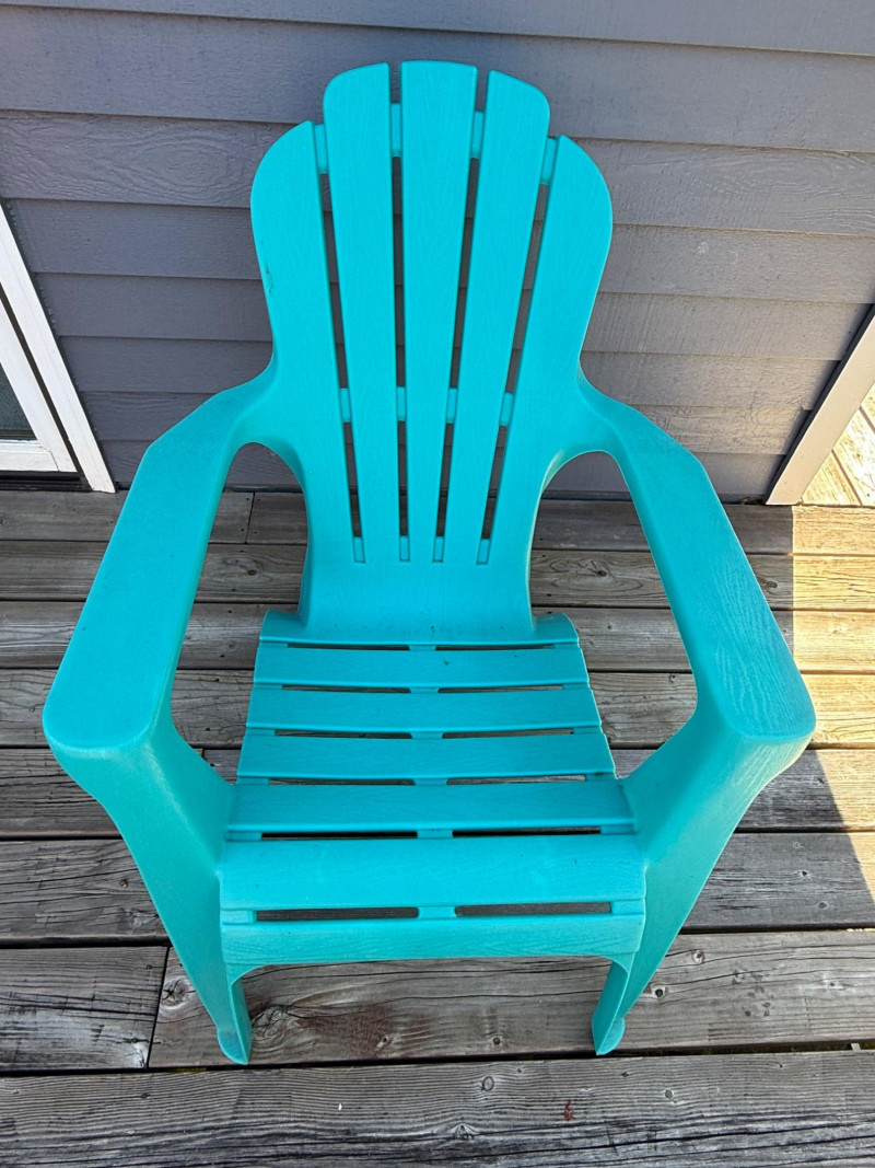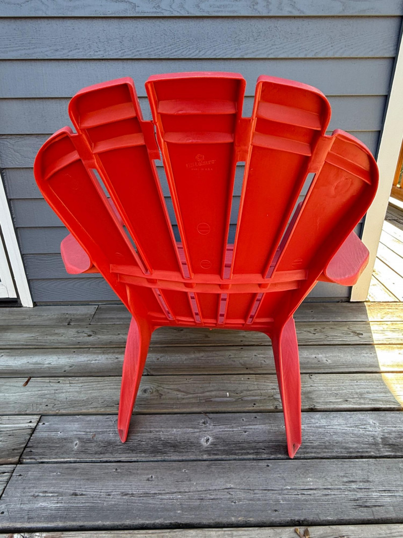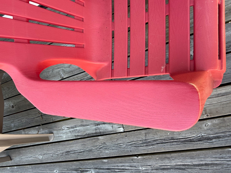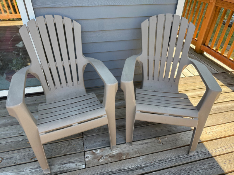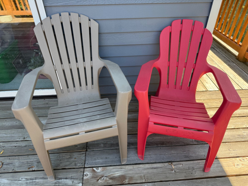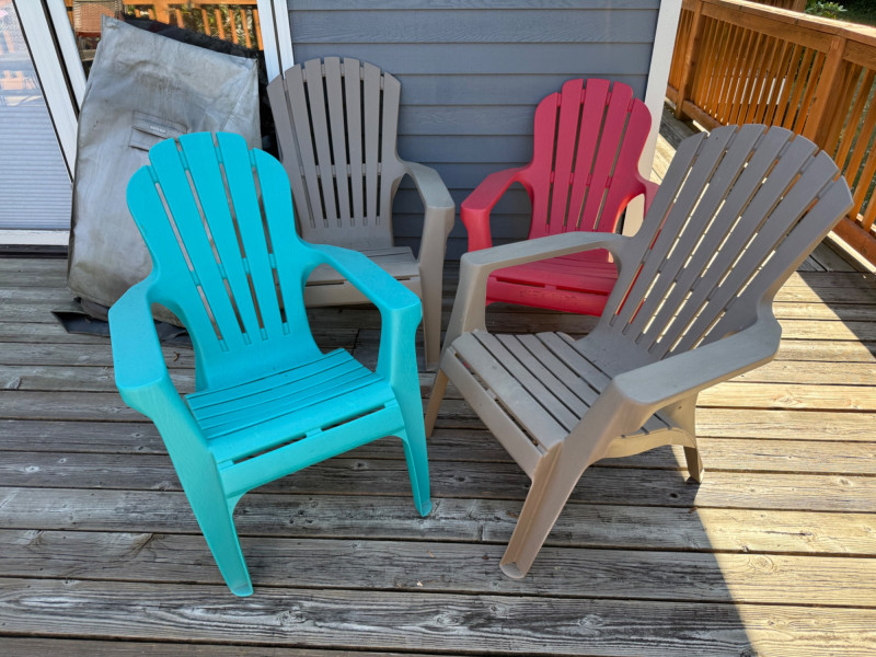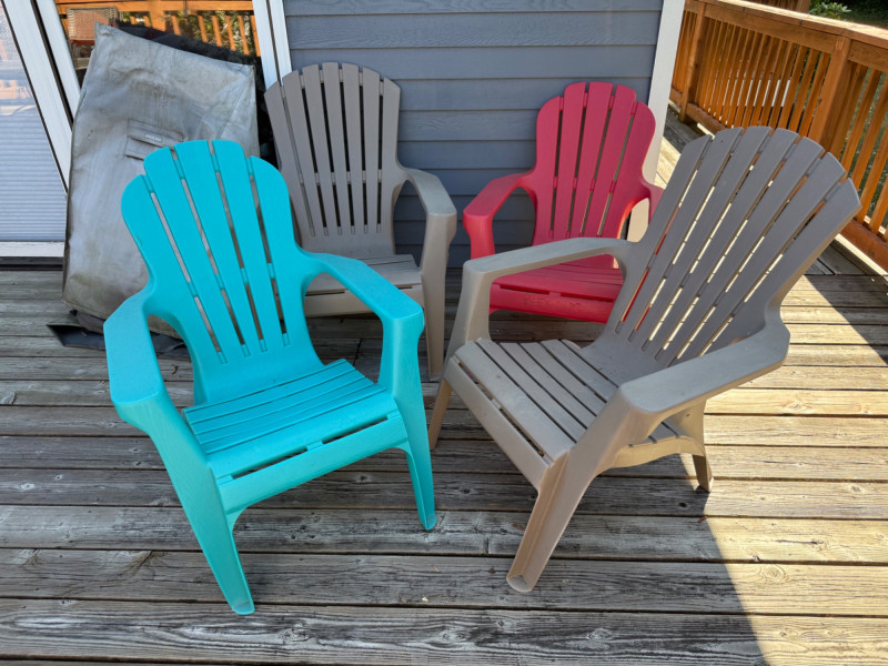 Design Features Molded plastic construction with contoured seat and slatted backrest Includes one red, one turquoise, and two tan chair for lively visual contrast Wide armrests and gently reclined profile for relaxed lounging Dimensions Apprx. (per chair): 33" Length x 28" Width x 33" Height (Tan chairs are slightly larger than colored chairs) Condition
