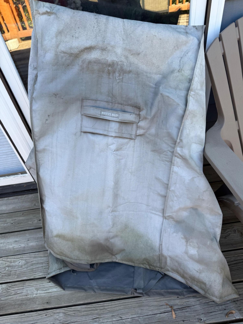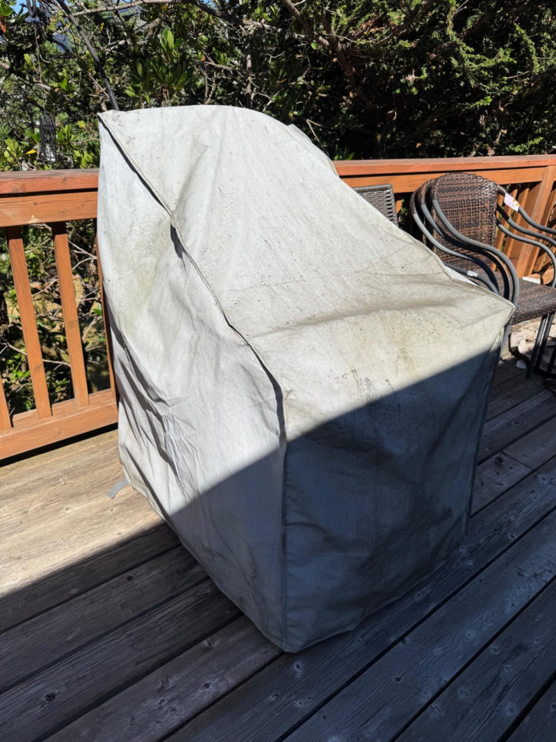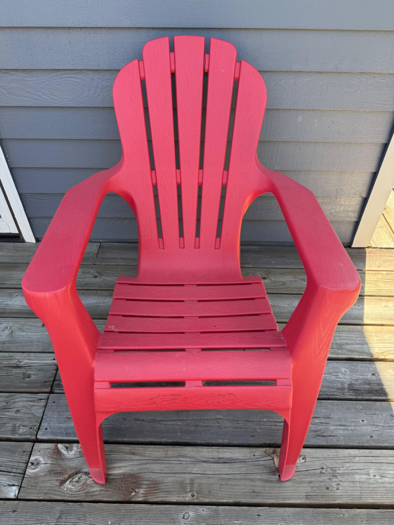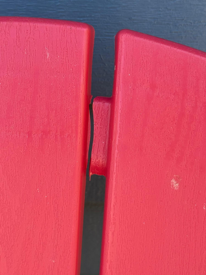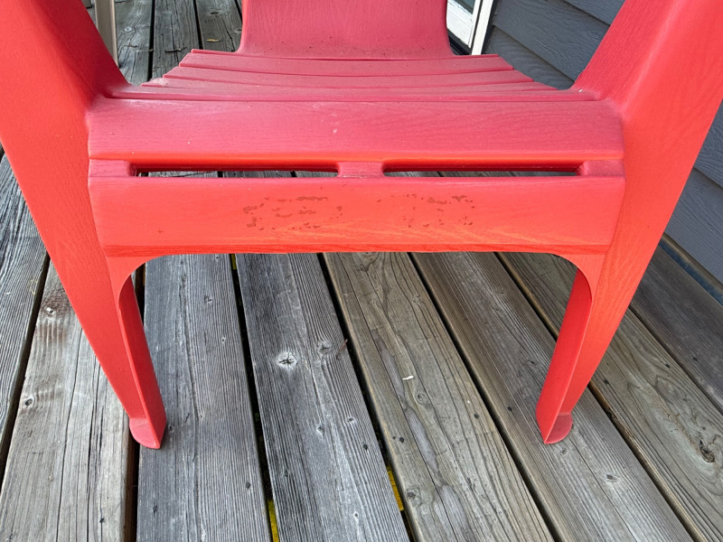 Very good pre-owned condition. Light surface wear consistent with outdoor placement; Red chair has one crack on the headrest. No other structural issues noted. *Note: Cover included