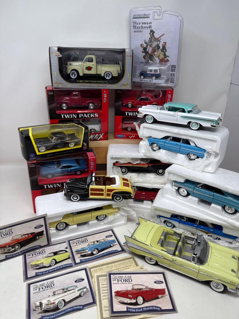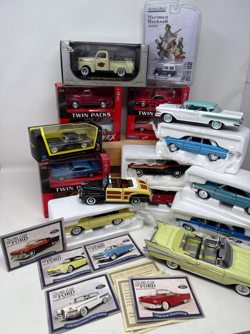 Brand: Assorted major manufacturers. Signature and Welly brands Contents: 17 die-cast model cars Various scales (primarily 1:18 and 1:24) Includes vintage replicas, muscle cars, and limited editions Most items are New in Box (NIB) with original packaging Condition: Excellent overall; boxes show minimal shelf wear No visible damage or discoloration Ideal for collectors or resale