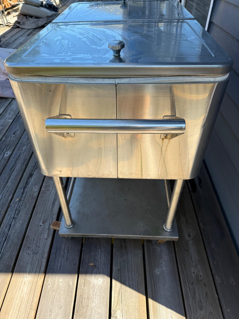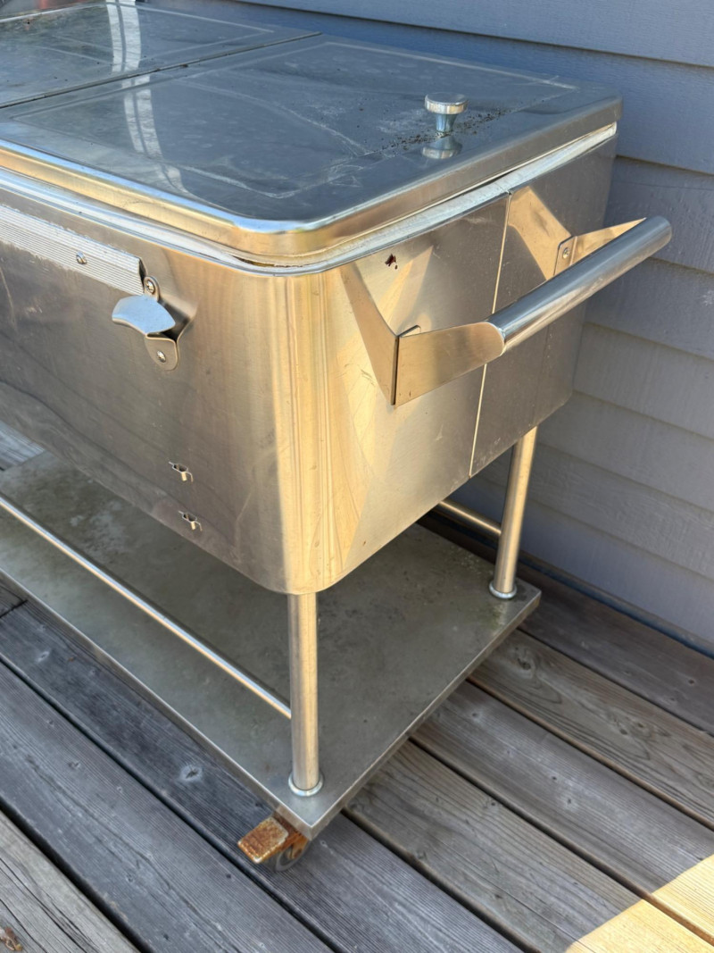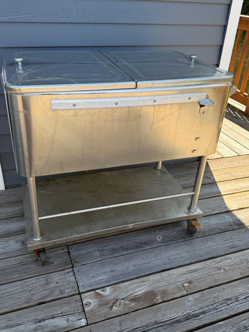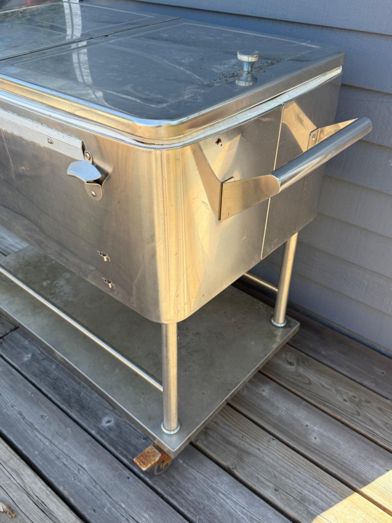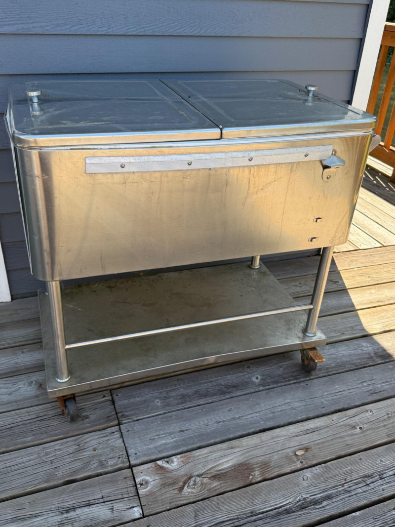 Overview Commercial style rolling cooler in polished stainless steel, designed for both decorative and functional outdoor use. Equipped with modern features in a vintage-inspired presentation, this unit is ideal for entertaining and patio display. Design Features Brushed chrome finish with high-polish trim and flat stainless lid Dual-shelf construction with integrated bottle opener and cap catcher Locking casters and drainage spout for mobility and cleanup Dimensions: 35 inches Tall x 35½ inches Length x 21 inches Width Condition Good pre-owned condition. Seal might need replaced. Light exterior wear; no major dents or corrosion. Casters roll smoothly, all hardware operational.