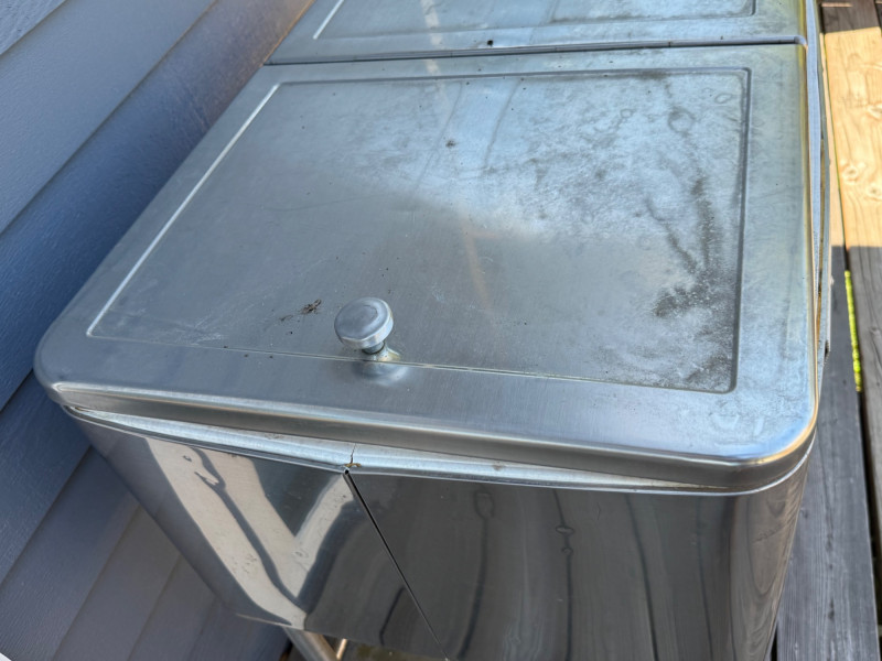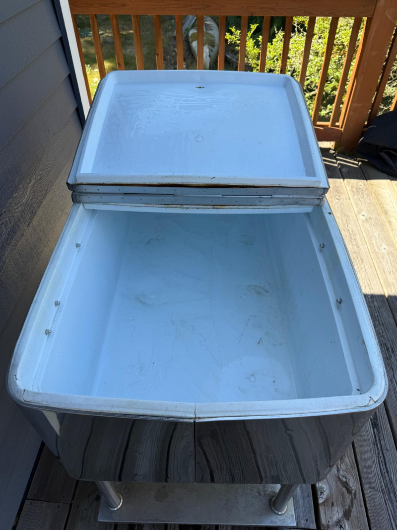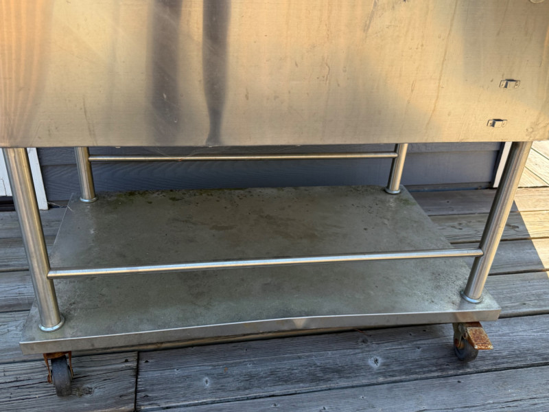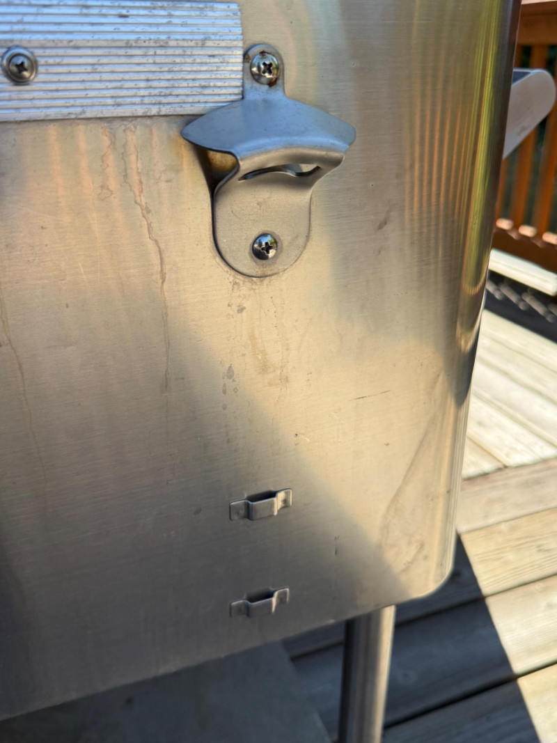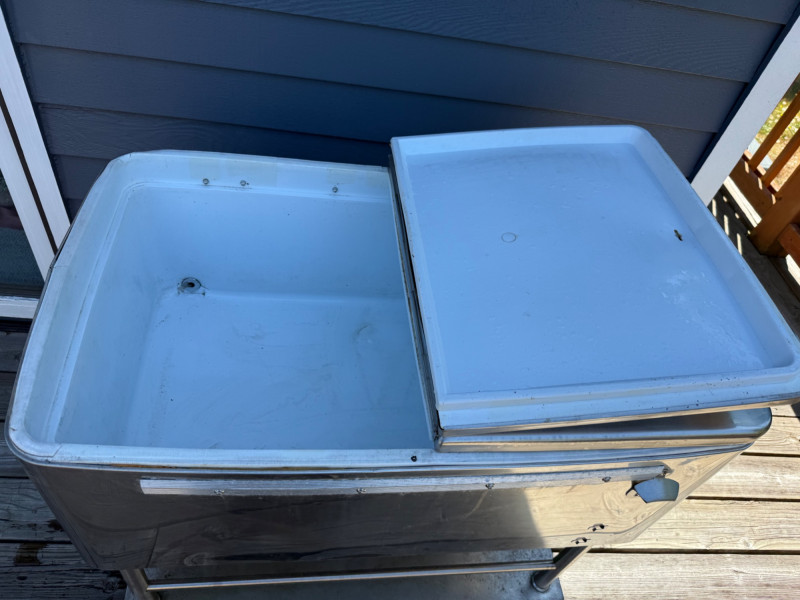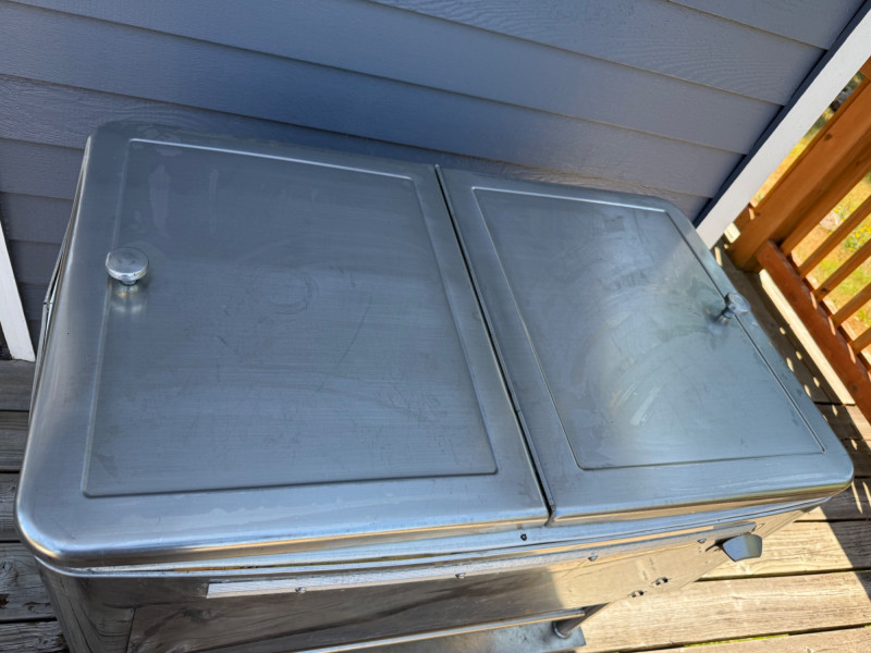 Overview Commercial style rolling cooler in polished stainless steel, designed for both decorative and functional outdoor use. Equipped with modern features in a vintage-inspired presentation, this unit is ideal for entertaining and patio display. Design Features Brushed chrome finish with high-polish trim and flat stainless lid Dual-shelf construction with integrated bottle opener and cap catcher Locking casters and drainage spout for mobility and cleanup Dimensions: 35 inches Tall x 35½ inches Length x 21 inches Width Condition Good pre-owned condition. Seal might need replaced. Light exterior wear; no major dents or corrosion. Casters roll smoothly, all hardware operational.