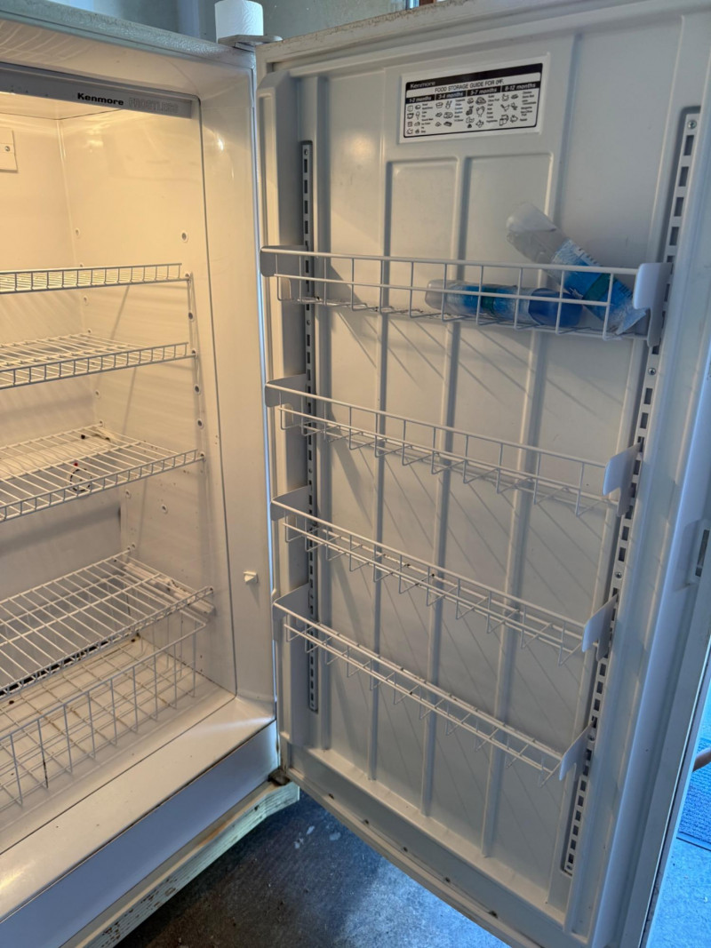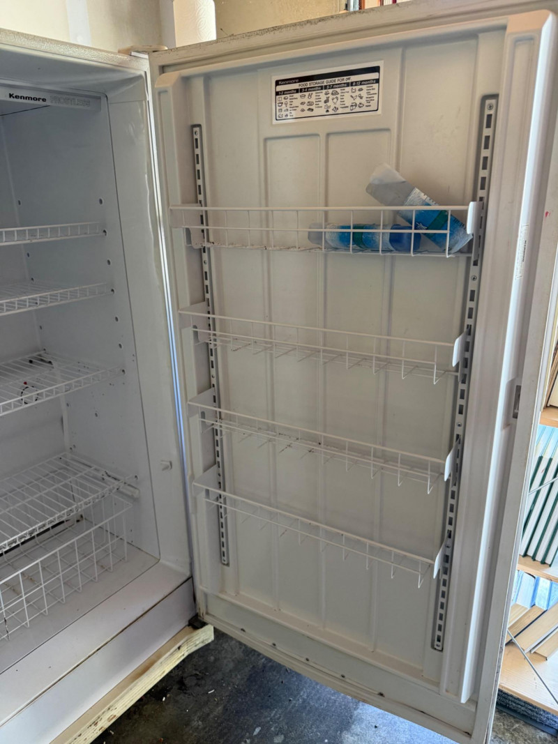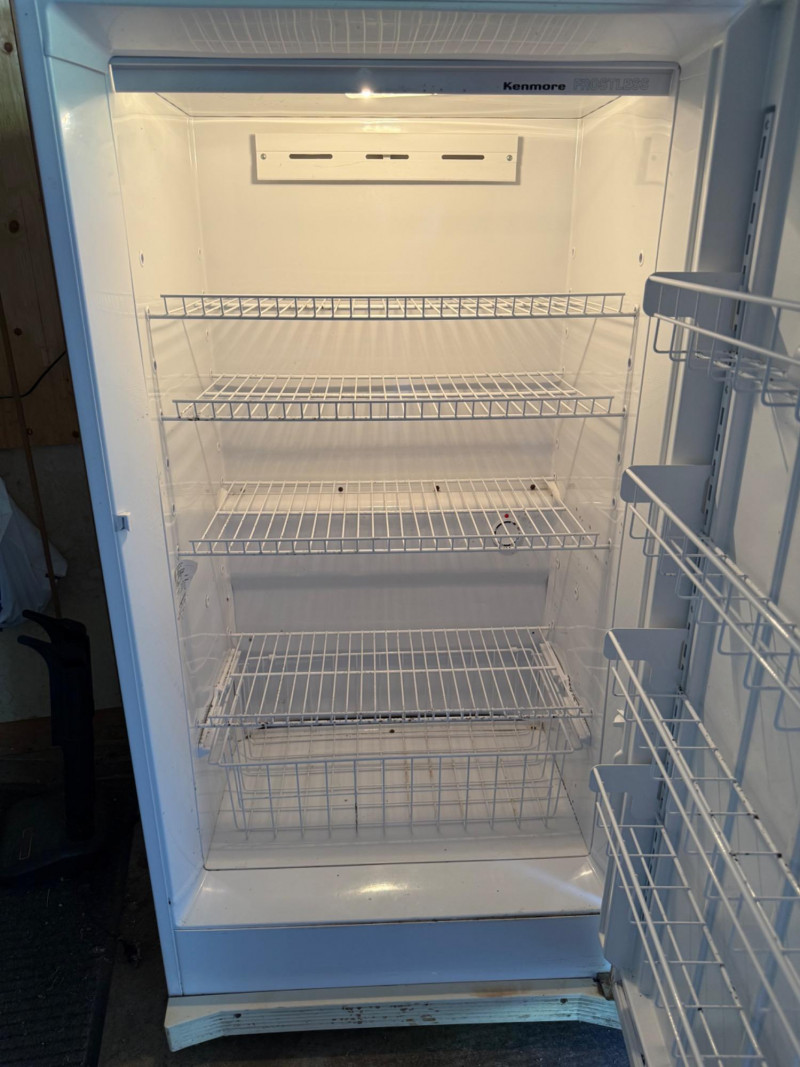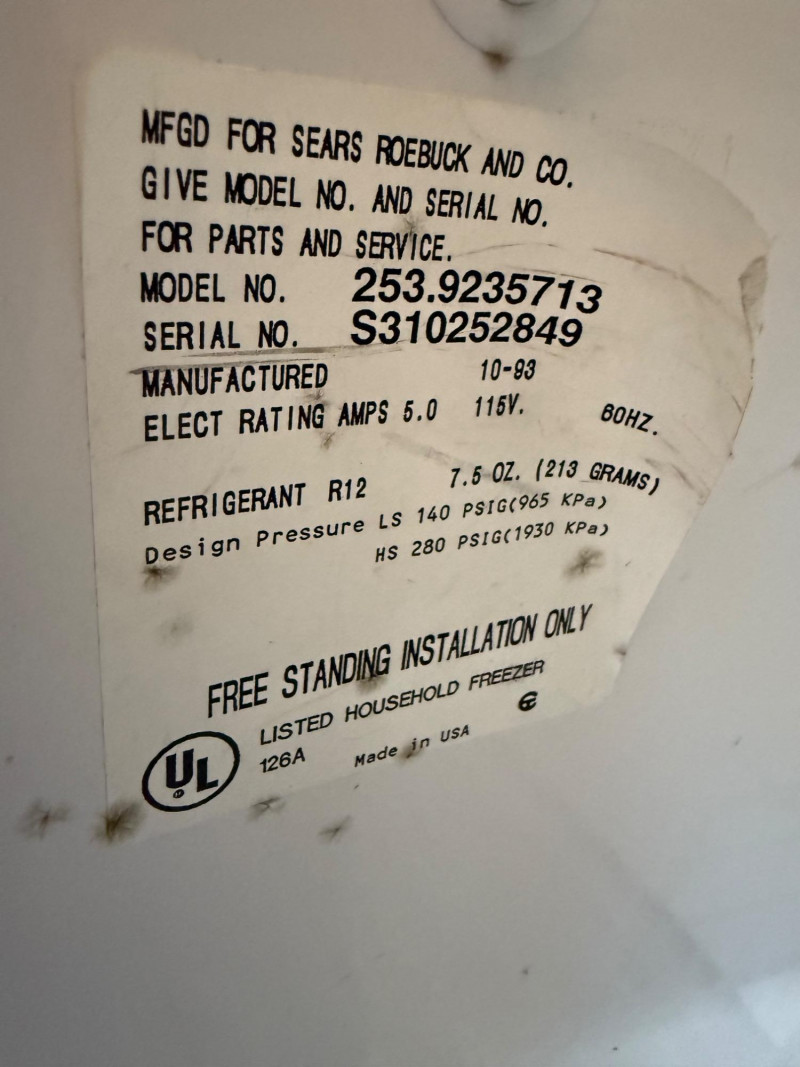 Description: A vintage Sears Roebuck & Co. Kenmore household freezer, manufactured October 1993. This freestanding unit features a UL-listed design and classic white enamel finish. The label confirms: Model:253.9235713 Serial:S310252849 Electrical Rating:5.0 Amps, 115V, 60Hz Refrigerant: R12, 7.5 oz (213 grams) Design Pressure: LS 140 PSIG / HS 280 PSIG Installation: Free-standing only Made in USA Condition: Used, but functional. Has been used recently. Will need cleaned. Small crack on door panel with settings. Doesn't affect use. *Note: Dimensions approximate. Easy load location. Bring equipment and help to load.