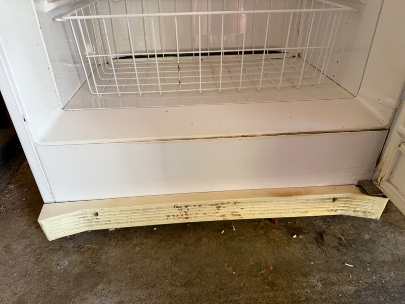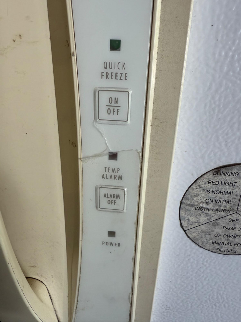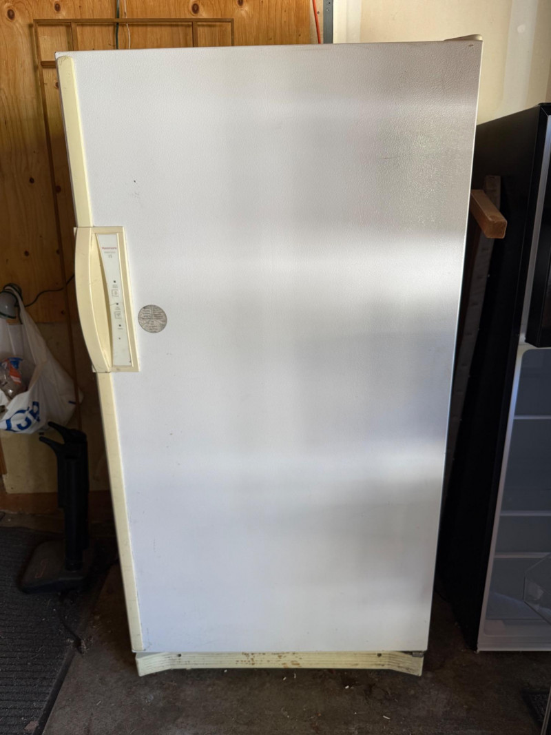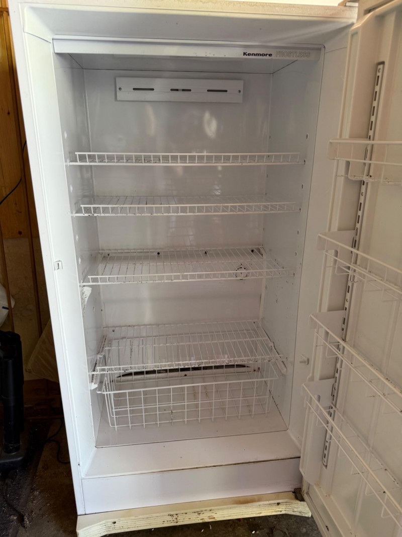 Description: A vintage Sears Roebuck & Co. Kenmore household freezer, manufactured October 1993. This freestanding unit features a UL-listed design and classic white enamel finish. The label confirms: Model:253.9235713 Serial:S310252849 Electrical Rating:5.0 Amps, 115V, 60Hz Refrigerant: R12, 7.5 oz (213 grams) Design Pressure: LS 140 PSIG / HS 280 PSIG Installation: Free-standing only Made in USA Condition: Used, but functional. Has been used recently. Will need cleaned. Small crack on door panel with settings. Doesn't affect use. *Note: Dimensions approximate. Easy load location. Bring equipment and help to load.