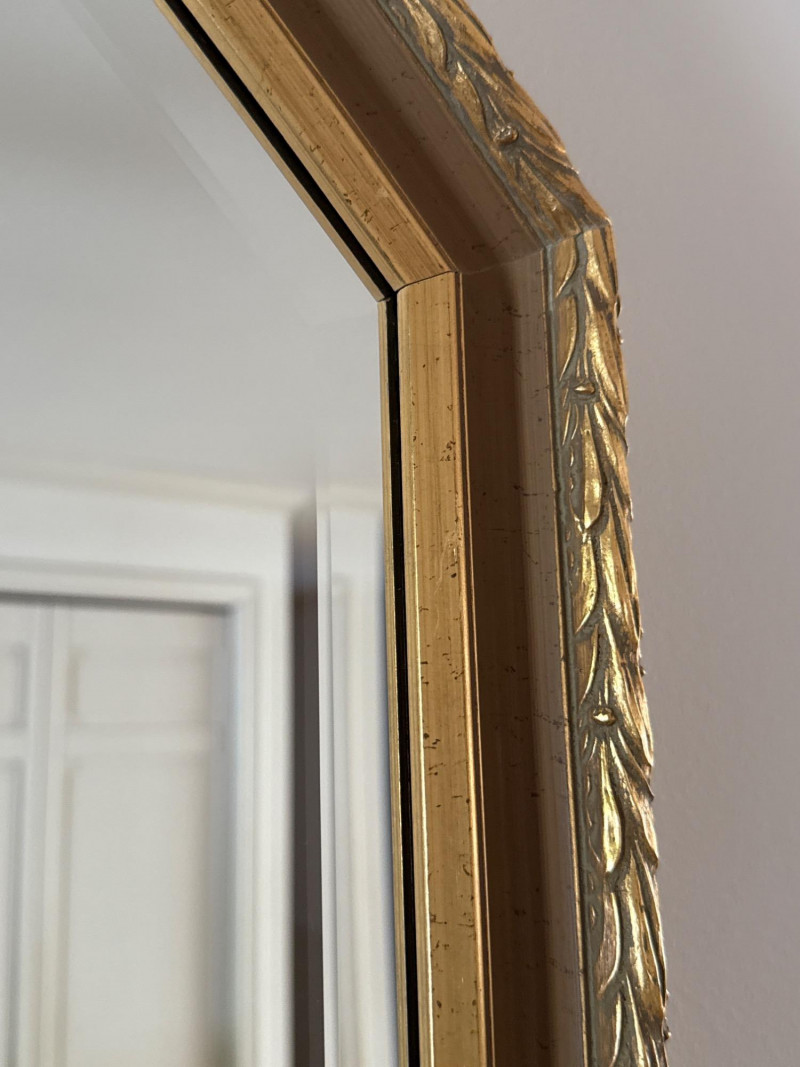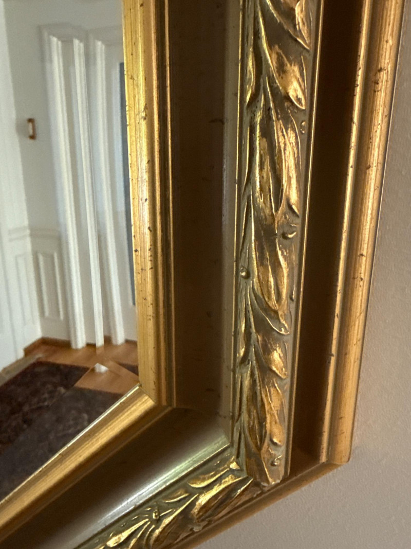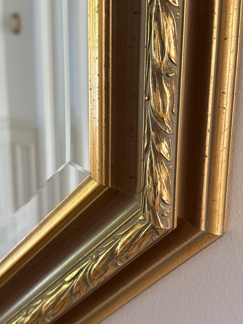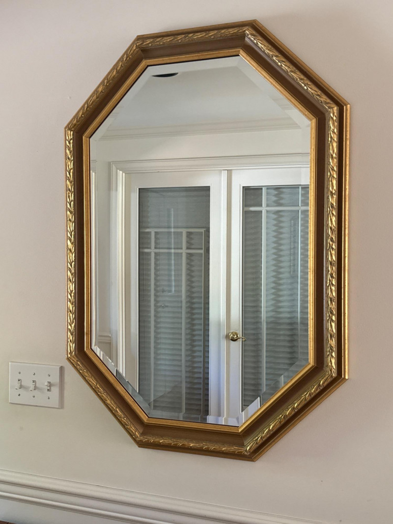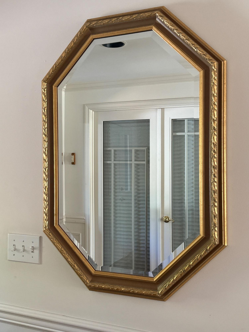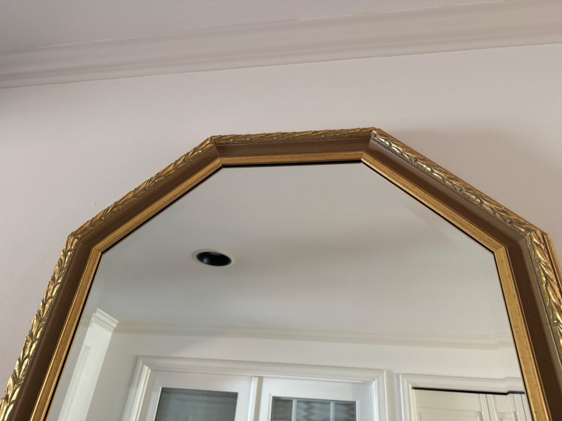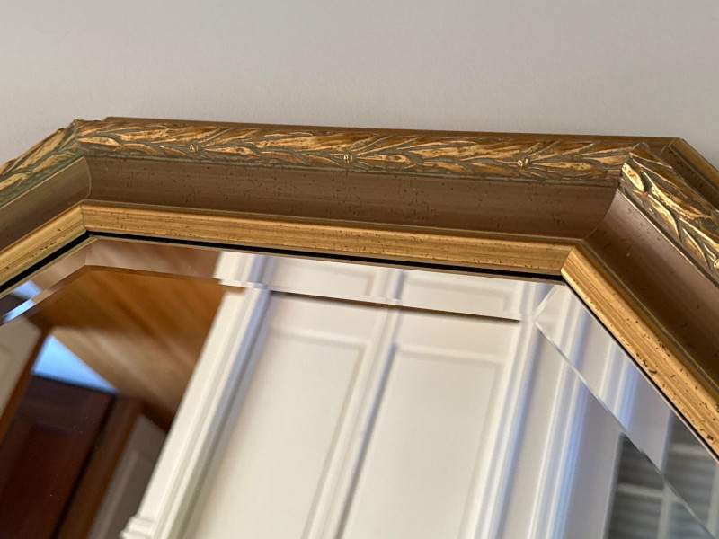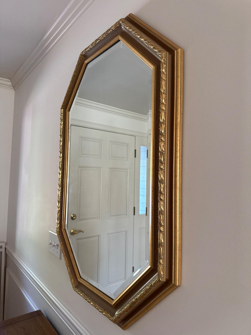Elegantly styled wall mirror featuring an octagonal silhouette and metallic gold-toned frame. A sophisticated accent piece suitable for entryways, dressing areas, or vintage-themed interiors. Design Features Octagonal mirror with bevelled glass detailing Ornate gold-painted frame with subtle texturing and classic decorative trim Rear mounting hardware included (not verified for condition) Dimensions: 28" Width x 40" Length