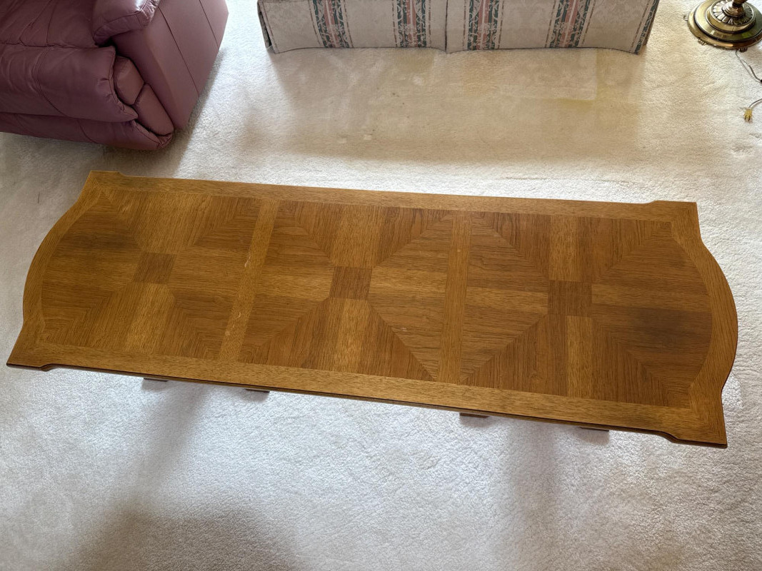 Coffee Table: Length: 67 inches Width: 23 inches Height: 16.5 inches Side Table: Length: 19 inches Width: 19 inches Height: 21 inches Condition: