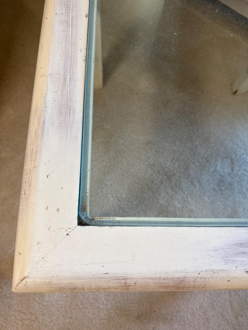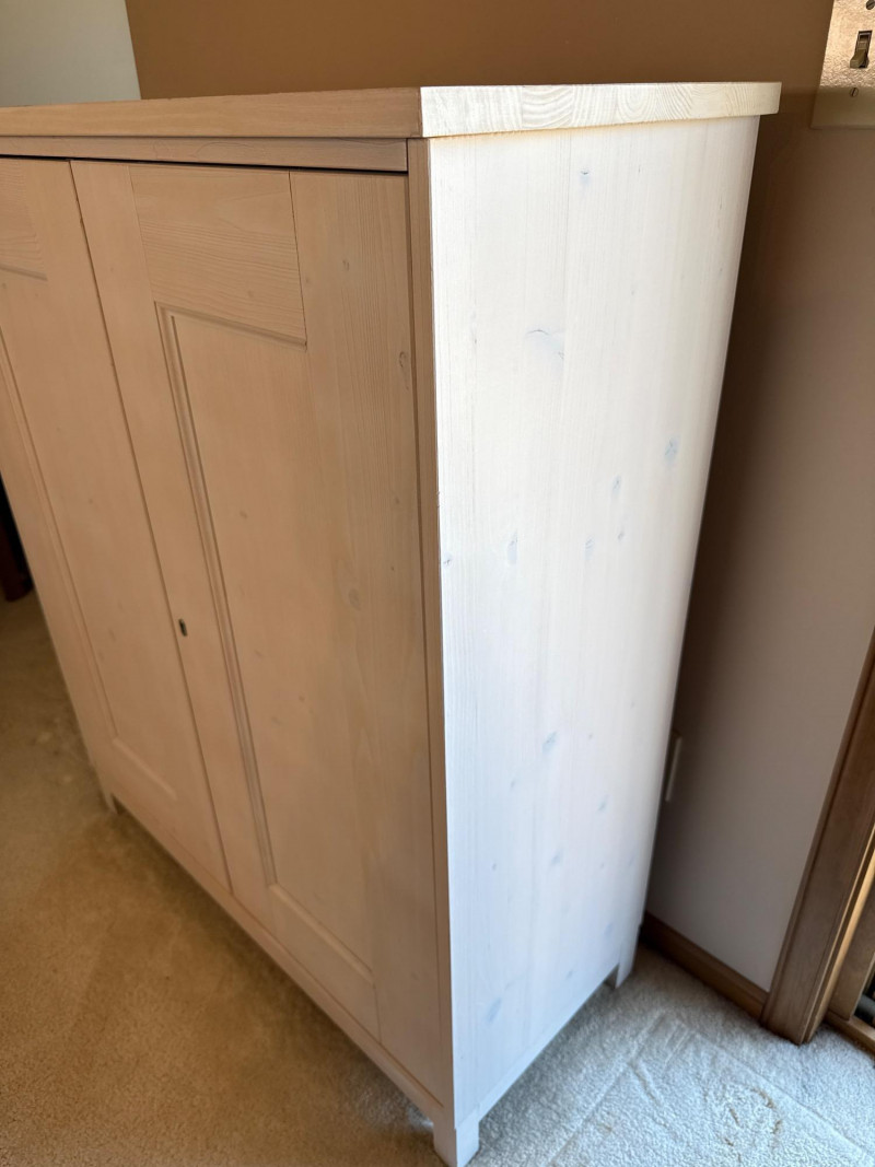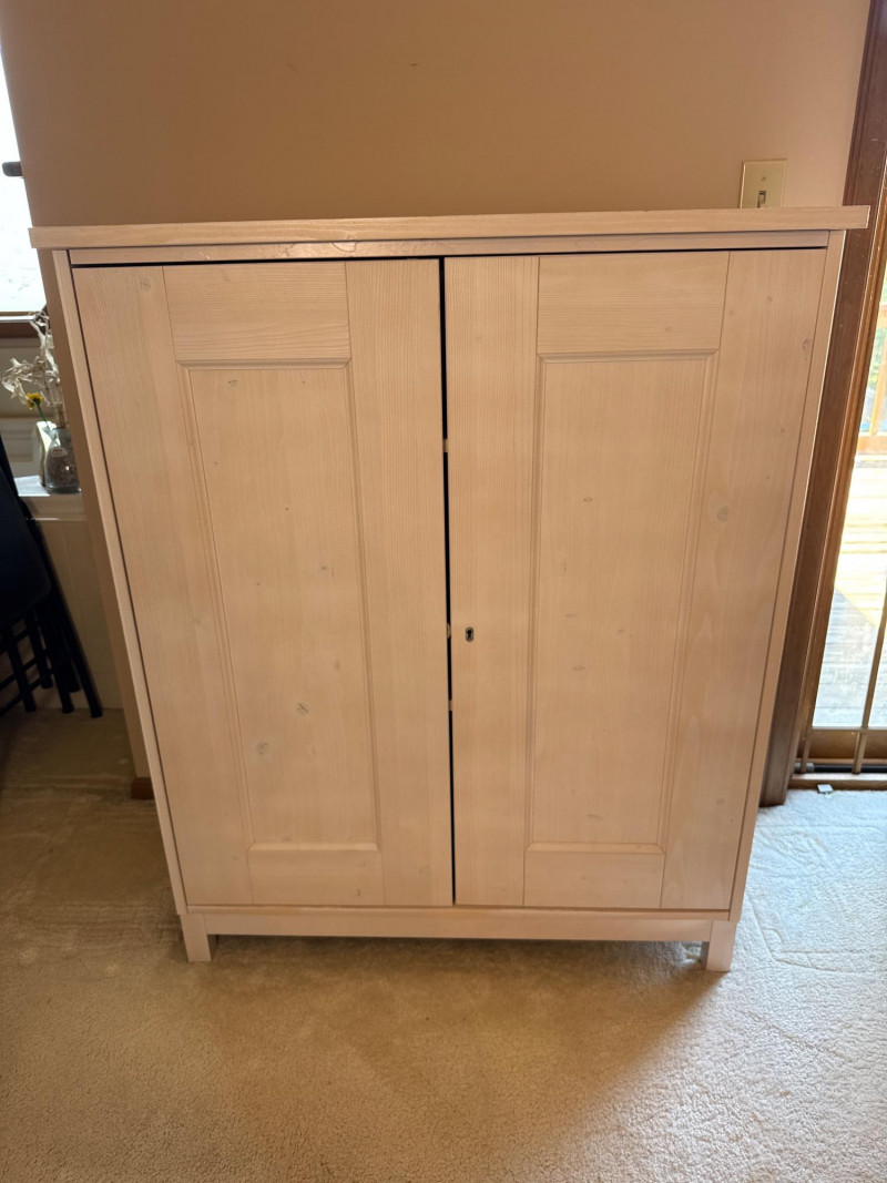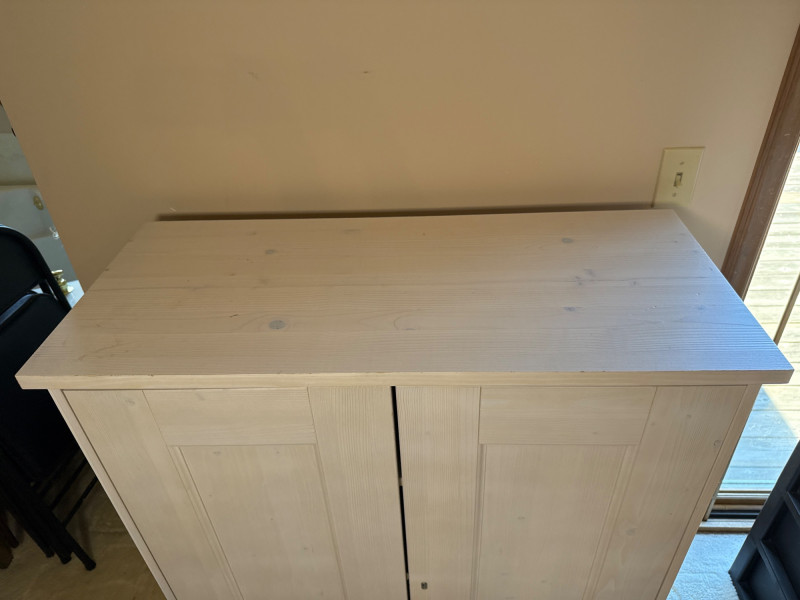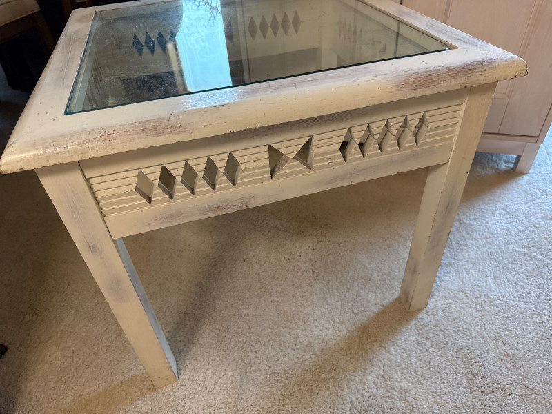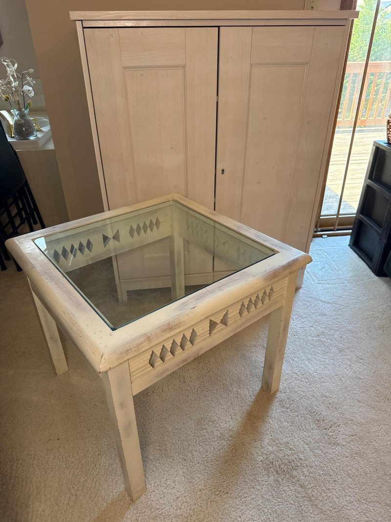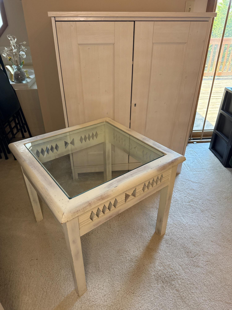 Contents: (1) Two-door cabinet with interior shelving (1) Whitewashed Southwestern theme wood and glass end table Dimensions: Cabinet: Approx. 36.5" L × 16" W × 44.5" H End Table: Approx. 25" W × 22" H Condition: Good vintage condition with light surface wear consistent with age Whitewash finish shows gentle distressing for added character Hardware intact and functional; doors and drawer open smoothly.