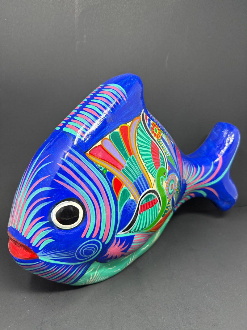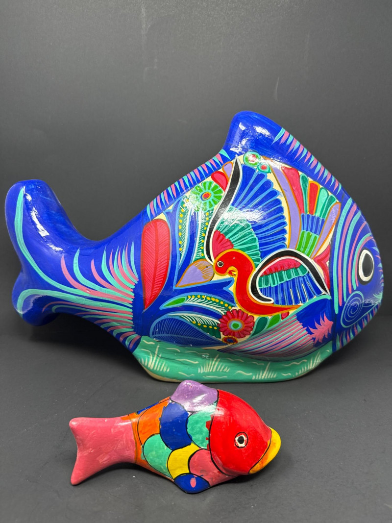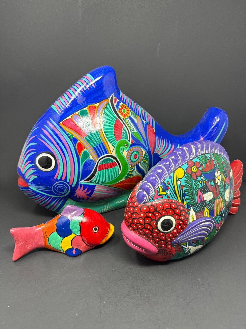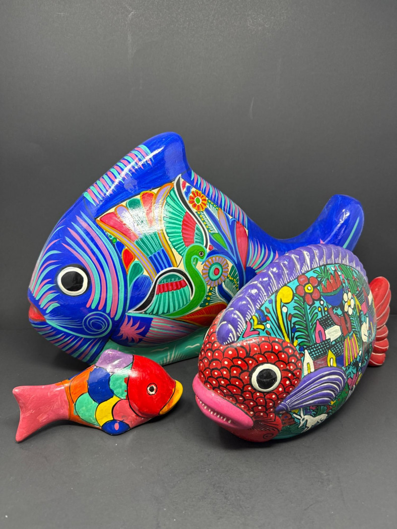 Colorful trio of hand-crafted ceramic fish, designed in traditional Talavera style with bold, expressive color schemes. Each piece showcases distinctive Mexican folk art patterns and serves as a striking decorative accent. Design Features Set includes three pottery fish of varying sizes; largest measures 18" in length Brightly painted in vibrant blue, red, and green tones with floral and scroll motifs Molded fish forms with raised tails and stylized facial features Glossy glazed finish enhances depth and color vibrancy Approximate dimensions: Largest – 18"L x 13"T x 6"W; others smaller in scale Condition