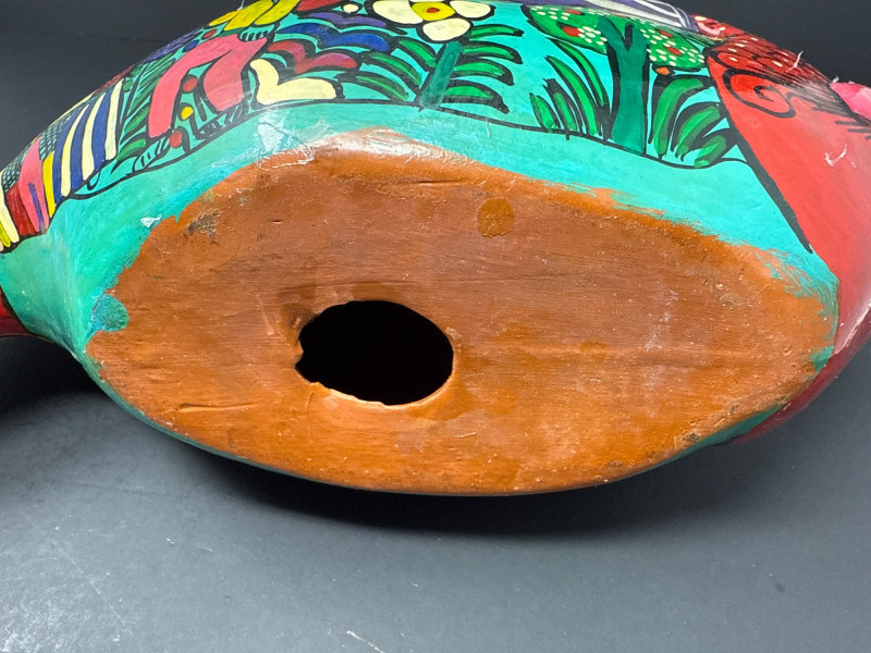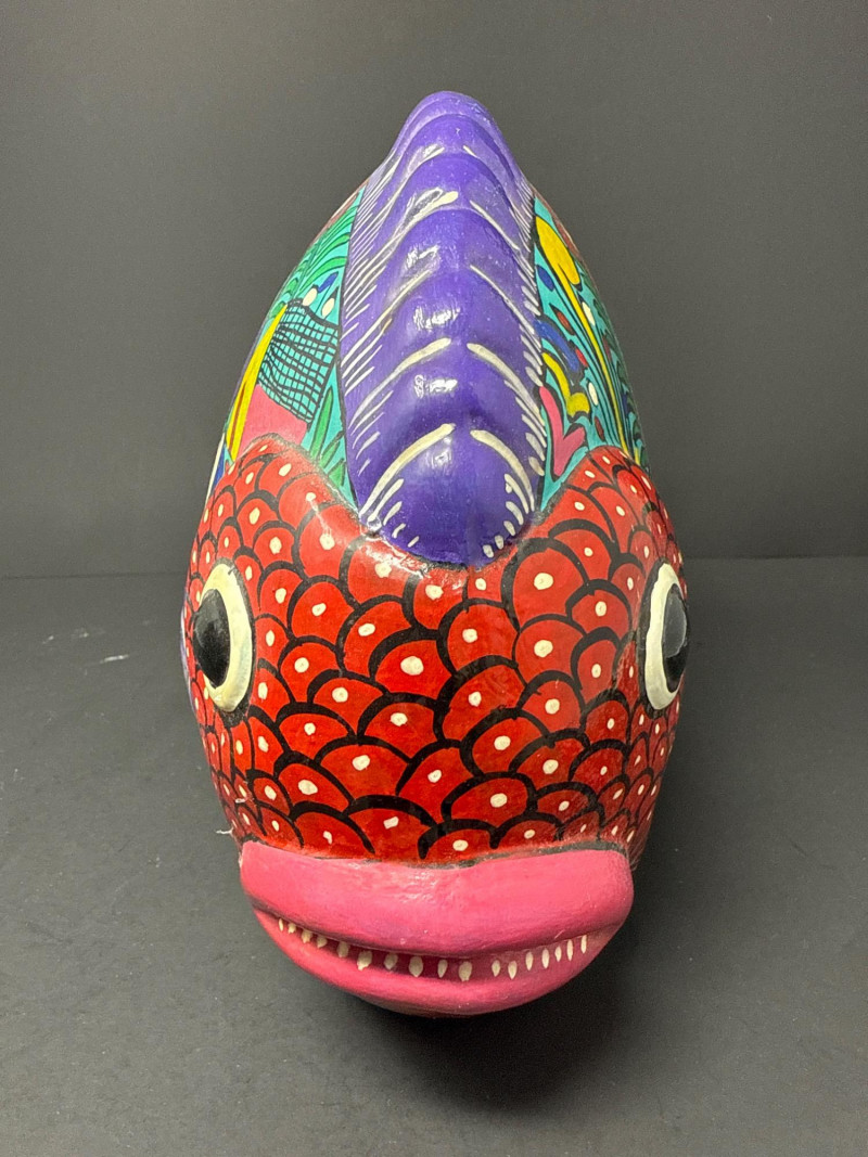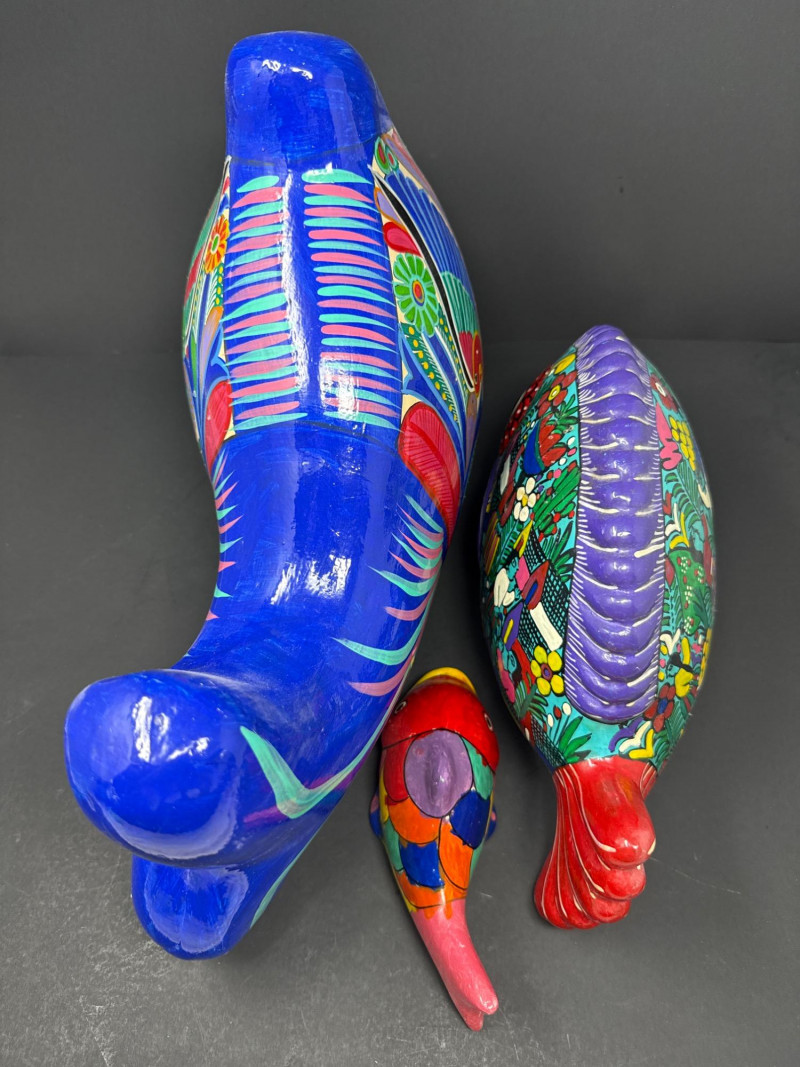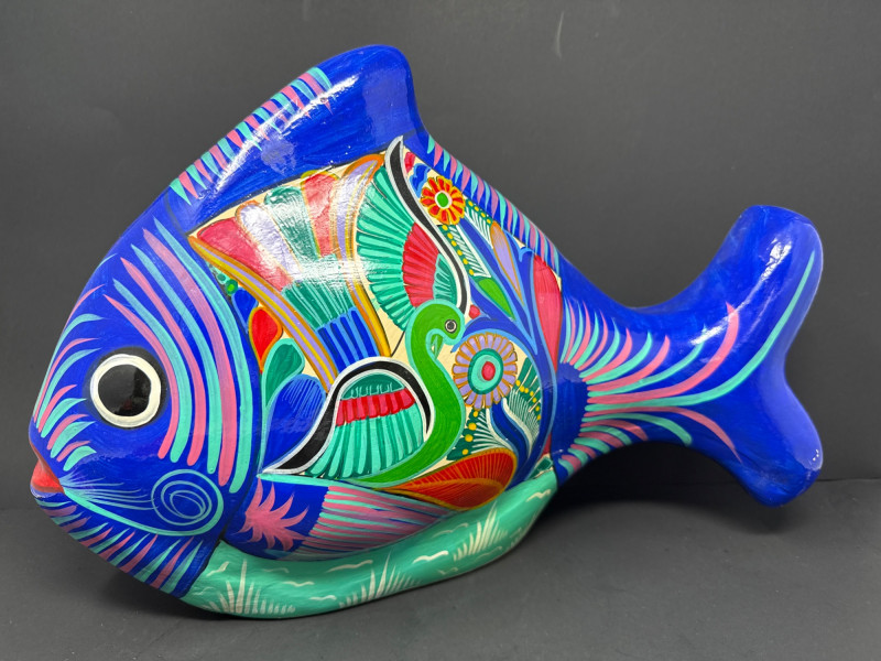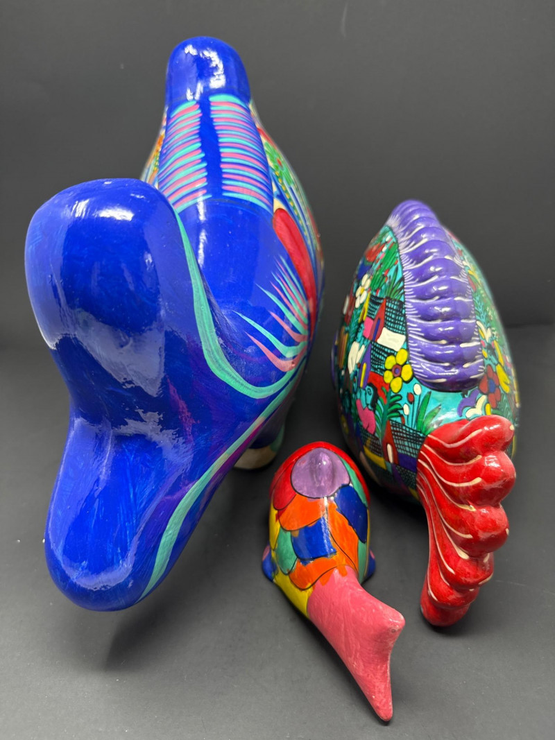 Colorful trio of hand-crafted ceramic fish, designed in traditional Talavera style with bold, expressive color schemes. Each piece showcases distinctive Mexican folk art patterns and serves as a striking decorative accent. Design Features Set includes three pottery fish of varying sizes; largest measures 18" in length Brightly painted in vibrant blue, red, and green tones with floral and scroll motifs Molded fish forms with raised tails and stylized facial features Glossy glazed finish enhances depth and color vibrancy Approximate dimensions: Largest – 18"L x 13"T x 6"W; others smaller in scale Condition