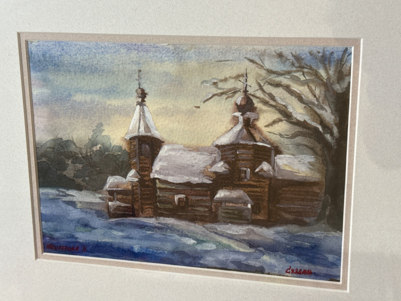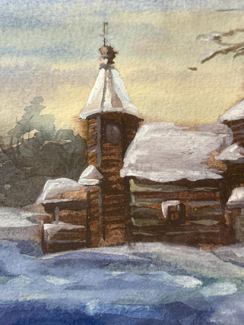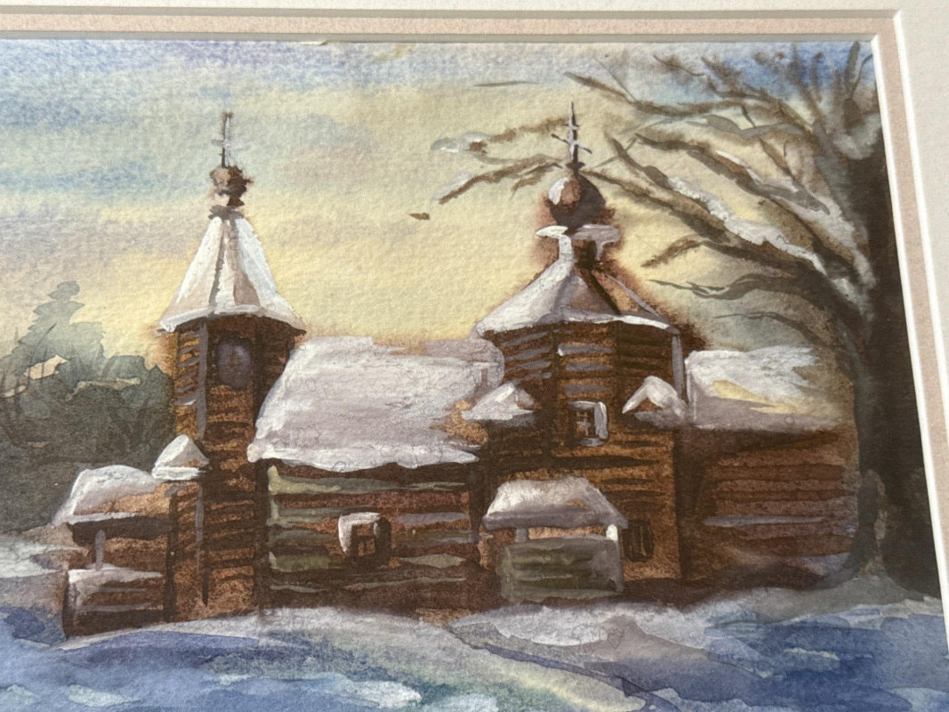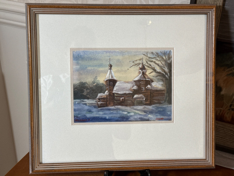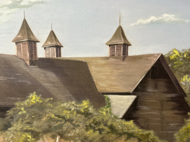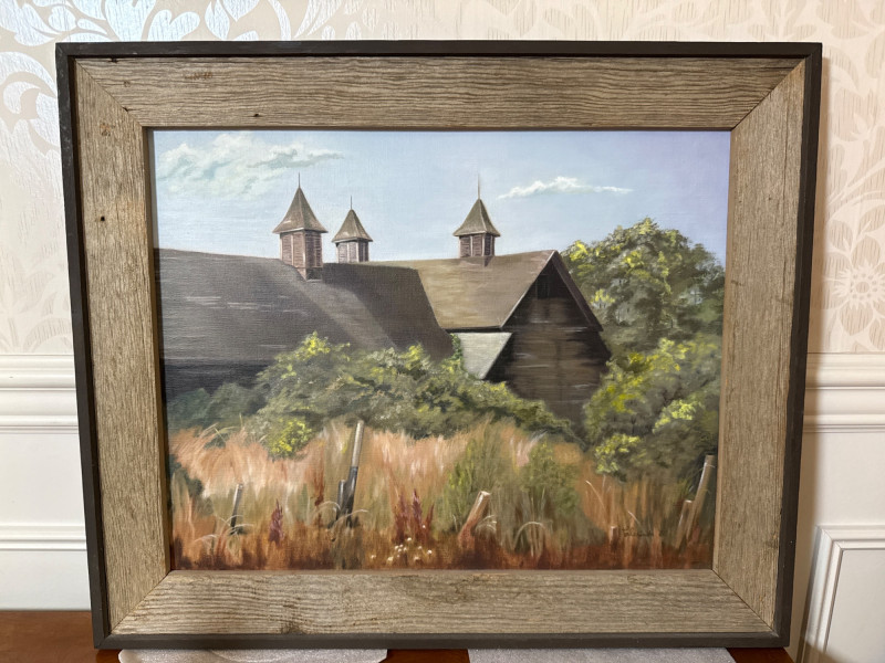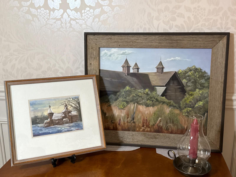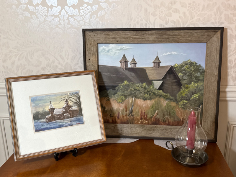 Contents: (2) Framed vintage homestead-themed prints, each depicting pastoral rural scenes with charming architectural and landscape details. Print with ornate log construction is from Russia (1) Metal candle lamp with glass chimney, styled in a traditional farmhouse aesthetic Dimensions: Prints (each): approx. 15" W × 14" H and 25"W x 21"H Candle Lamp: approx. 7" W × 9.5" H