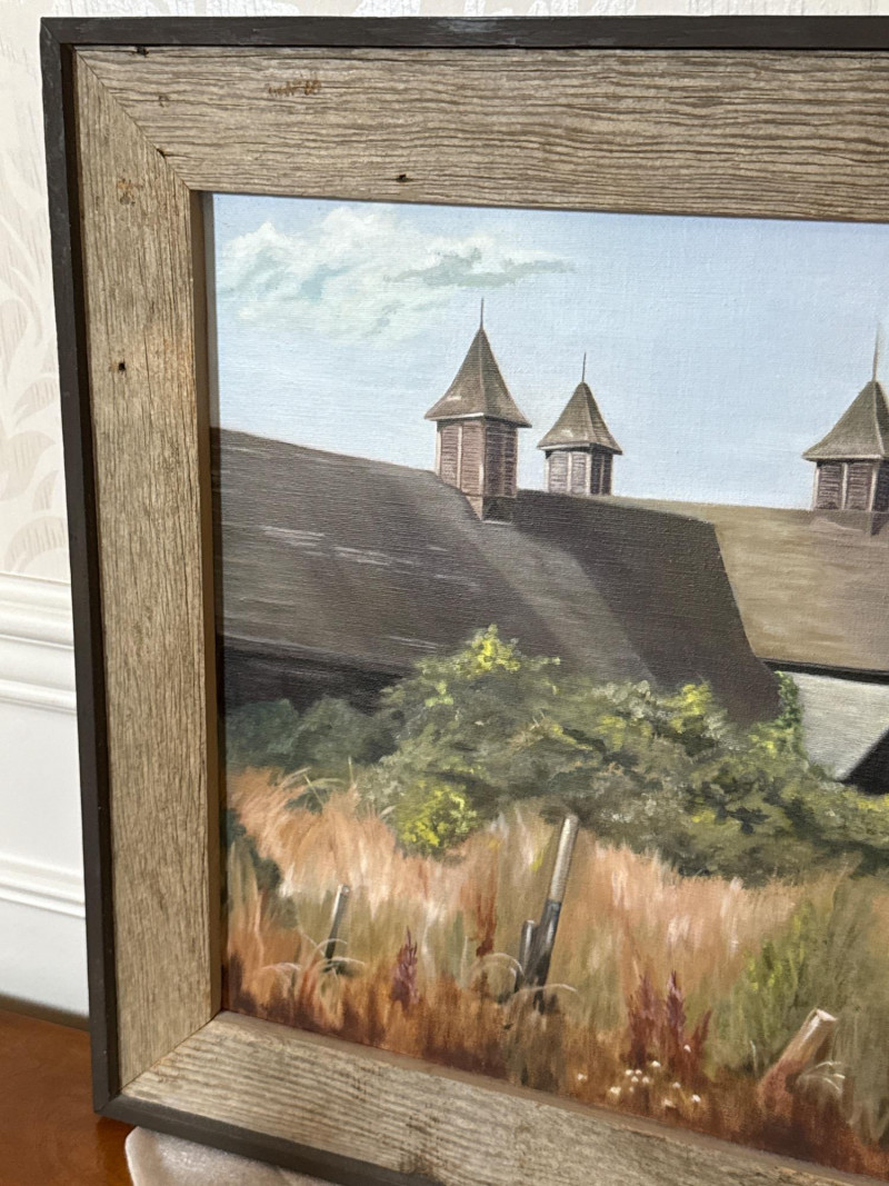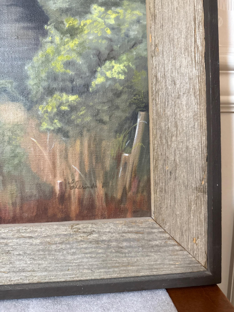 A nostalgic trio evoking the warmth of country living. The two vintage prints feature idyllic homestead scenes rendered in soft, muted tones, each housed in complementary wooden frames. Accompanying them is a classic candle lamp with a metal base and clear glass chimney—perfect for adding a rustic accent to any space. Together, these pieces offer timeless charm and decorative versatility for cottagecore enthusiasts or vintage collectors. Artist: Unknown