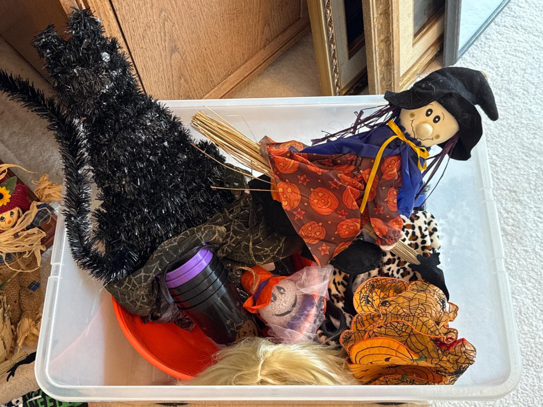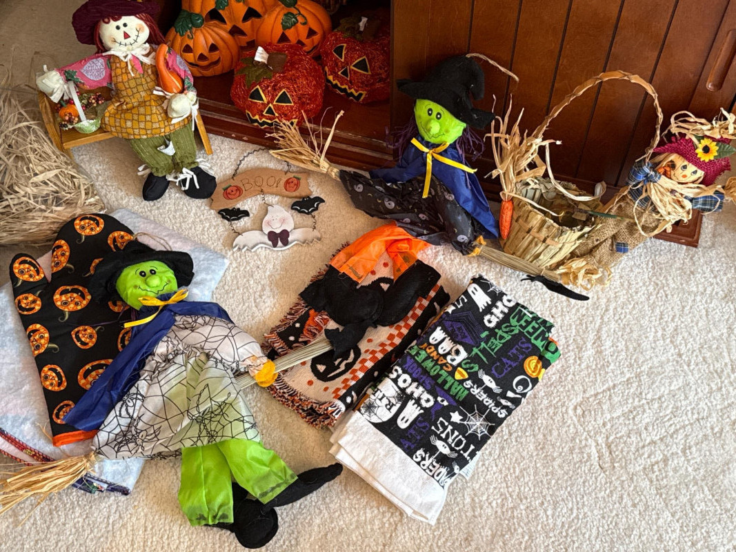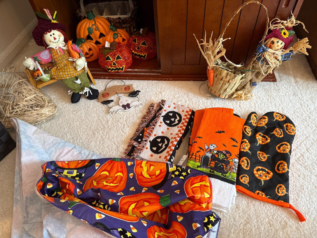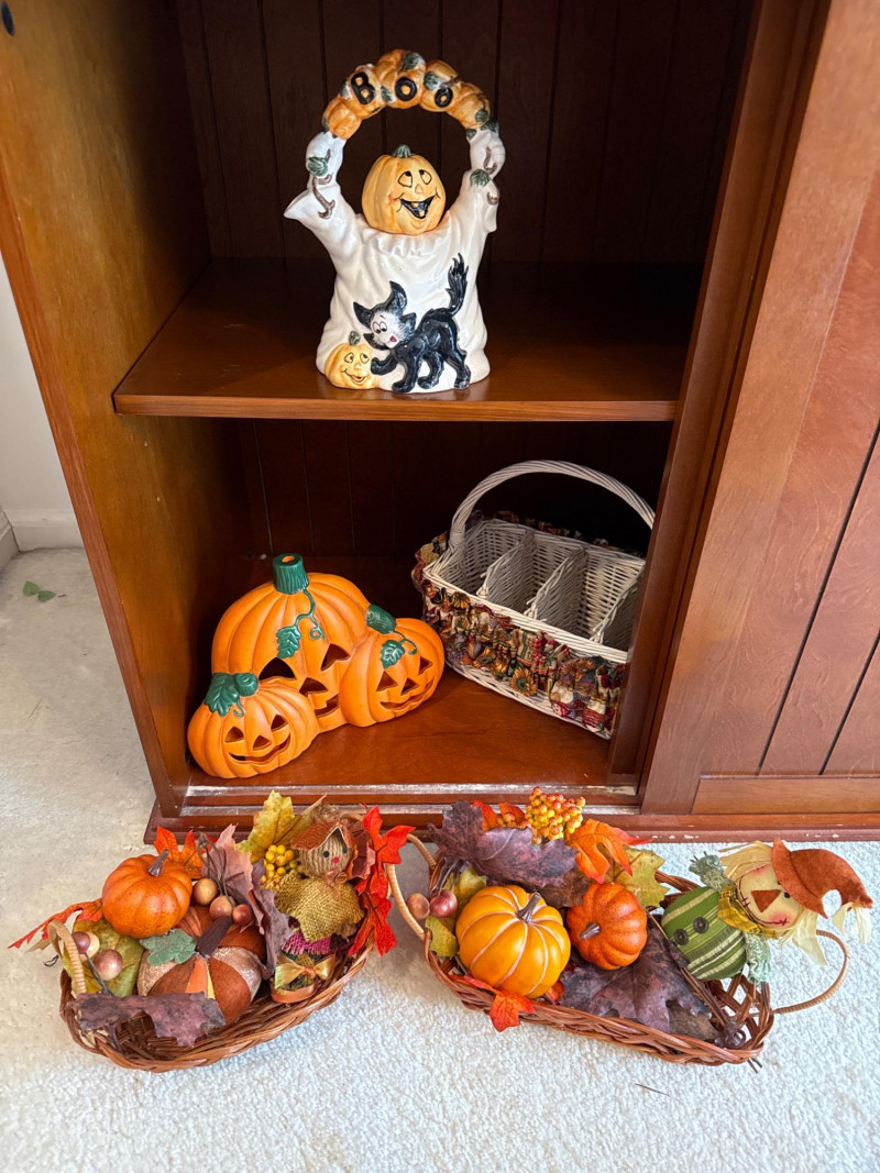 This festive lot includes a curated assortment of autumn-themed and Halloween items, ideal for seasonal decorating or costume fun. While the specific contents aren't listed the pictures will provide details: Harvest Decor: Faux pumpkins, gourds, and fall foliage garlands Tabletop arrangements or centerpieces, candles, s/p shakers, napkin holder, dish cloths Rustic signage or themed decor. Halloween Decor: Hanging ghosts, witches, or skeletons Tree skirt, figurines, ceramic and wood figures Trick-or-treat buckets or party props Adult and/or children’s costumes (possibly vintage or novelty) Accessories like masks, hats, wigs, or makeup kitsCostumes:Contents: