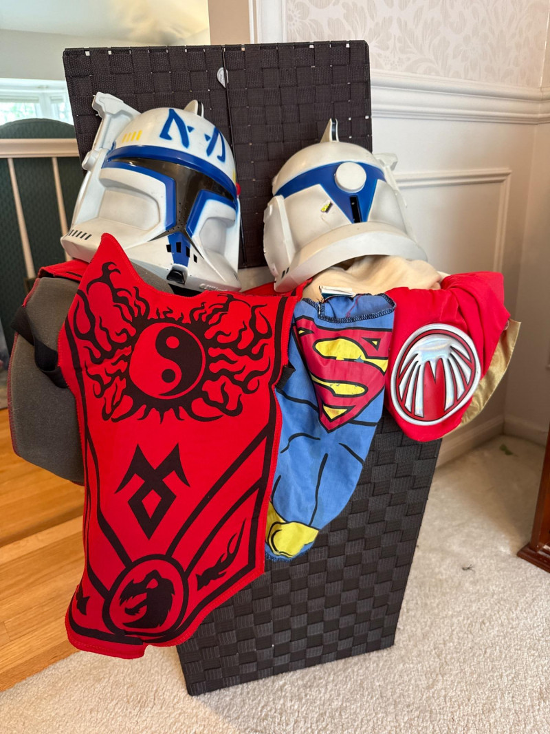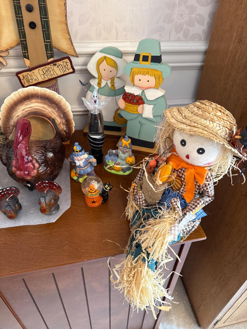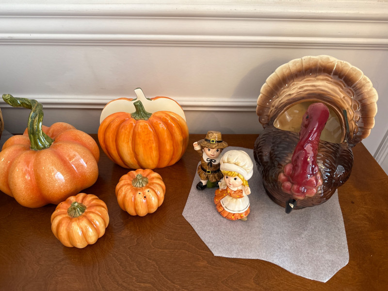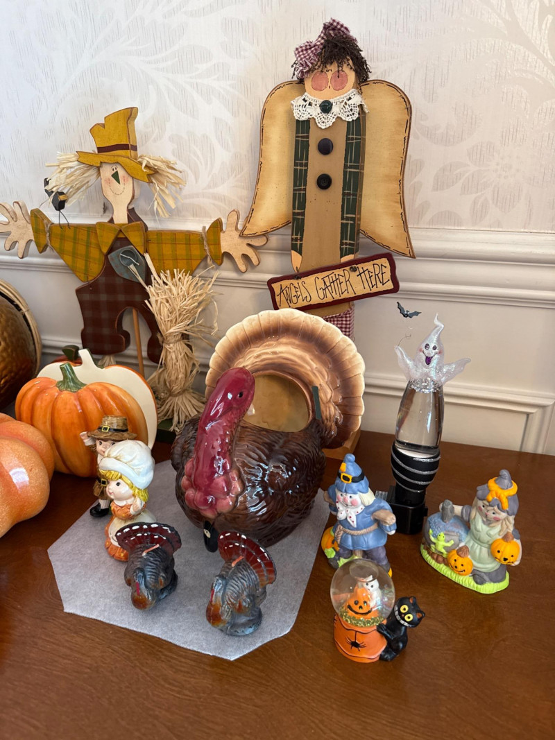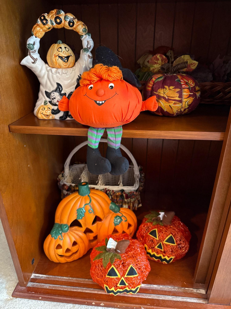 This festive lot includes a curated assortment of autumn-themed and Halloween items, ideal for seasonal decorating or costume fun. While the specific contents aren't listed the pictures will provide details: Harvest Decor: Faux pumpkins, gourds, and fall foliage garlands Tabletop arrangements or centerpieces, candles, s/p shakers, napkin holder, dish cloths Rustic signage or themed decor. Halloween Decor: Hanging ghosts, witches, or skeletons Tree skirt, figurines, ceramic and wood figures Trick-or-treat buckets or party props Adult and/or children’s costumes (possibly vintage or novelty) Accessories like masks, hats, wigs, or makeup kitsCostumes:Contents:
