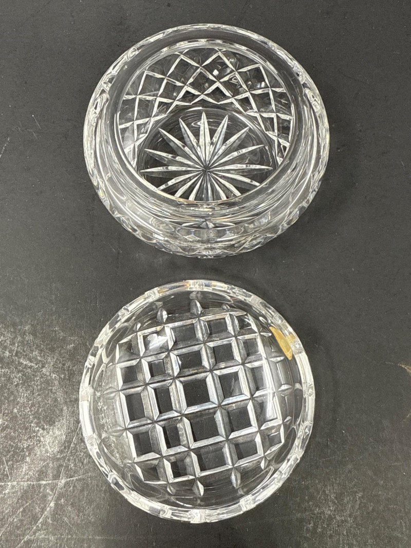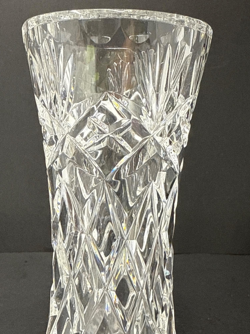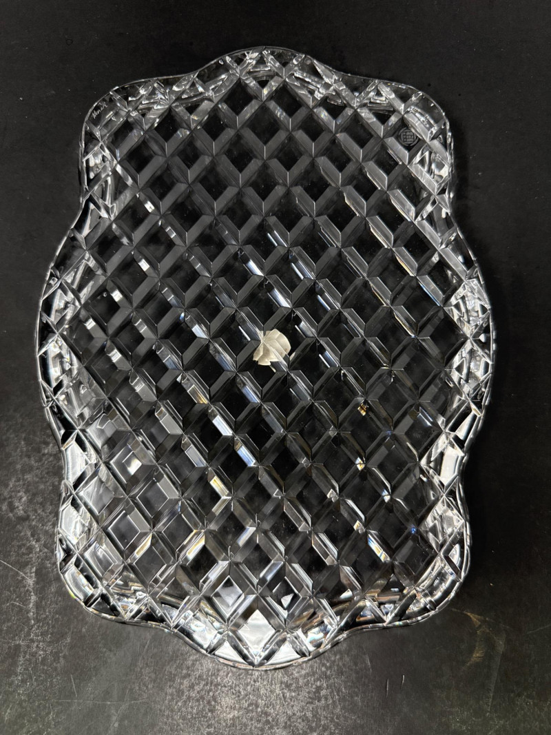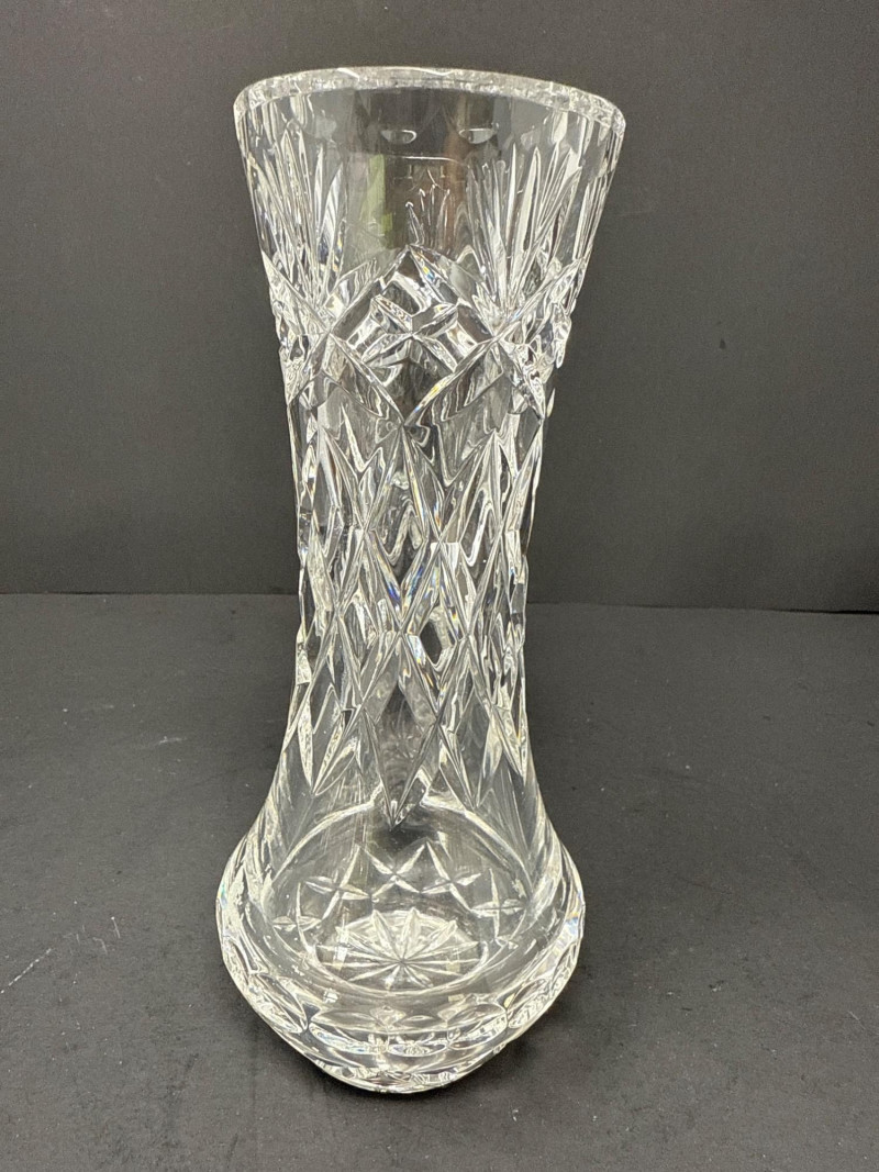 Style: Classic cut crystal with elegant, timeless appeal—ideal for formal dining or decorative display. Included Pieces: Crystal Vase Height: 7.2 inches Diameter: 3 inches Sleek silhouette with vertical cuts for light-catching brilliance Lidded Sugar Bowl Height: 3 inches Diameter: 4 inches Rounded form with matching lid, perfect for serving or display Rectangular Tray Length: 11 inches Width: 8.2 inches Flat base with raised edges, ideal for serving or showcasing the set Condition: