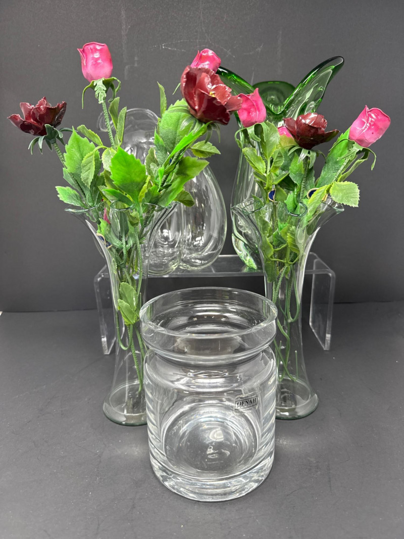 A charming mixed lot featuring decorative vases and ceramic floral accents, ideal for display or gifting. Contents & Brands: Heavy green glass vase – substantial and classic, with a smooth finish Fluted pumpkin-style vase – ribbed design, warm-toned glass Aynsley long-stem ceramic roses – delicate ceramic blooms with plastic stems. Fine ceramic, branded, known for quality craftsmanship Ofnah modern crystal vase – Refined with clean and simple design Two matching fluted flower vases – elegant shape with green-tint to glass Dimensions: Green glass vase: 9.75″ H × 6.5″ W Pumpkin-style vase: 8″ H × 6″ W Ofnah vase: 6″ H × 4.5″ W Other vases: dimensions not specified, but appear similarly sized Condition: