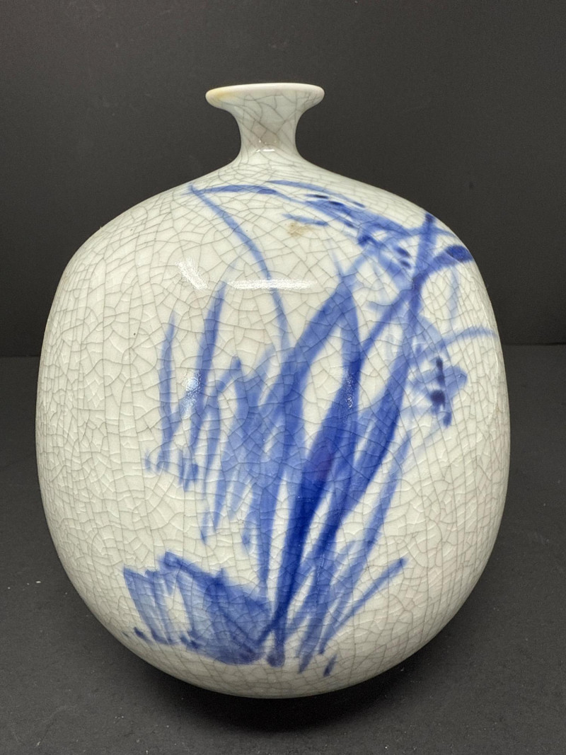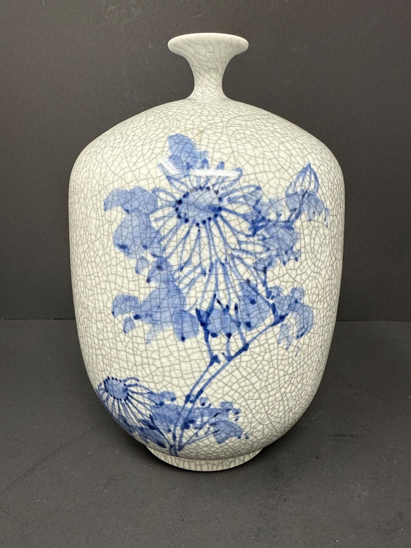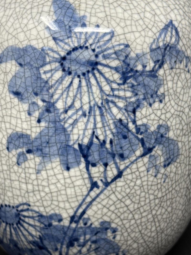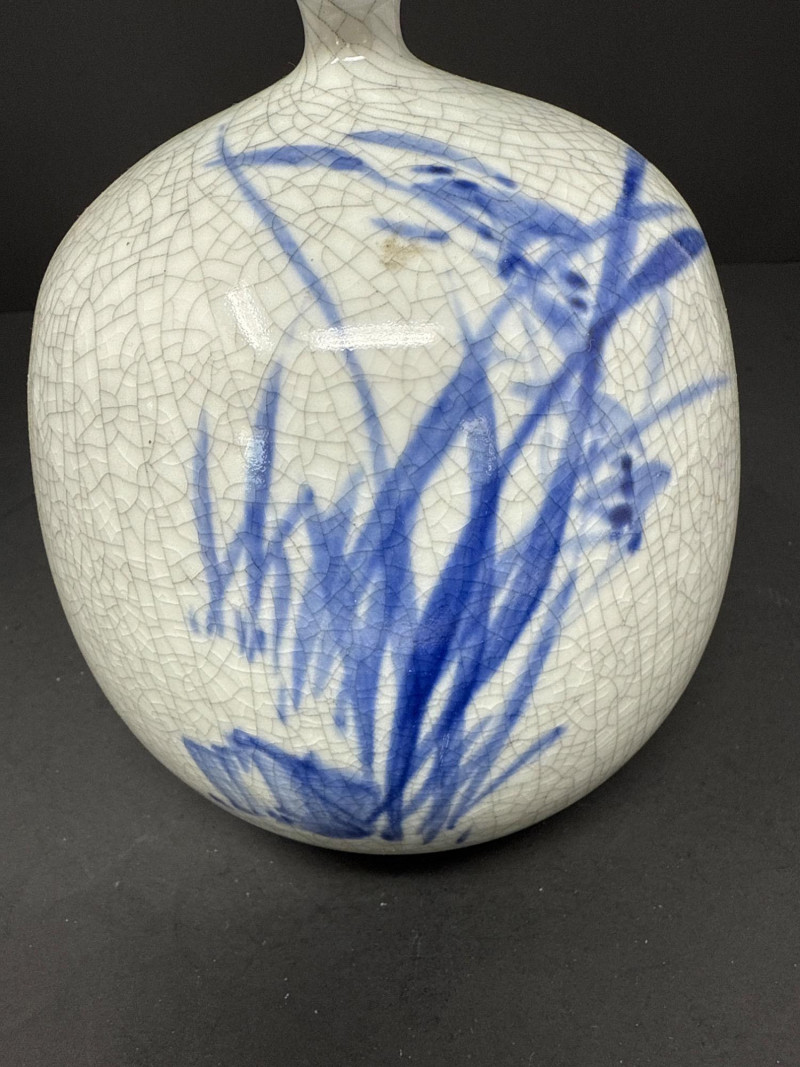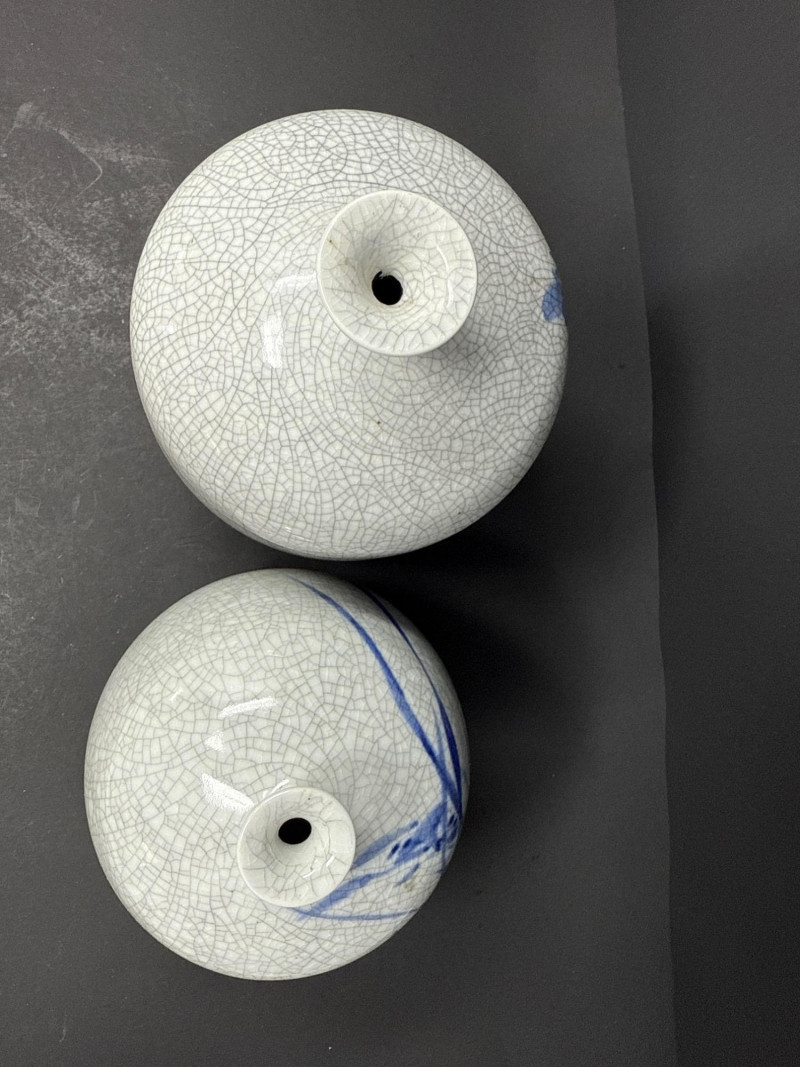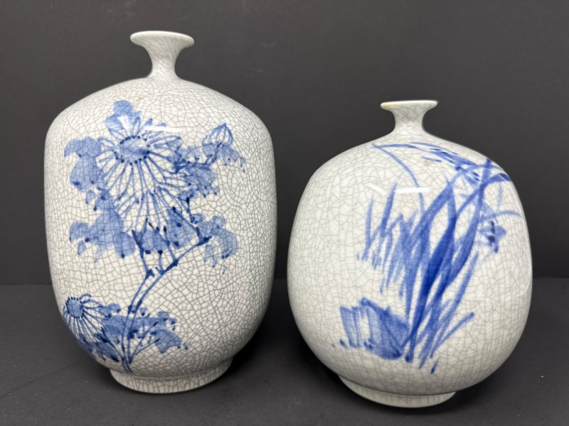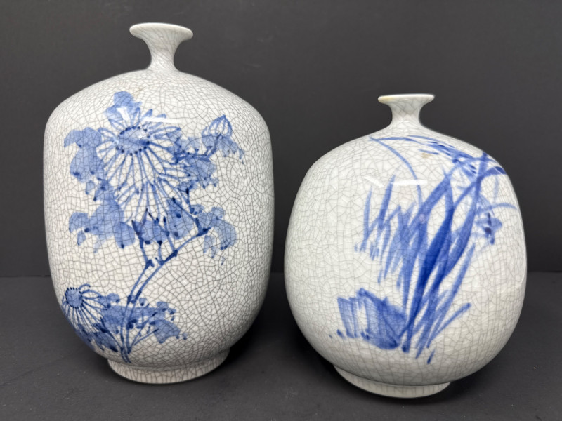 A charming pair of vintage ceramic sake vessels featuring a distressed crackle glaze and delicate hand-painted blue floral motifs. These pieces evoke a rustic elegance, ideal for collectors of Japanese ceramics or lovers of wabi-sabi aesthetics. Contents: 2 ceramic sake vessels Each with hand-painted blue floral designs Distressed crackle finish for vintage appeal Dimensions: Smaller vessel: 7.5" tall × 5" wide Larger vessel (approximate): 5" wide × 8.5" tall Condition: Vintage condition with intentional distressing Crackle finish is part of the design No chips or cracks noted
