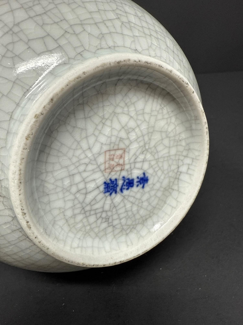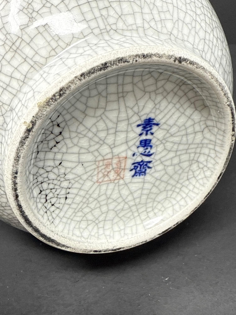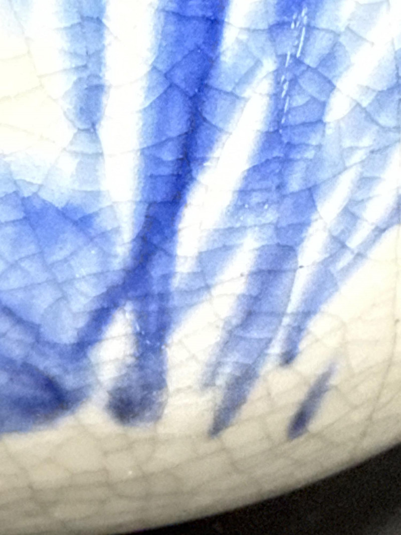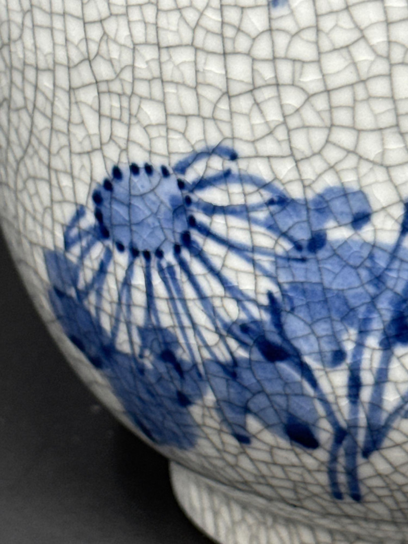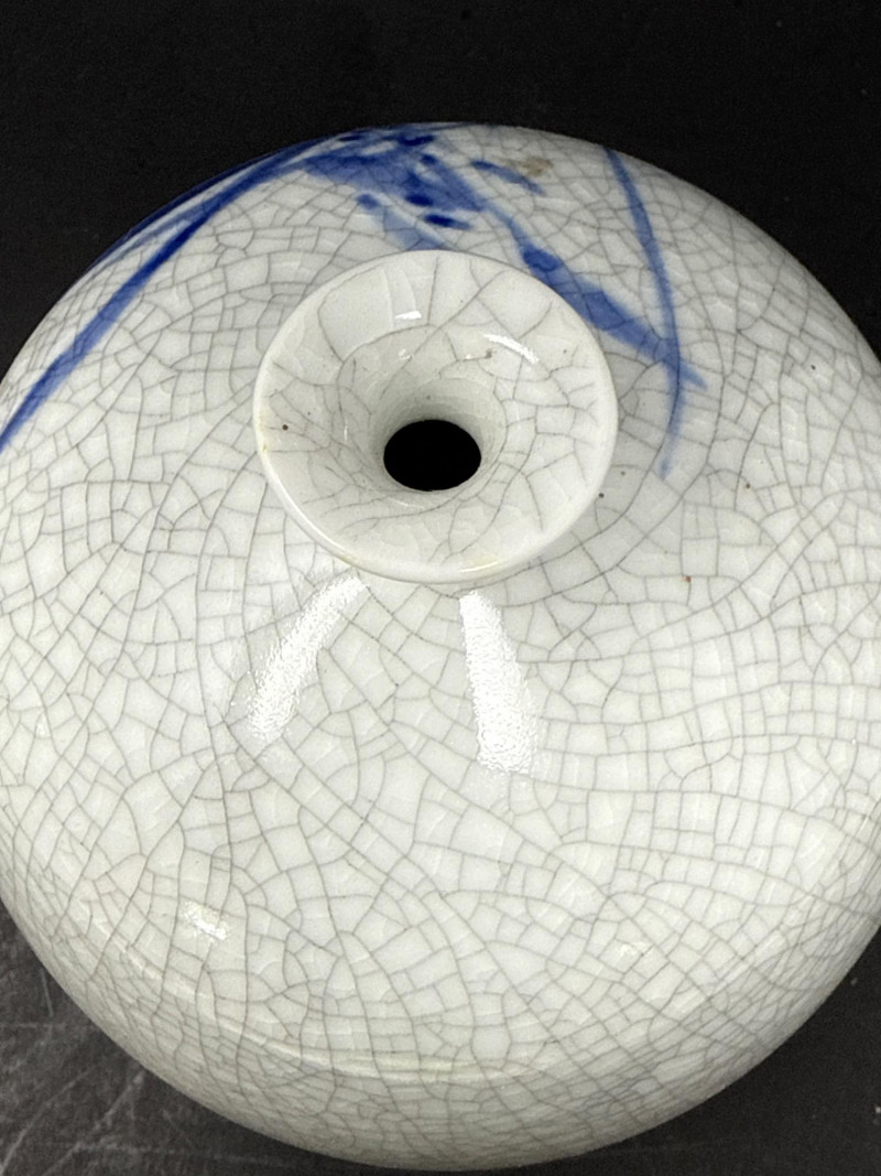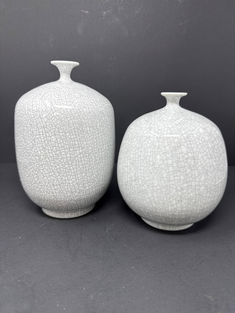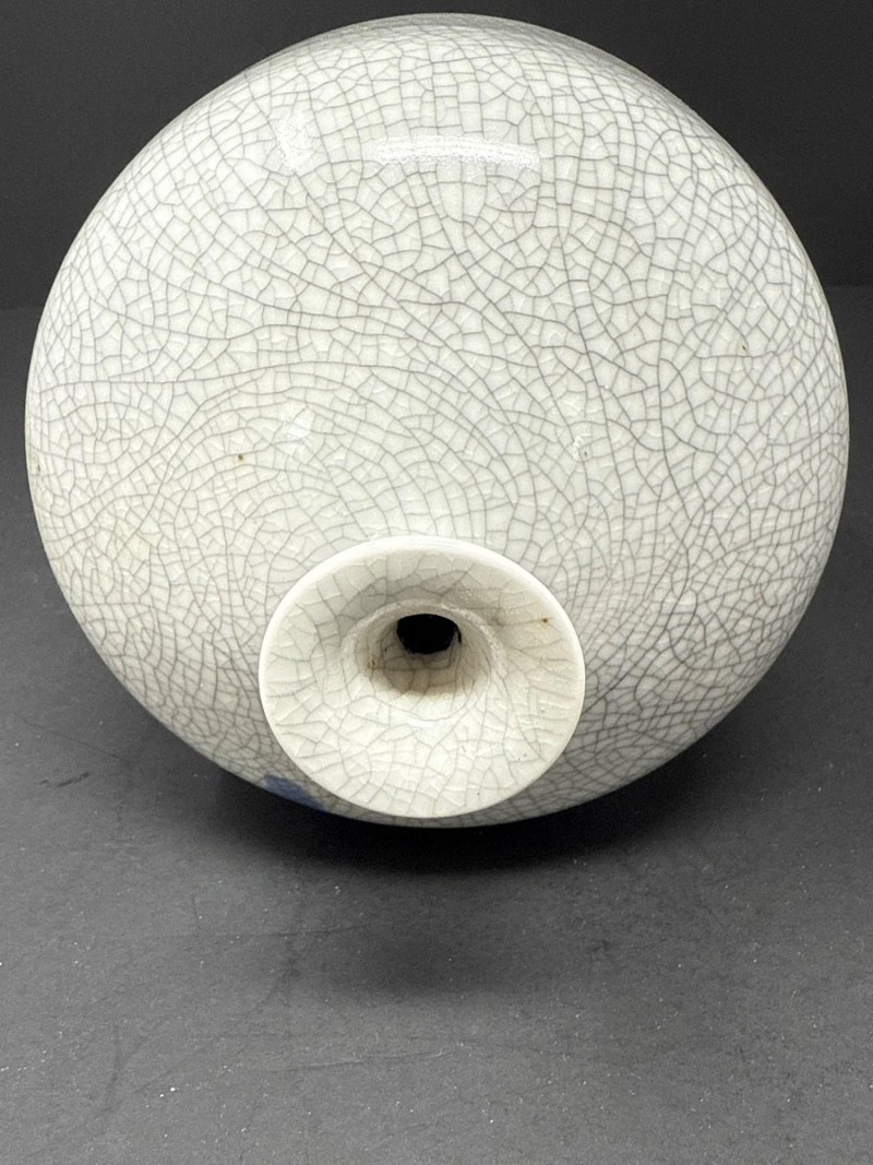A charming pair of vintage ceramic sake vessels featuring a distressed crackle glaze and delicate hand-painted blue floral motifs. These pieces evoke a rustic elegance, ideal for collectors of Japanese ceramics or lovers of wabi-sabi aesthetics. Contents: 2 ceramic sake vessels Each with hand-painted blue floral designs Distressed crackle finish for vintage appeal Dimensions: Smaller vessel: 7.5" tall × 5" wide Larger vessel (approximate): 5" wide × 8.5" tall Condition: Vintage condition with intentional distressing Crackle finish is part of the design No chips or cracks noted