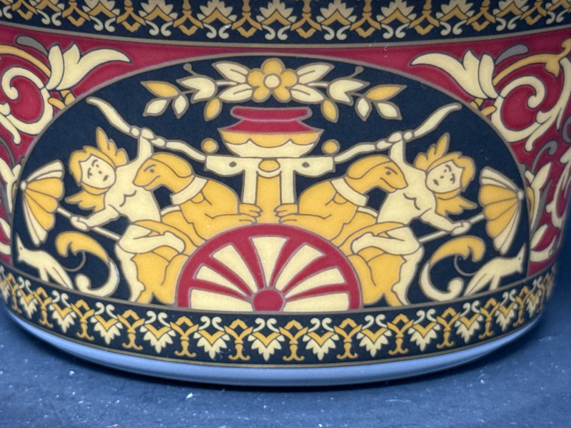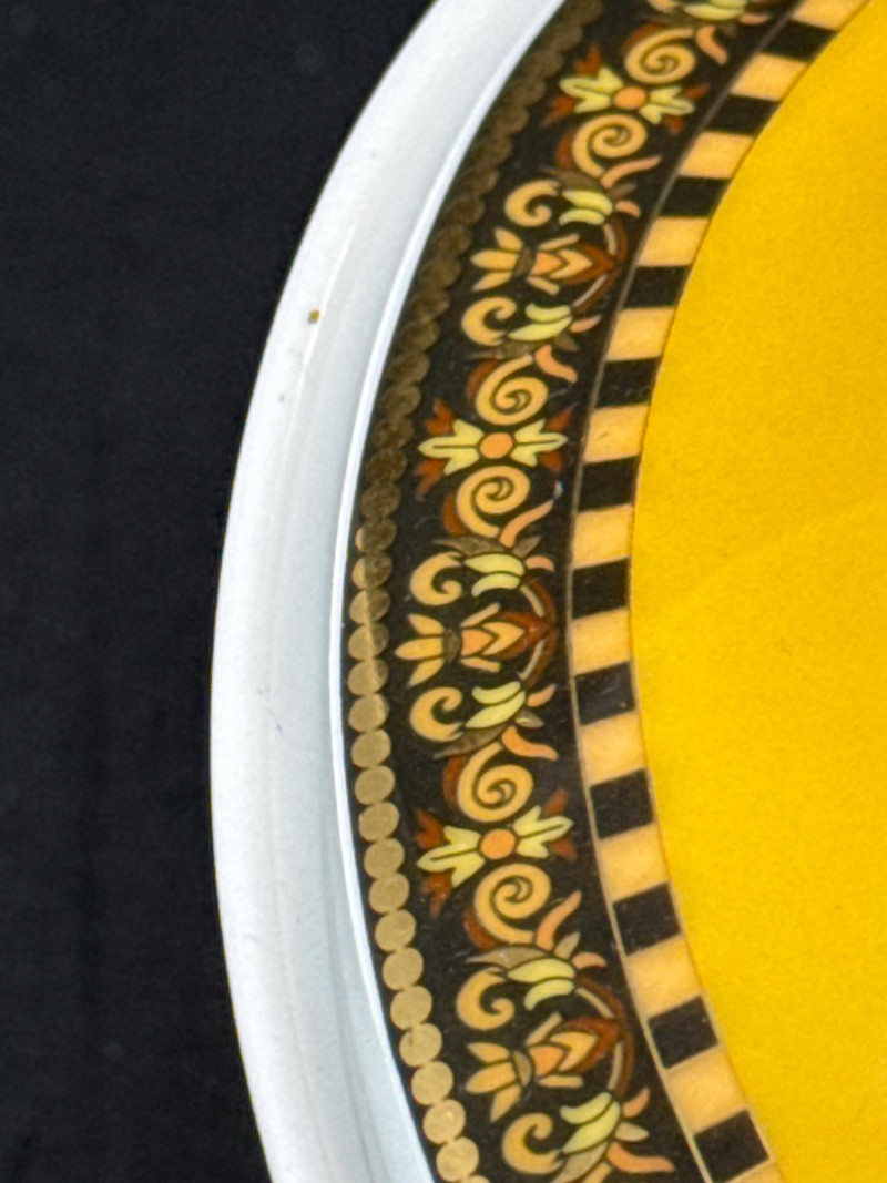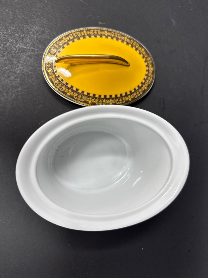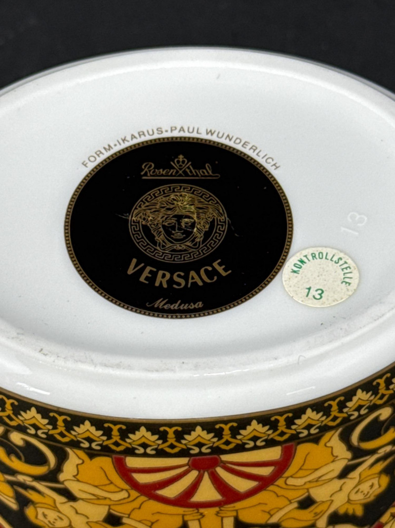 An elegant sugar dish from the iconic Versace Medusa collection, crafted in collaboration with Rosenthal. This piece showcases the luxurious design language of Versace, featuring the signature Medusa motif and intricate gold detailing. Brand: Versace Manufactured by Rosenthal Pattern: Medusa Classic Versace styling with opulent gold accents and baroque elements 1 sugar dish Dimensions: 5" L × 3" W × 4" H Condition: Appears to be in excellent condition based on listing status No visible damage or wear noted in the lot details Estimated Value: Typically ranges between $150–$250 on the secondary market, depending on condition and completeness