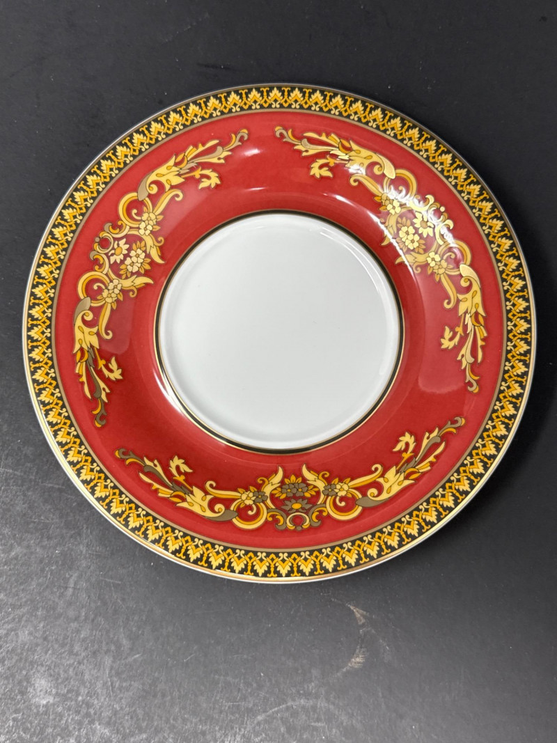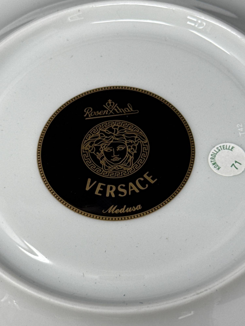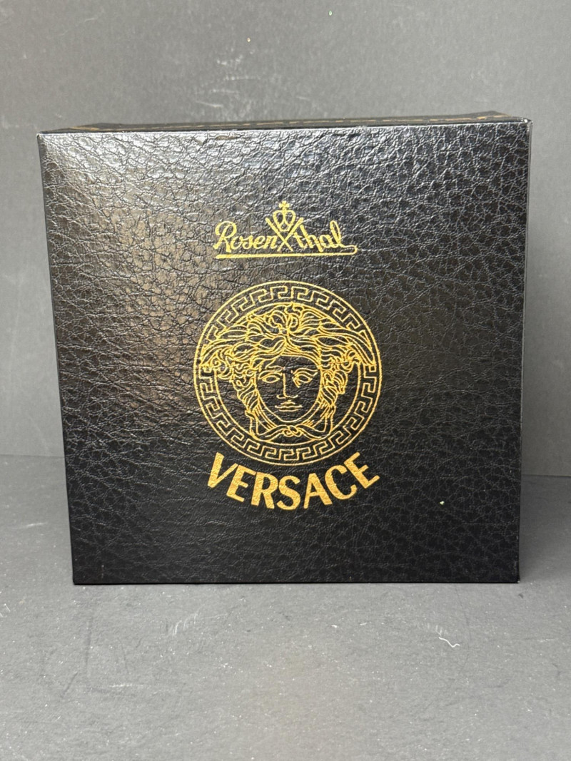 A refined addition for collectors of designer tableware or fans of Versace’s signature motifs. Ideal for display or upscale tea service. Brand Prestige: Versace tableware, especially in the Medusa style, is highly collectible and commands premium prices. Condition & Presentation: Includes original box, which enhances value for collectors and gift buyers. Comparable Sales: Similar teacup and saucer sets from Versace typically sell in the $175–$300 range depending on condition and completeness.Estimated Value: $150–$250