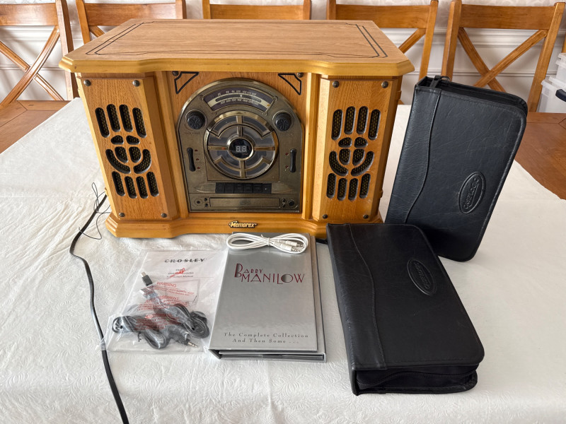 A charming blend of retro aesthetics and modern functionality, this Crosley stereo system evokes the golden age of home entertainment. Designed with a nostalgic flair, it features a wood-look cabinet and analog-style controls that recall mid-century audio consoles. Ideal for collectors, vintage enthusiasts, or anyone seeking a stylish accent piece with practical use. Brand Crosley – Renowned for its vintage-inspired electronics that combine classic design with contemporary technology. Features Multi-function stereo system with turntable, CD player, AM/FM radio, and auxiliary input Built-in speakers for full-range sound Classic rotary knobs and push-button controls Compact footprint suitable for tabletop or shelf display Contents Crosley stereo unit Assorted music CDs- Country, Pop, Folk, Western, Holiday, classical, classic oldies and more Condition Appears to be in good pre-owned condition with light surface wear consistent with age and use Was tested and sounded great Dimensions Length: 21.5 inches Width: 14 inches Height: 13 inches