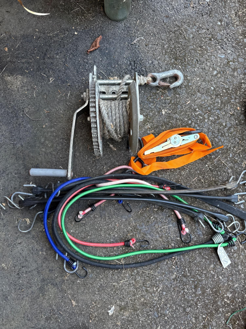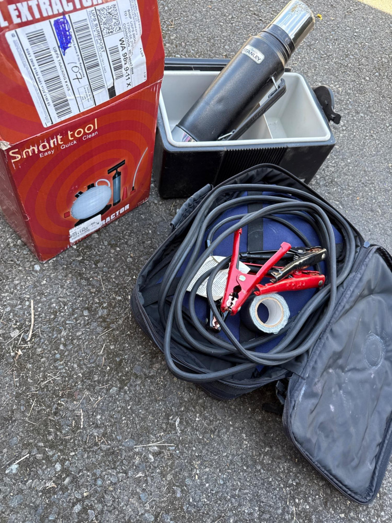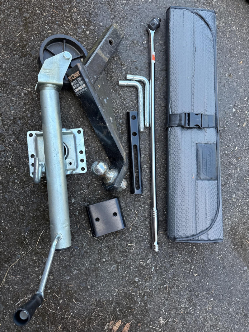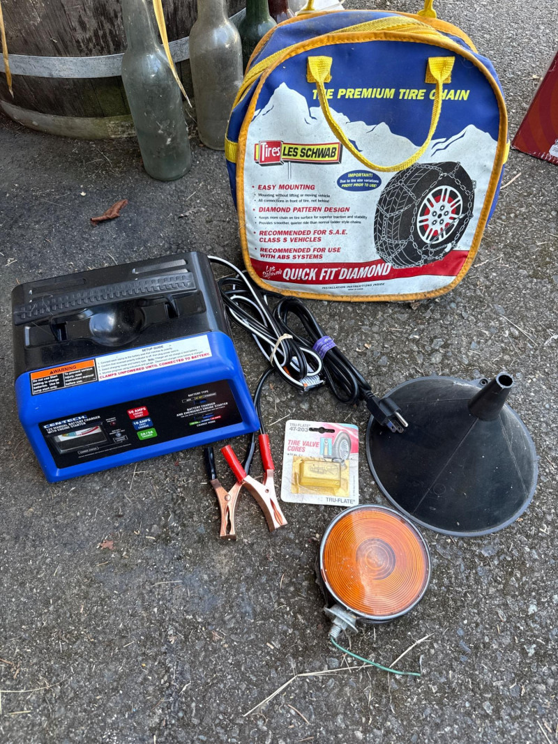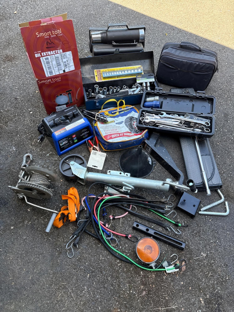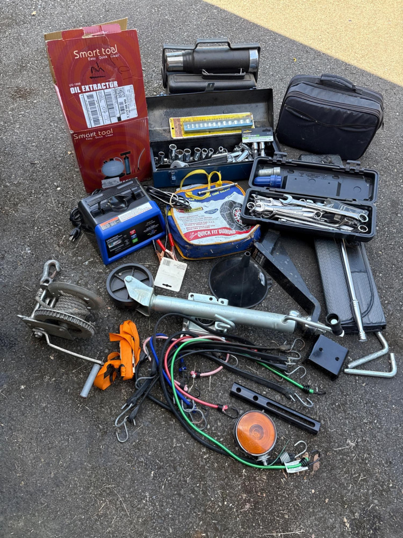 Contents Include: A selection of automotive tools and safety gear Items include jumper cables, tire inflators, tire chains, rope wench, bungee straps, extra trailer wheel mount-new, oil extractor tank-new, Curt hitch, Cooler and basic hand tools Brands: Condition: