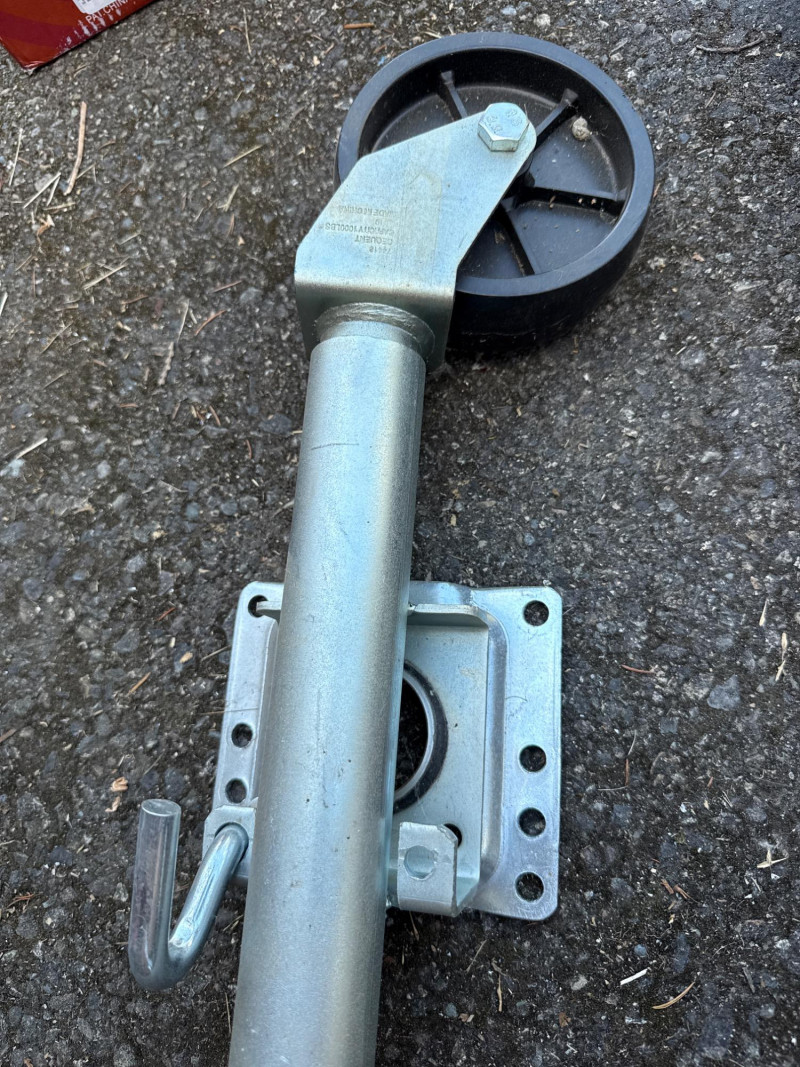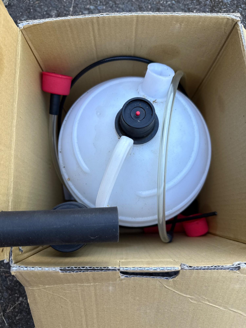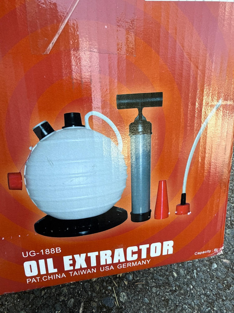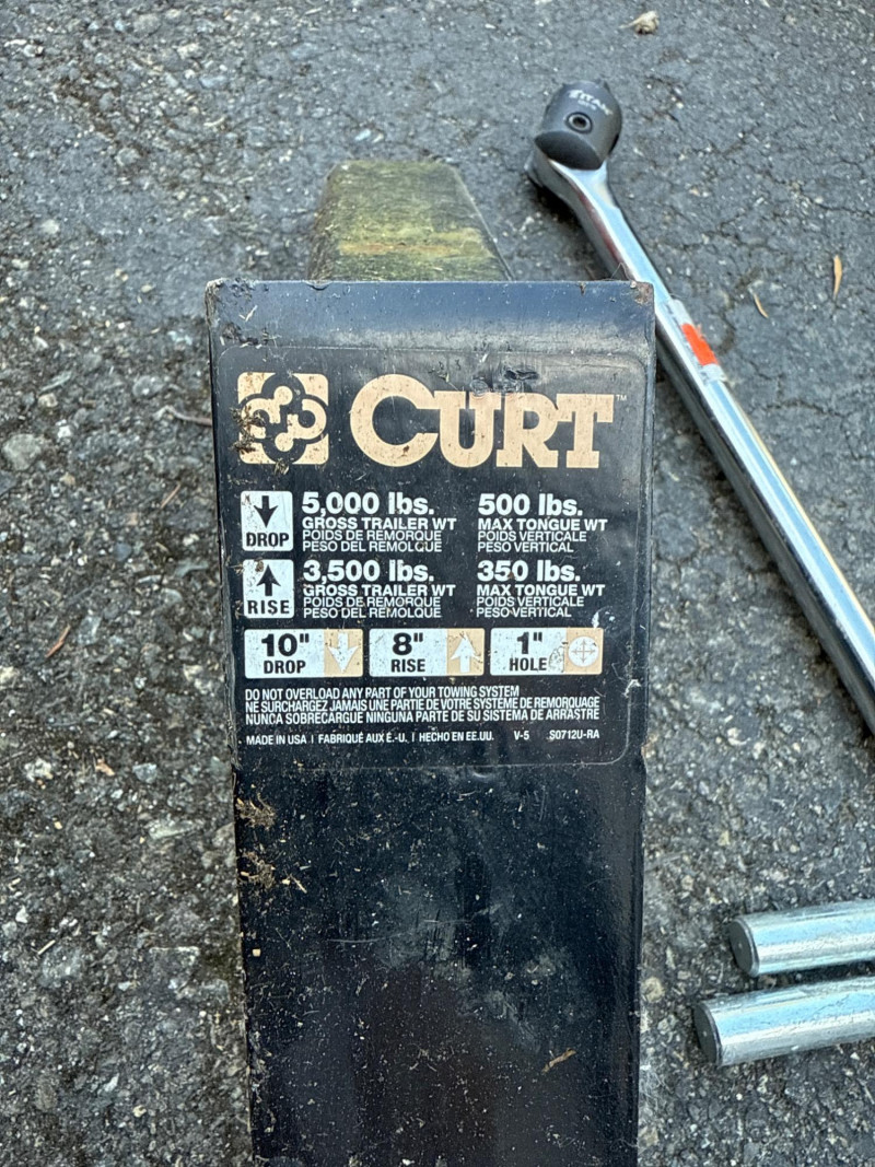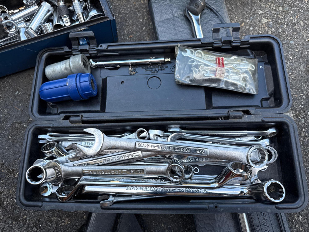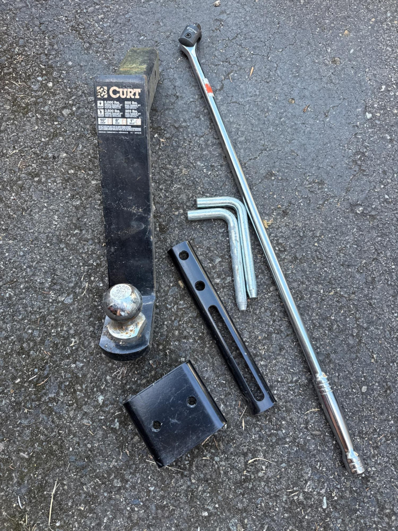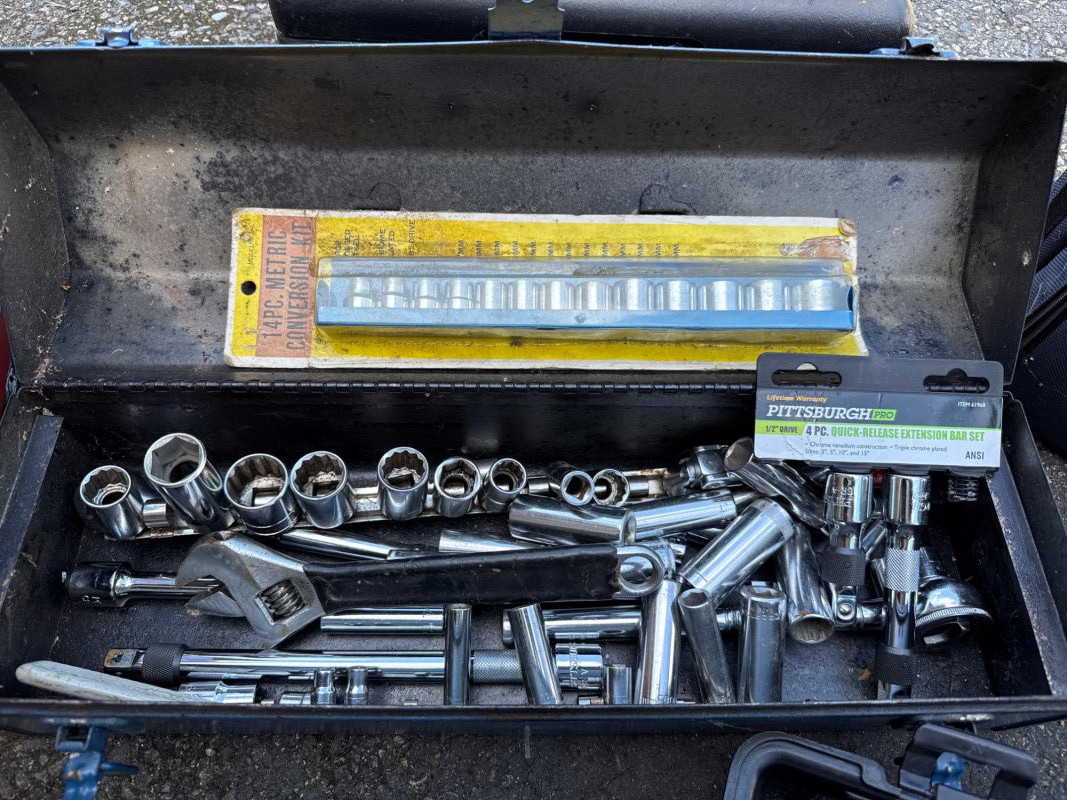 Contents Include: A selection of automotive tools and safety gear Items include jumper cables, tire inflators, tire chains, rope wench, bungee straps, extra trailer wheel mount-new, oil extractor tank-new, Curt hitch, Cooler and basic hand tools Brands: Condition: