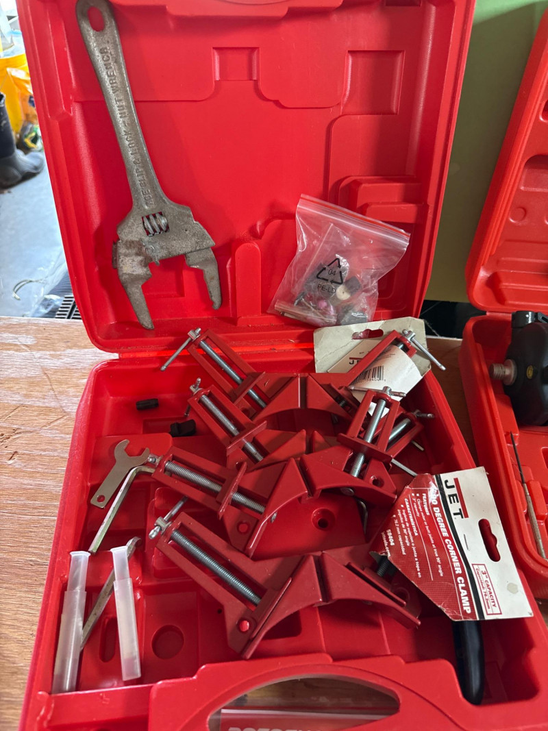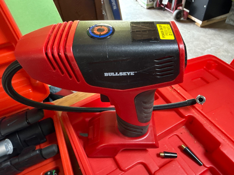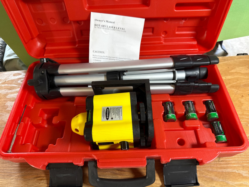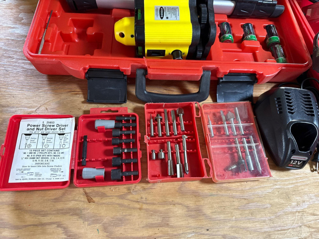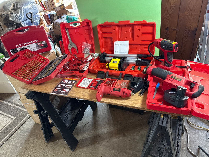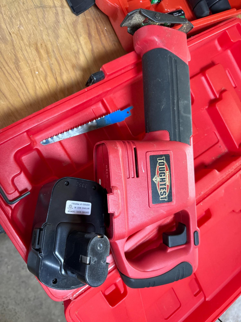 A compact set of Handy Touchtest tools and accessories, ideal for electrical diagnostics or workshop use. Category: Tools/Industrial Includes: Handy Touchtest cordless tools and gadgets, Recipricating saw, air pump, cut-out tool, corner clamp set, large drill bit set, NEW rotary laser level with tripod. Condition: New/Used. Another battery and charger found and powered up. Sold as-is. One hard case had components and manual, but tool not found yet(Rotoshovel), Still searching