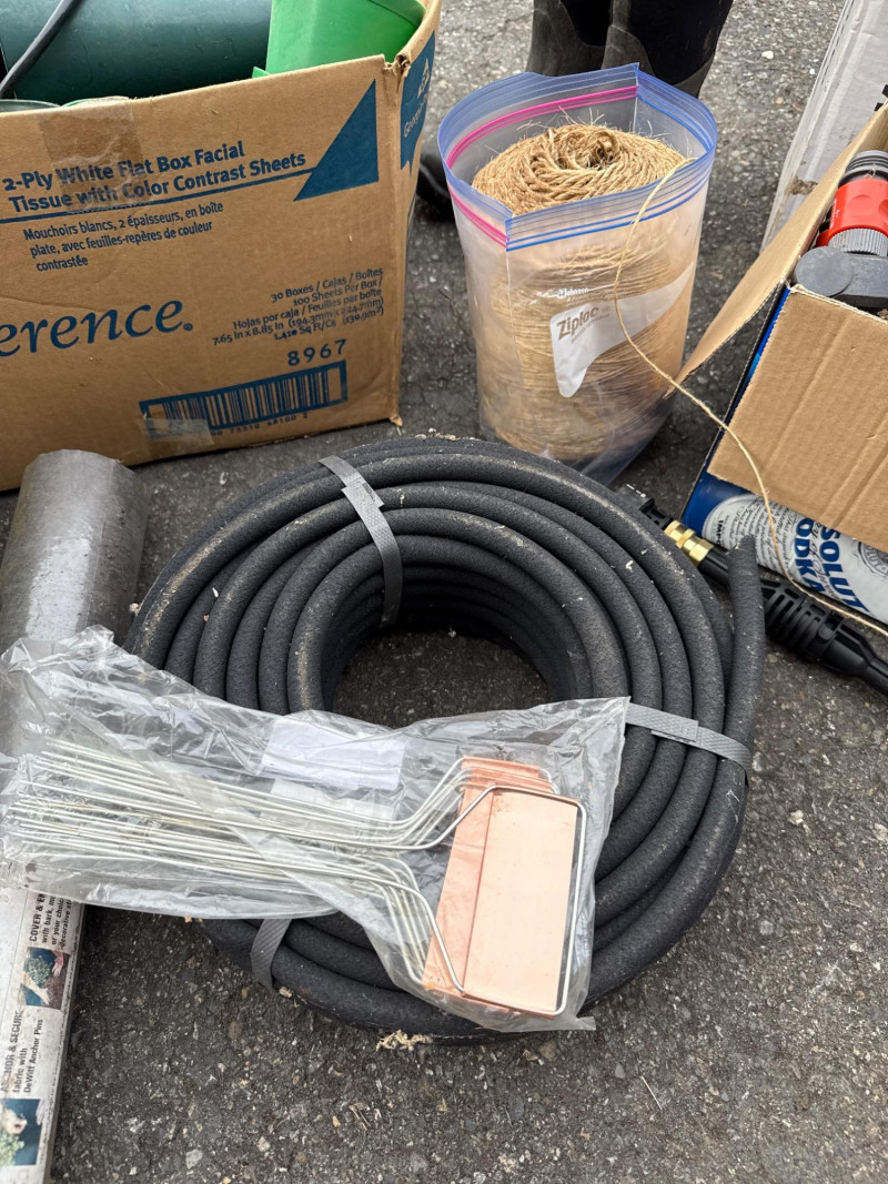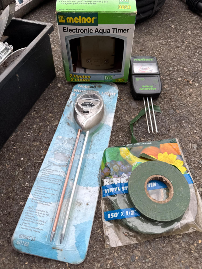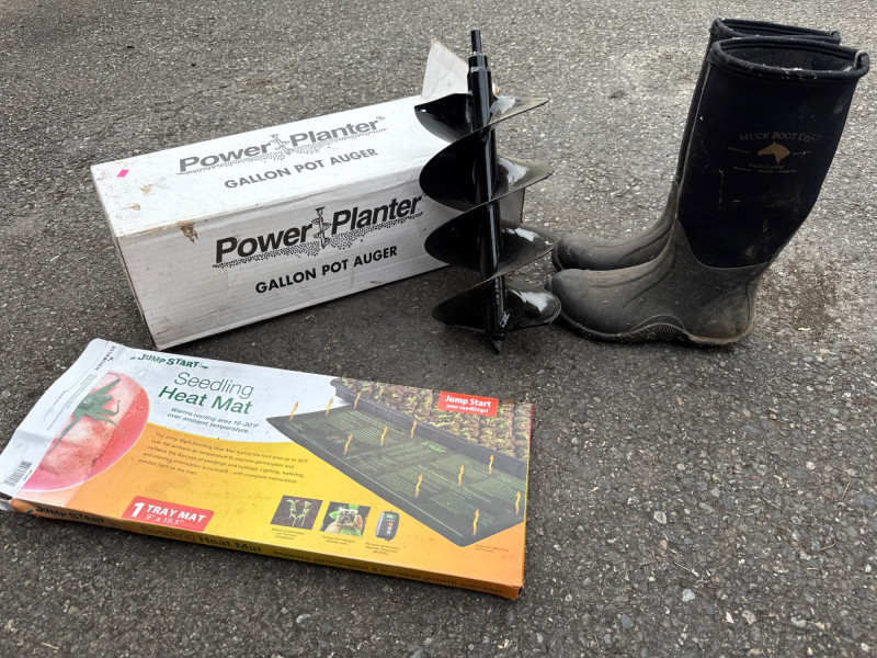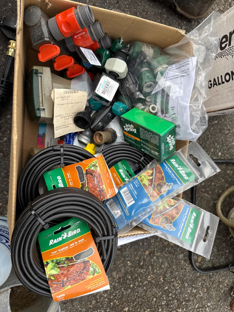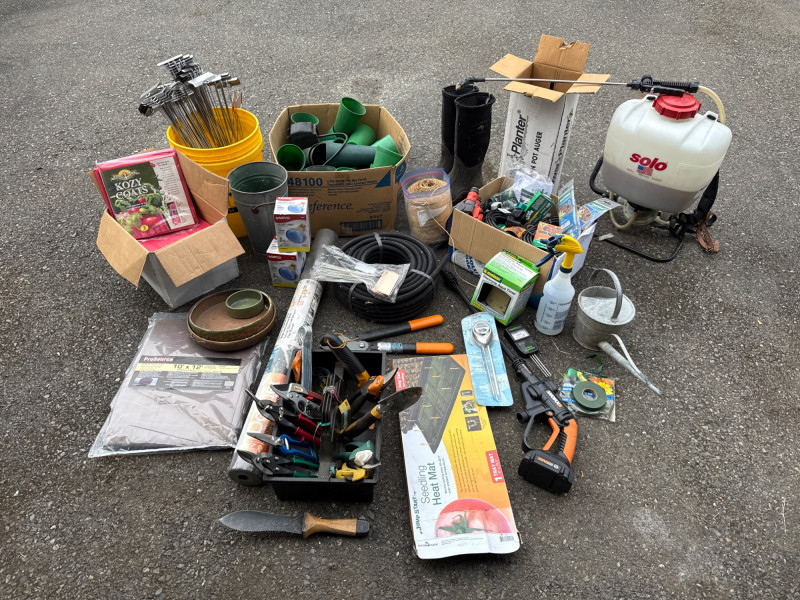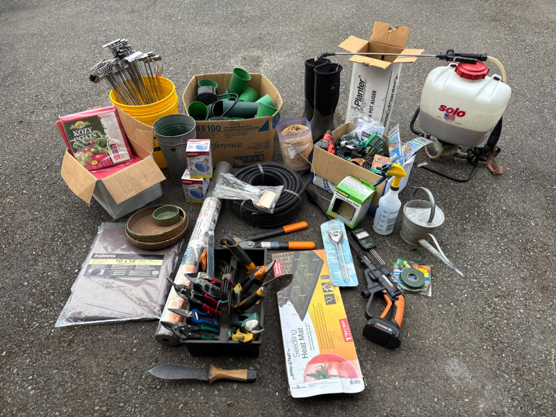 A versatile bundle of outdoor essentials, perfect for gardeners, landscapers, or DIY yard warriors. This lot includes a Solo sprayer, hand tools, auger, and assorted irrigation components—ready to tackle seasonal prep or weekend projects. Category: Outdoor Items Includes: Solo sprayer (pump-action) Contents unknown Garden hand tools (trowels, pruners, clippers etc.) Auger (drill-compatible) NIB Irrigation parts (hoses, fittings, and drip components)