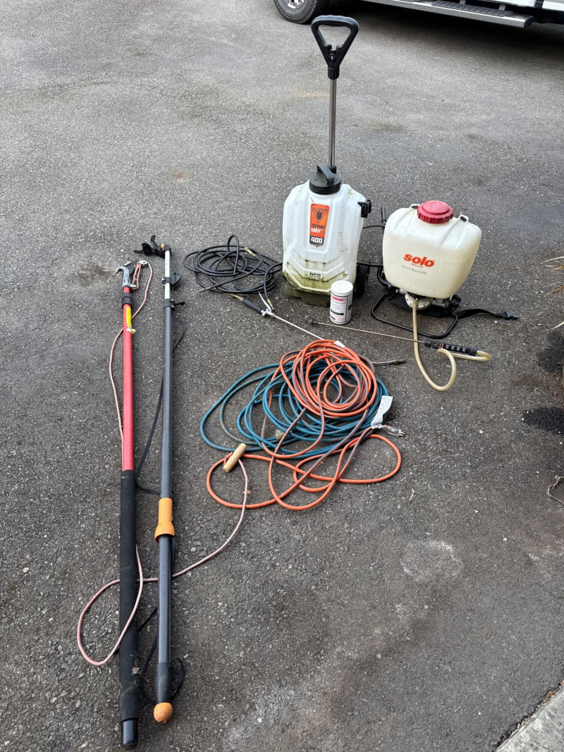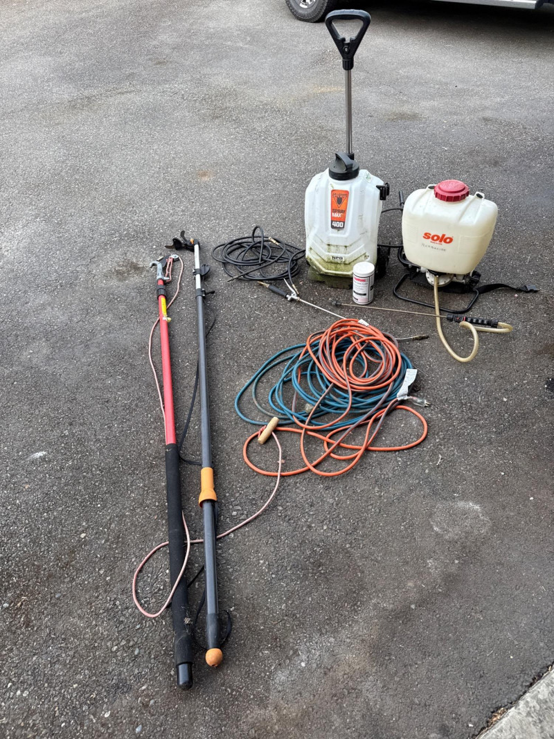 A practical outdoor utility bundle featuring two sprayers, power cords, and limb cutters—ideal for garden maintenance, landscaping, or DIY yard work. Category: Outdoor Items Includes: Spray Max 400 sprayer (model details TBD) Spray tank cleaning agent bottle Solo sprayer (likely manual or backpack style) Assorted power cords Limb cutters (manual pruners or loppers) Fiskers