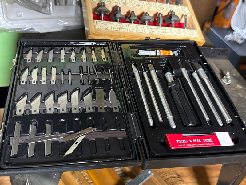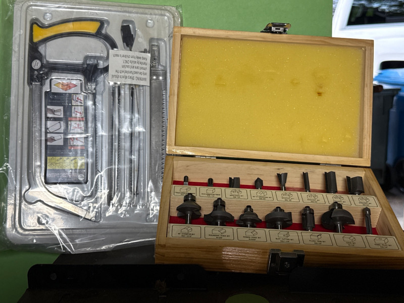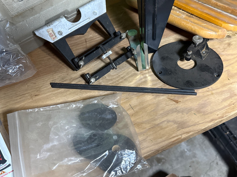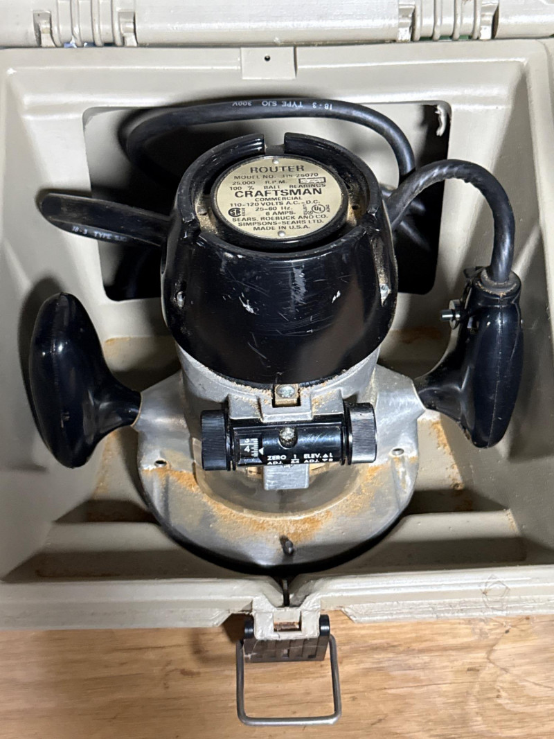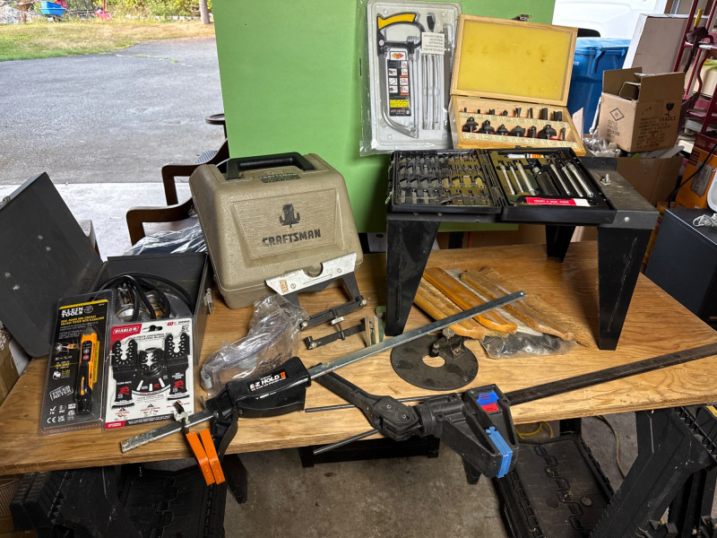A rugged trio of vintage workshop staples, including a Craftsman router, a Sears-branded Skil saw, and assorted shop gadgets. These tools reflect decades of dependable service and classic American craftsmanship. Category: Tools/Industrial Includes: Craftsman router-powered up Sears Skil saw (Electric)-powered up Assorted shop gadgets, router table, Exacto precision blade set, router bits and NIB gadgets