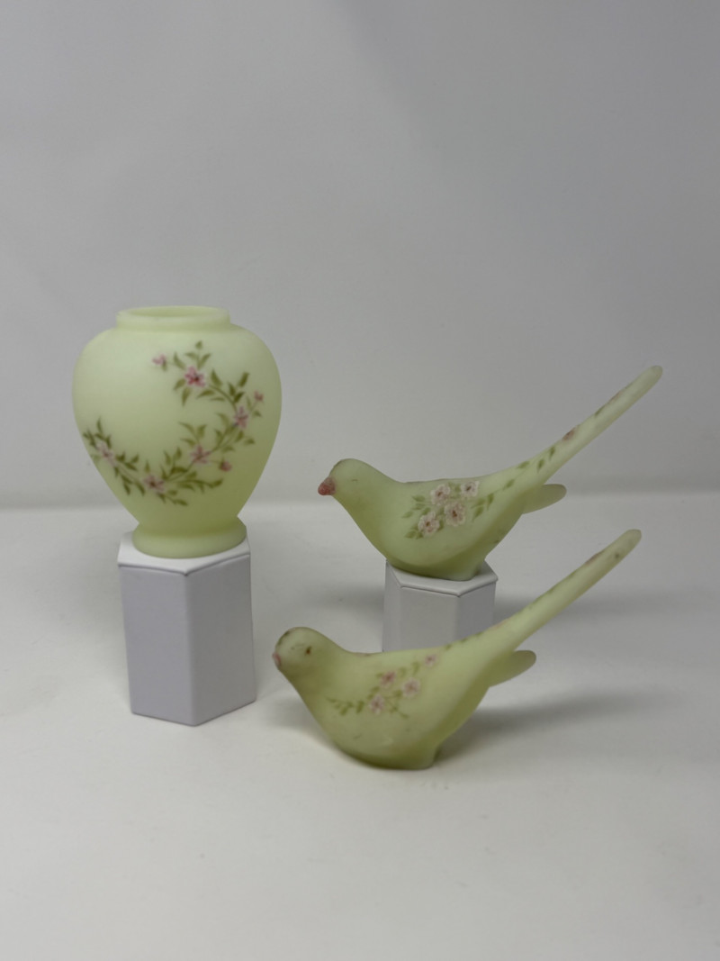 Hand-Painted Fenton Satin Glass Bird Figurines & Vase Set Charming three-piece set of Fenton satin glass, featuring two hand-painted bird figurines and a matching floral vase. Each piece showcases delicate pink blossoms and green foliage, beautifully detailed in traditional Fenton style. The soft satin glass finish adds a vintage elegance, making this a lovely addition to any glass or collectible display. All pieces are in excellent condition. Measurement's: Vase measures 5"H x 4"W Birds measure 5"H at tail