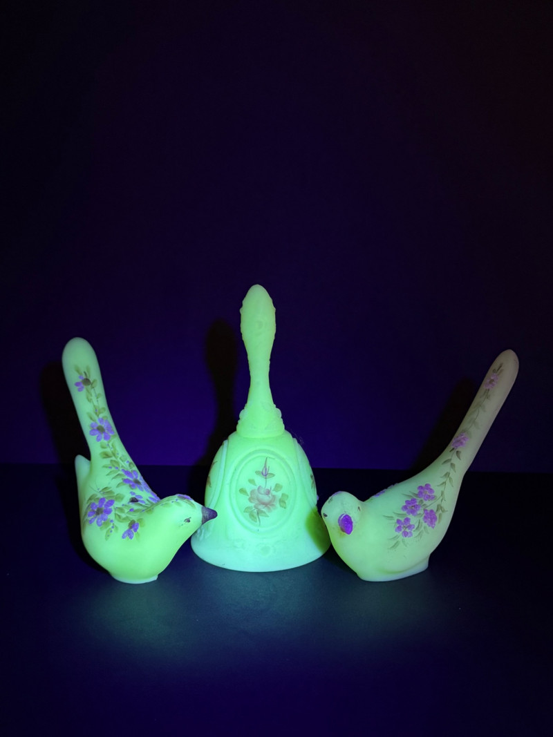 A lovely collectible set for fans of uranium glass, Fenton birds, or vintage hand-painted decor.