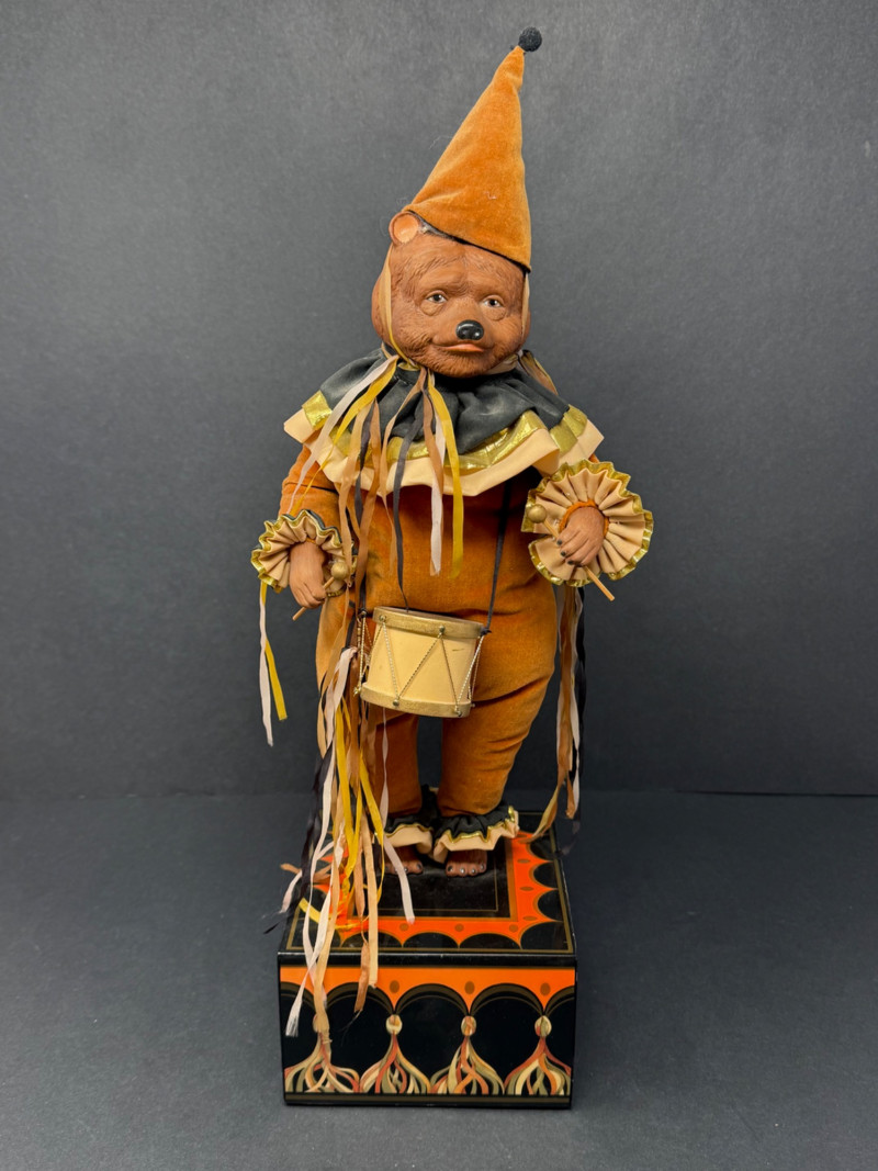 Enesco "Drummer Bear Faith" – Limited Edition Vintage Figurine This rare and highly collectible limited edition figurine from Enesco features the charming "Drummer Bear Faith," dressed in a whimsical velvet clown costume with golden trim and ribbon details. Standing on an ornate hand-painted base in bold orange and black tones, this bear holds a miniature drum, evoking the nostalgic charm of vintage circus and holiday displays. Brand: Enesco Title: Drummer Bear "Faith" Type: Limited Edition Figurine Era: Likely 1980s–1990s Materials: Mixed media – velvet, papier-mâché, wood, ribbon Dimensions: Approx. 16" H x 6.5" W x 6.5" D Condition: Excellent vintage condition This piece is part of a limited Enesco series that captured the spirit of collectible storytelling figures in the late 20th century. Highly sought after by collectors for its detail, quality, and rarity, “Drummer Bear Faith” makes a striking and sentimental addition to any vintage holiday, bear, or folk art collection.