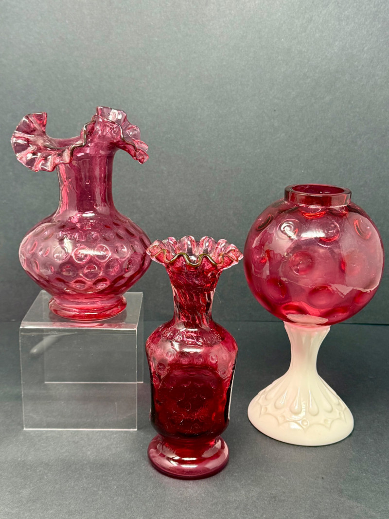 Fenton Cranberry Opalescent Hobnail Glass Collection – Set of 3 This beautiful trio of Fenton cranberry art glass showcases the brand’s iconic craftsmanship in vibrant opalescent hues and hobnail textures. The set includes two ruffled vases and one pedestal rose bowl-style piece. Brand: Fenton Color: Cranberry Red with Opalescent Accents Pattern: Hobnail Quantity: Set of 3 Heights: Approx. 6"–8" each These timeless pieces are perfect for collectors or for adding vintage charm to your home décor.