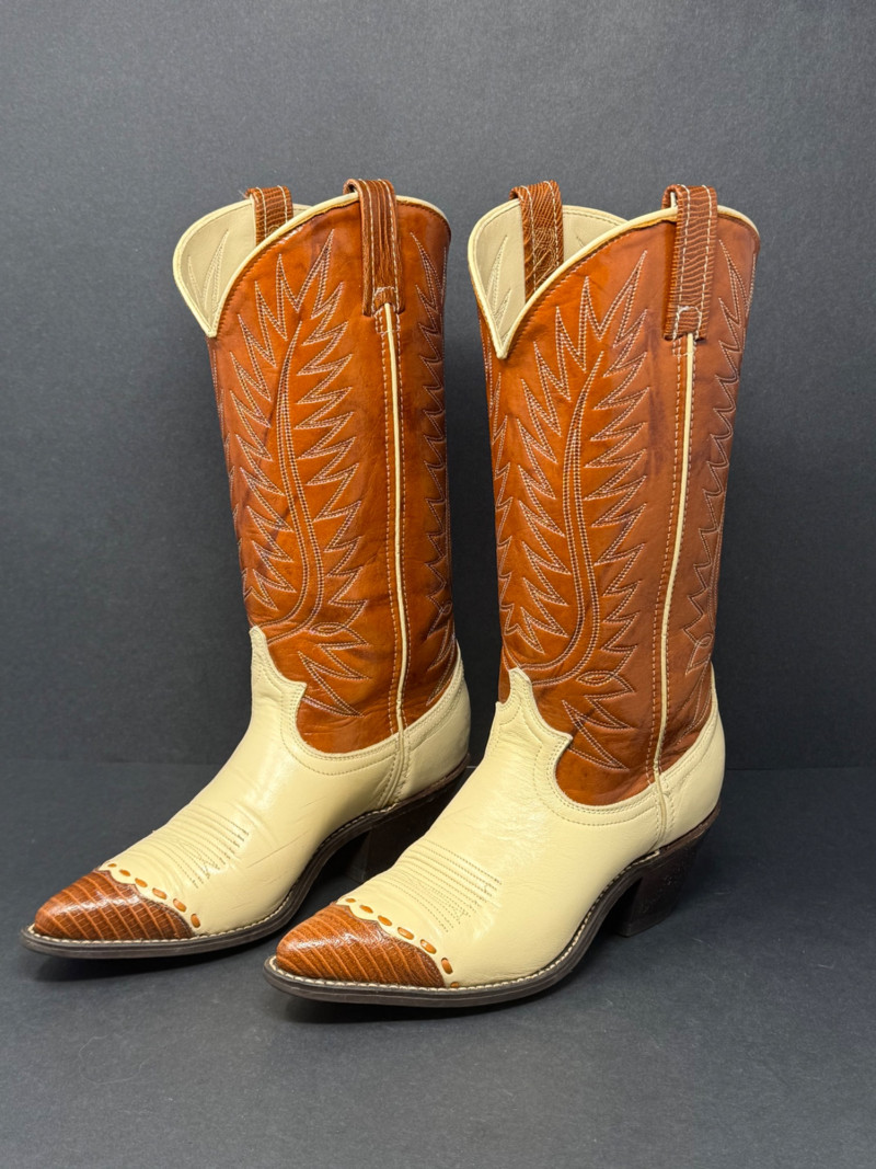 Authentic 1980s Acme cowboy boots in a standout cream and cognac leather combo. The boots feature classic Western stitching, pointed toes, and sturdy heels – perfect for adding vintage flair to your everyday look or collection. Brand: Acme Era: 1980s Material: Genuine leather Color: Cream & cognac Toe: Pointed Heel Height: Approx. 1.75"–2" Shaft Height: Approx. 12" Size: 8W Condition: Excellent vintage condition - original box Whether you're two-stepping or styling a statement outfit, these Acme boots are the real deal.Vintage Acme Two-Tone Western Cowboy Boots – Cream & Cognac Leather (1980s)