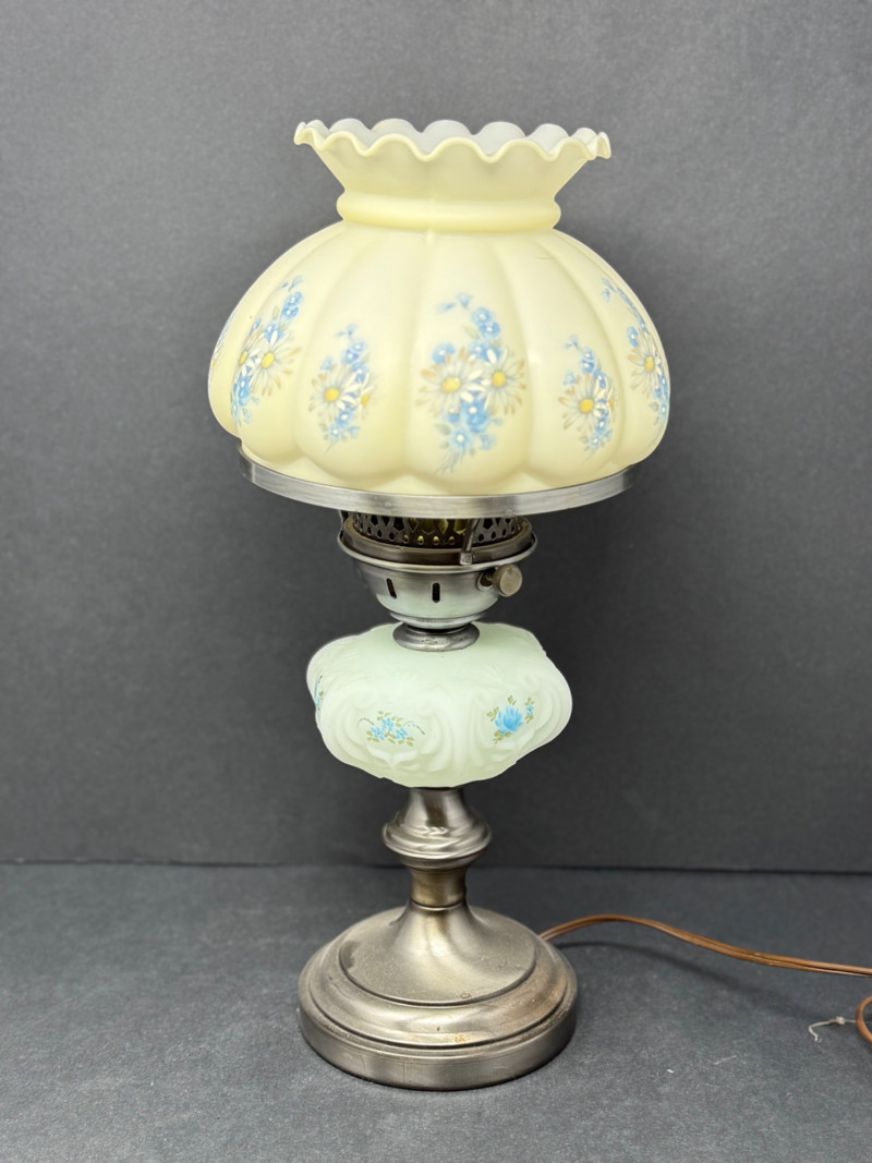 Charming vintage electric hurricane-style table lamp featuring hand-painted blue and yellow floral motifs on frosted glass. The milk glass shade has a scalloped ruffle edge, paired with a brushed metal base. Era: Circa 1960s–1970s Style: Cottagecore / Shabby Chic / Country Vintage Condition: Great working condition with light patina on the metal base. No chips or cracks in the glass. Size: Approx. 17" H x 8"W Perfect for a bedside table, reading nook, or farmhouse-inspired space.Vintage Floral Glass Hurricane Lamp – Electric – 1960s/70s