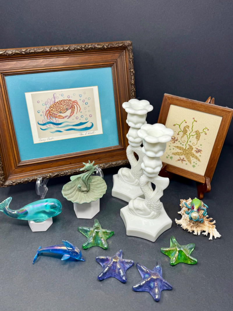 A beautifully curated bundle of seaside charm perfect for a coastal gallery wall, beach cottage, or vintage-inspired shelf styling. Includes: Framed Crab Art Print signed by the artist (Tina B. Wills) – whimsical and colorful Framed Flamingo Cross-Stitch in a wood frame – hand-stitched and sweetly nostalgic Pair of White Milk Glass Dolphin Candle Holders – striking and sculptural Green Sea Shell with Metal Seahorse Figurine Glass Sea Creatures – includes two dolphins, a Fenton whale (rare), and five hand-blown glass starfish in varying hues of green, blue, and purple Whimsical Shell Crab Figurine – playful and detailed with faux gems Era: Mostly vintage, ranging from mid-century to 1990 Condition: All pieces in excellent vintage condition Style: Coastal, nautical, cottagecore, eclectic This set brings a touch of under-the-sea magic and vintage charm to any space. Style together or sprinkle across your home for a cohesive beachy vibe.Coastal Cottagecore Decor Lot – Art, Milk Glass, & Ocean-Inspired Accents